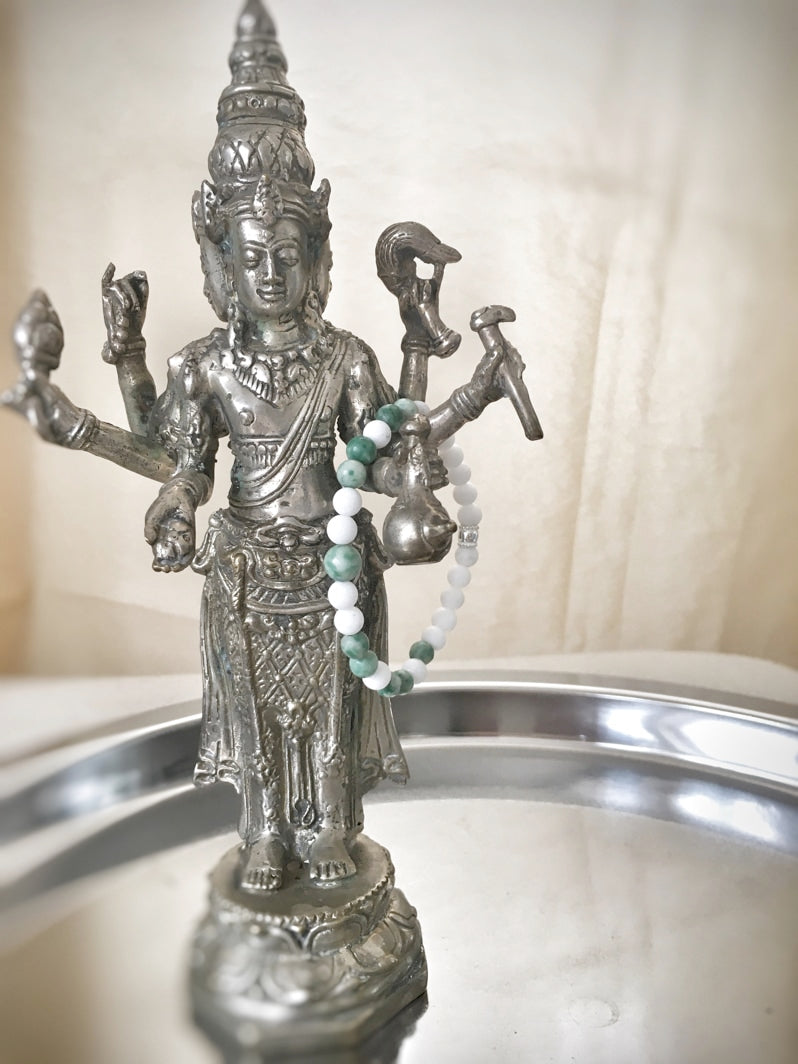 Perlen: Weiße matte Jade-Perlen, 6mm mit grünen Jaspis-Perlen und Echt-Silber-Kaschierperle