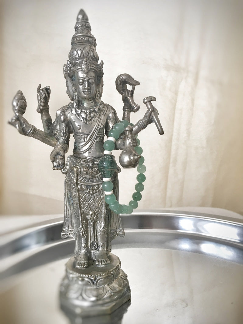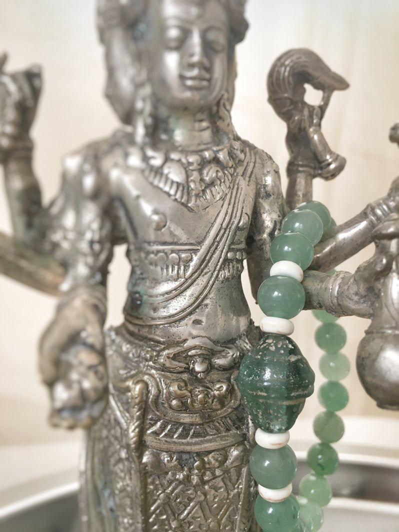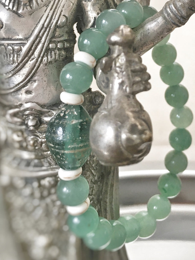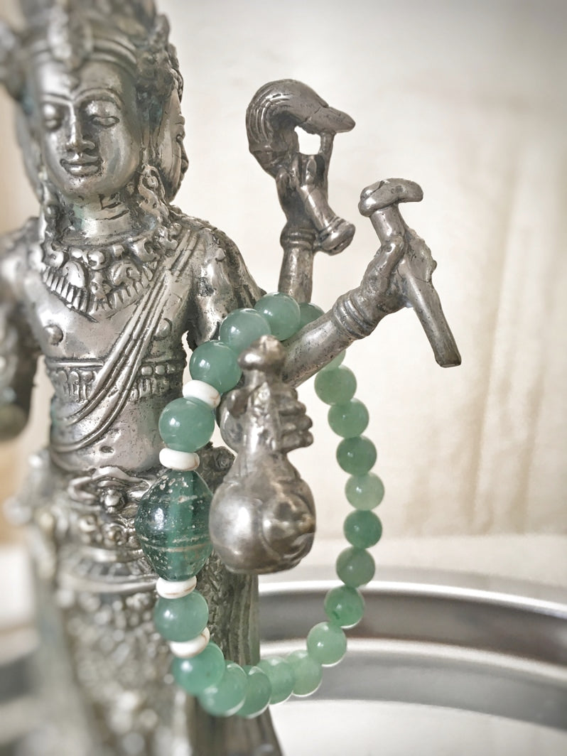 Perlen: Grüner Aventurin, 8mm, mit weißen Türkisscheiben und ausgefallener indonesischer Glasperle als Eye-Catcher