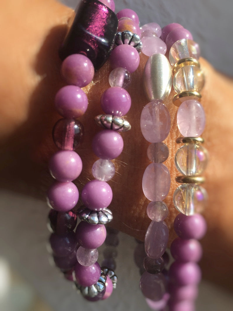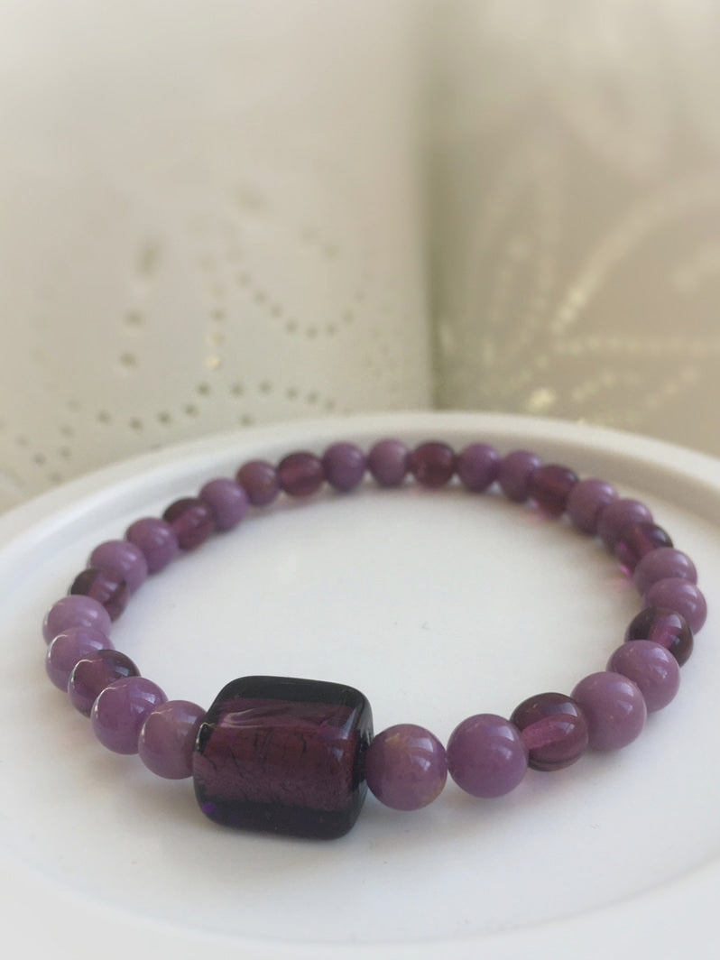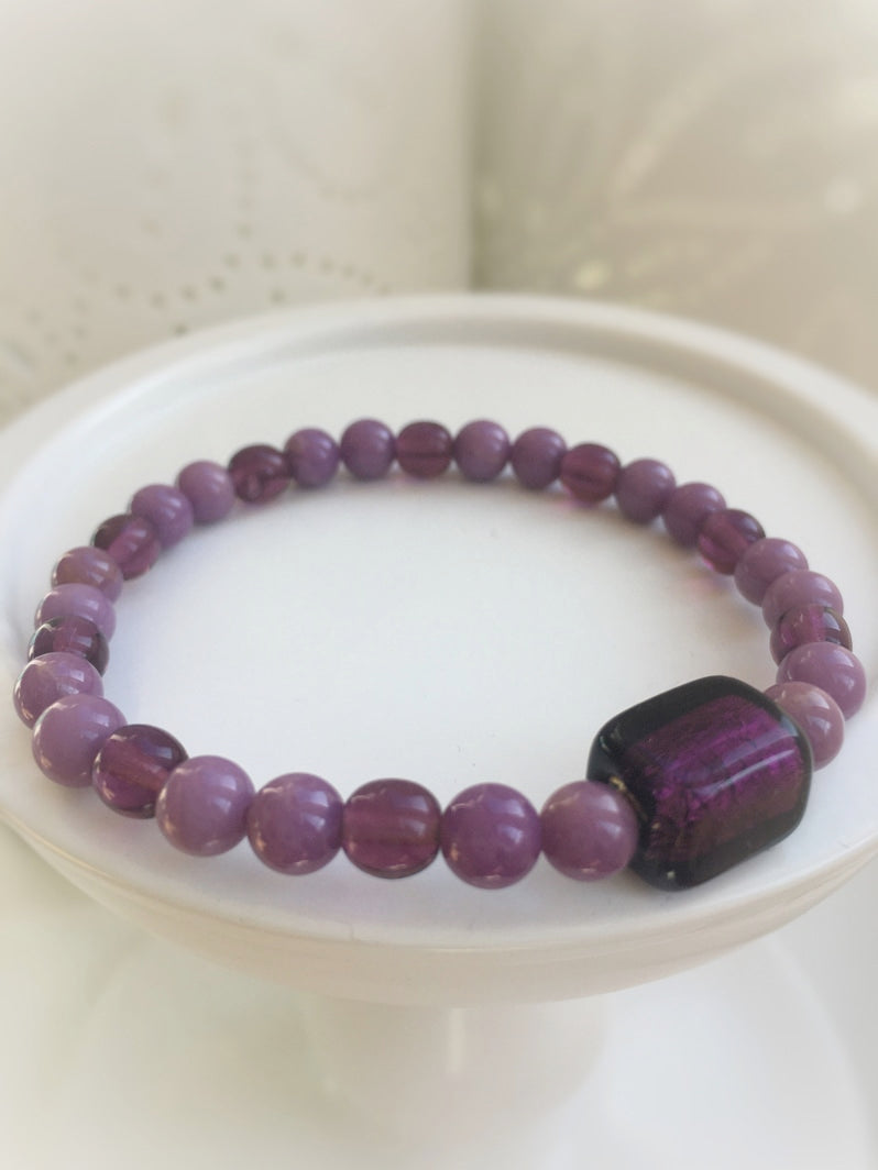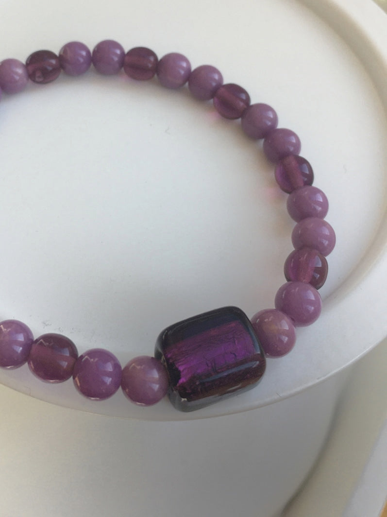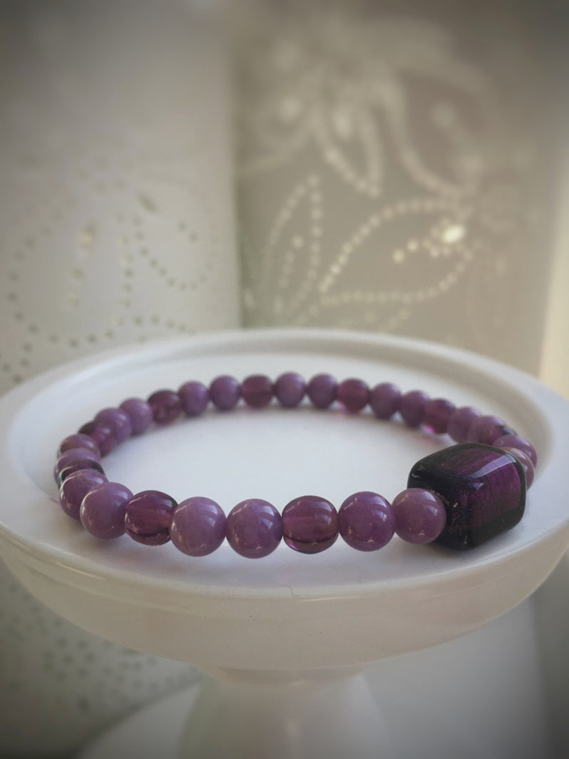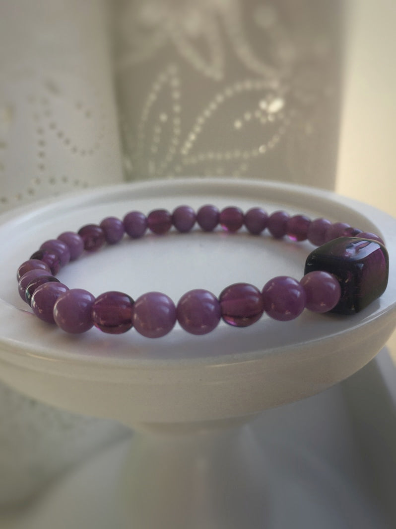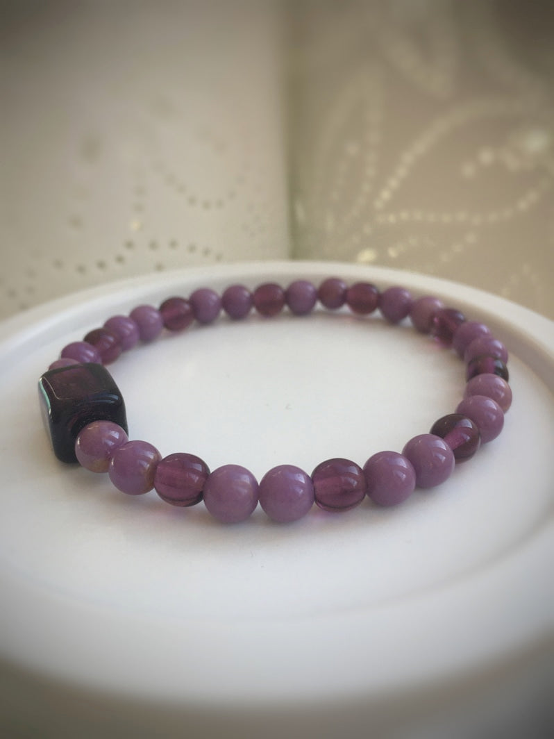 Perlen: Seltener Phosphosiderit 6mm, böhmische lilafarbene Glasperlen 6mm, quaderförmige Glasfolien-Perle
