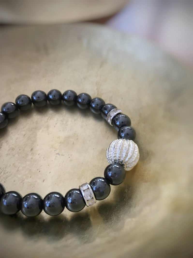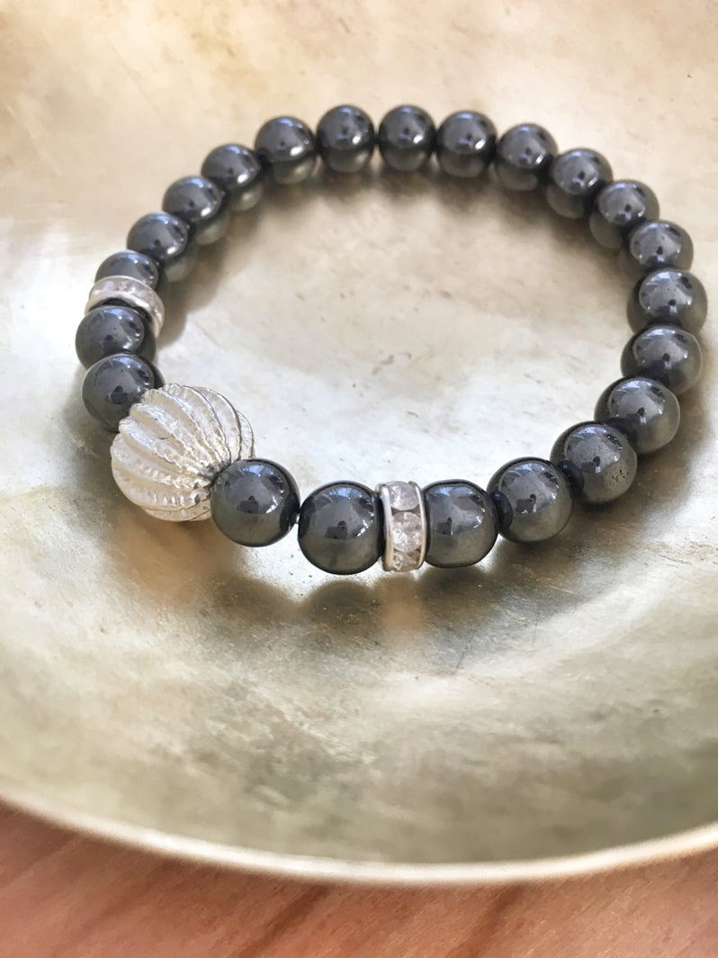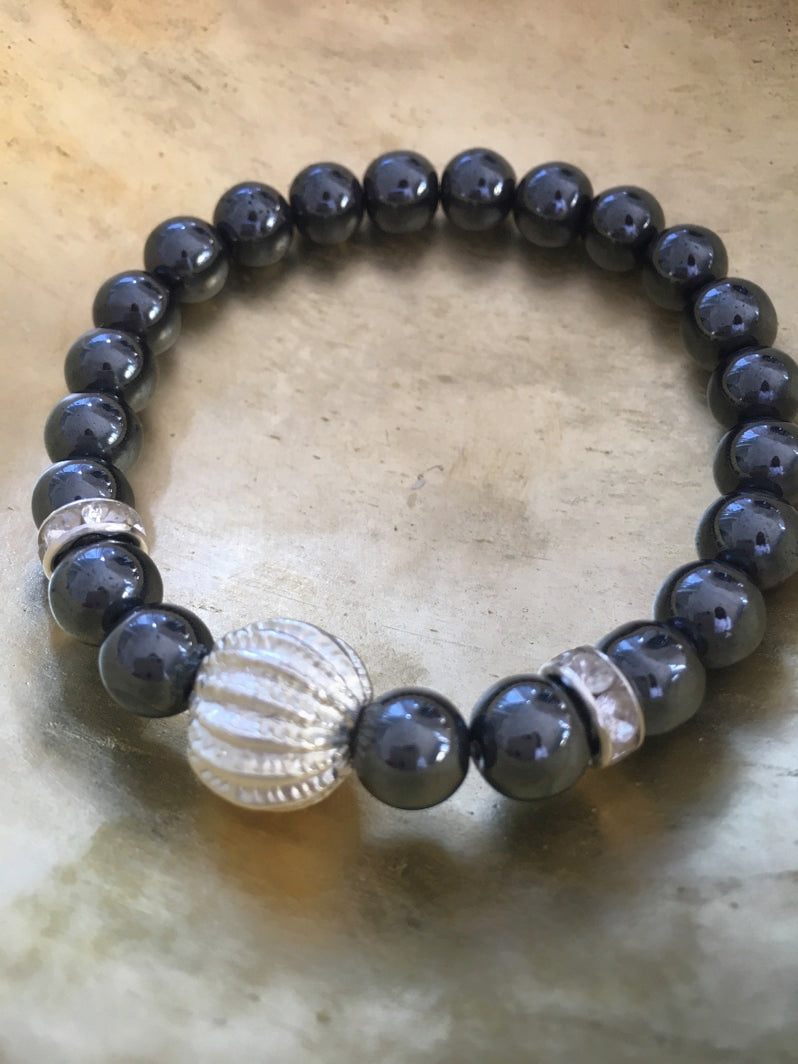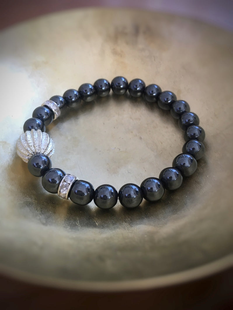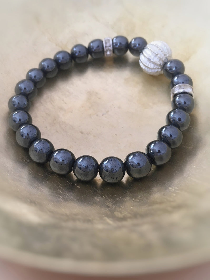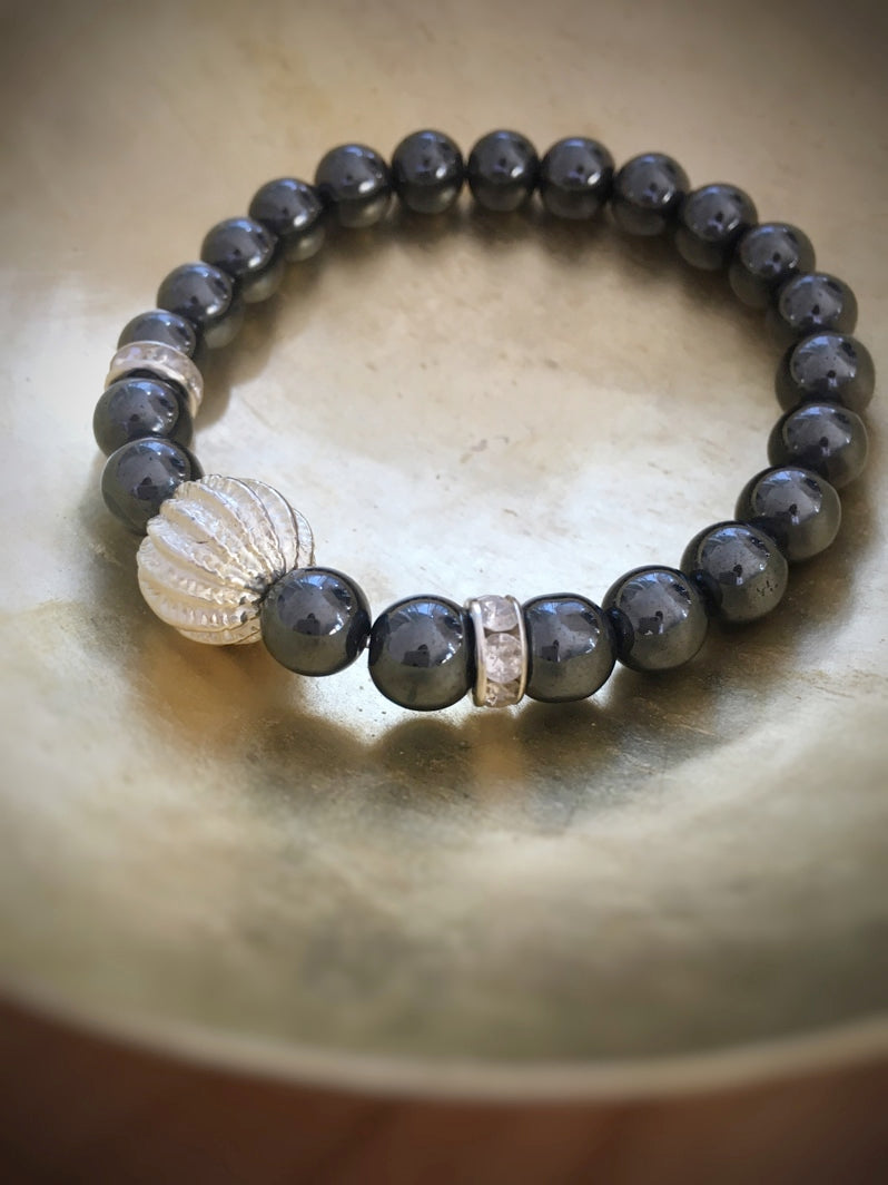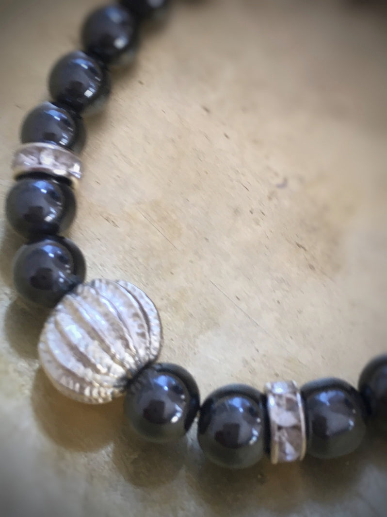 Perlen: Hämatit, 8mm, Rhinestone und als Eye-Catcher eine silberfarbene Metallperle