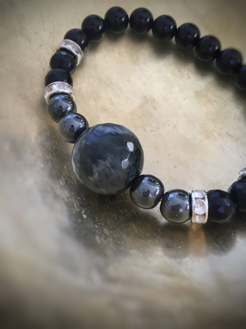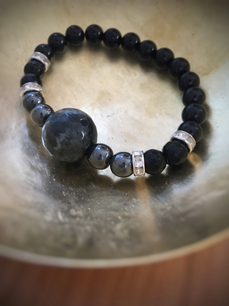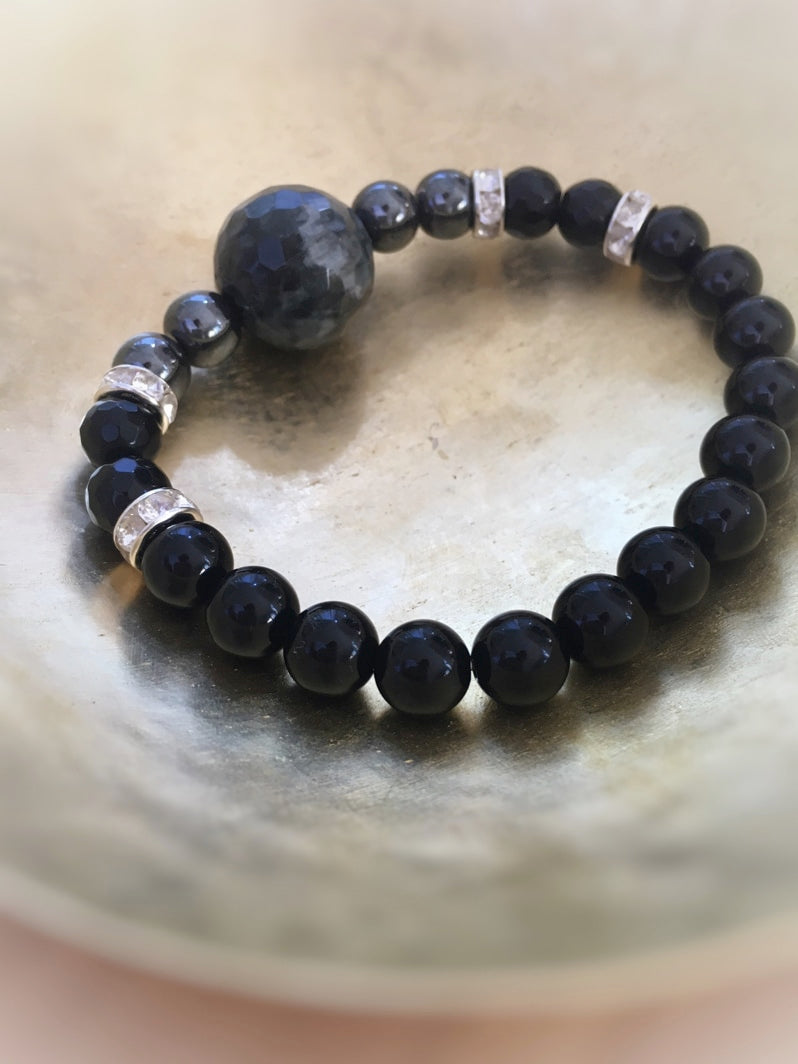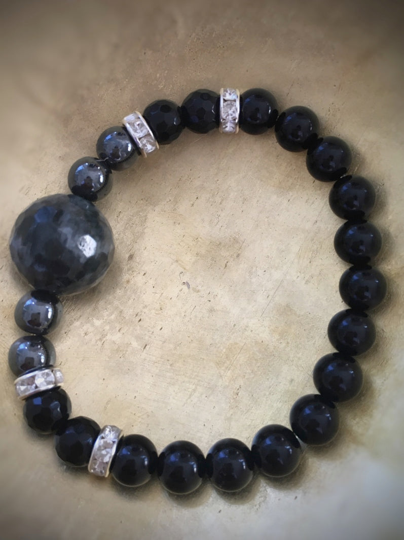 Perlen: Onyx und Hämatit, 8mm, Rhinestone und als Eye-Catcher eine große facettierte Muskovit-Perle
