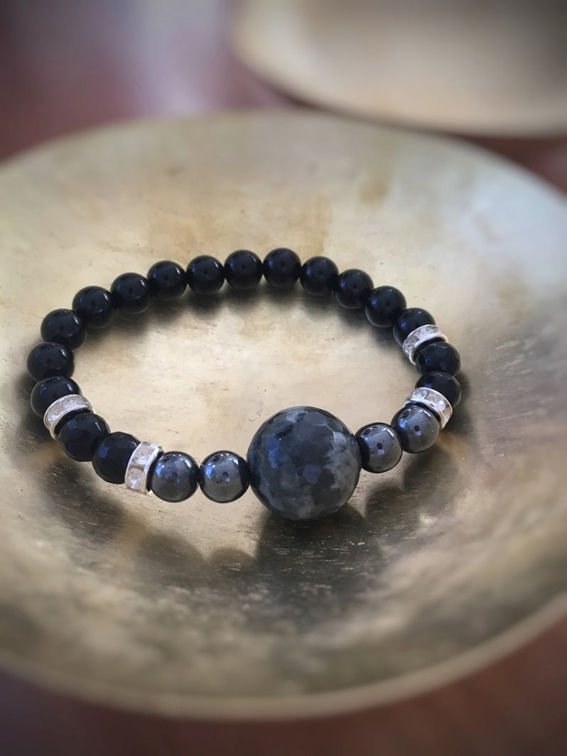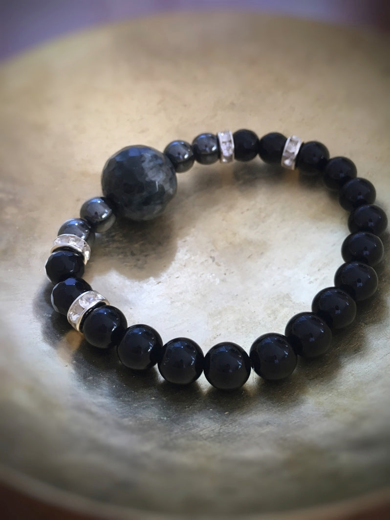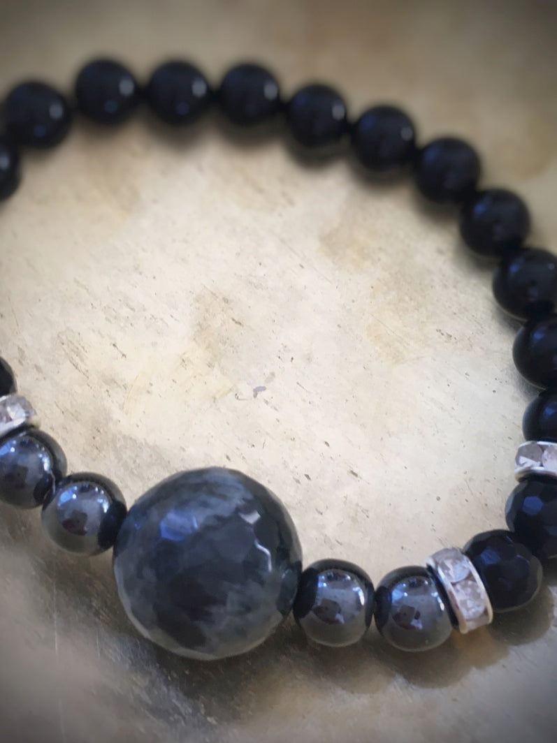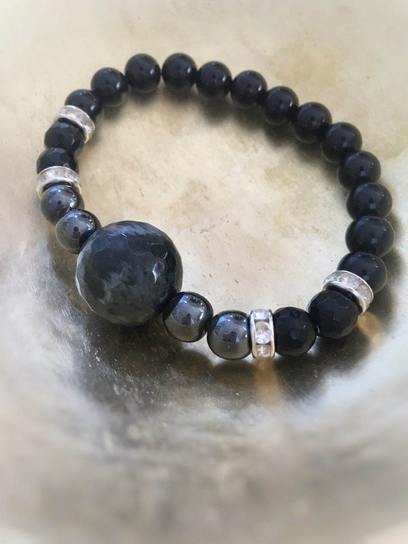 Perlen: Onyx und Hämatit, 8mm, Rhinestone und als Eye-Catcher eine große facettierte Muskovit-Perle