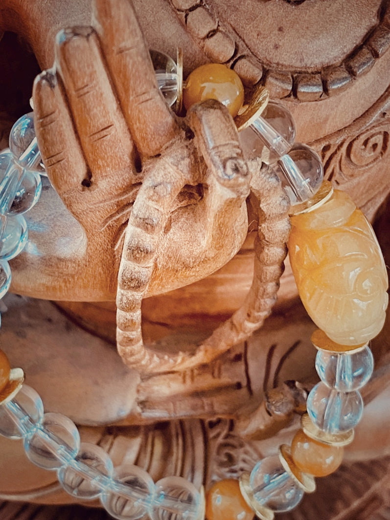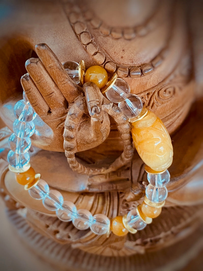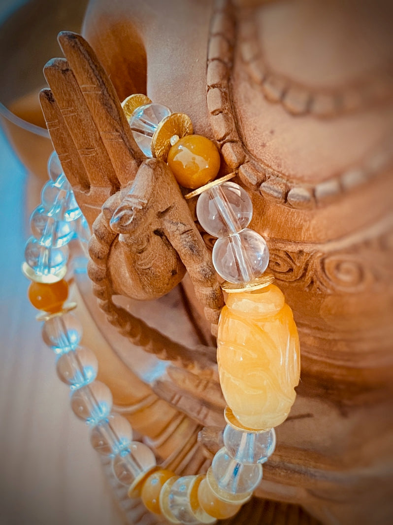 Perlen: Glasklarer Bergkristall, Honiggelbe Jade, 8mm mit vergoldeten Zierscheiben und wunderschöner gravierter Jadetrommel