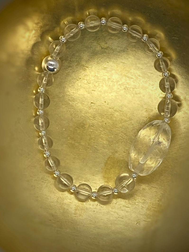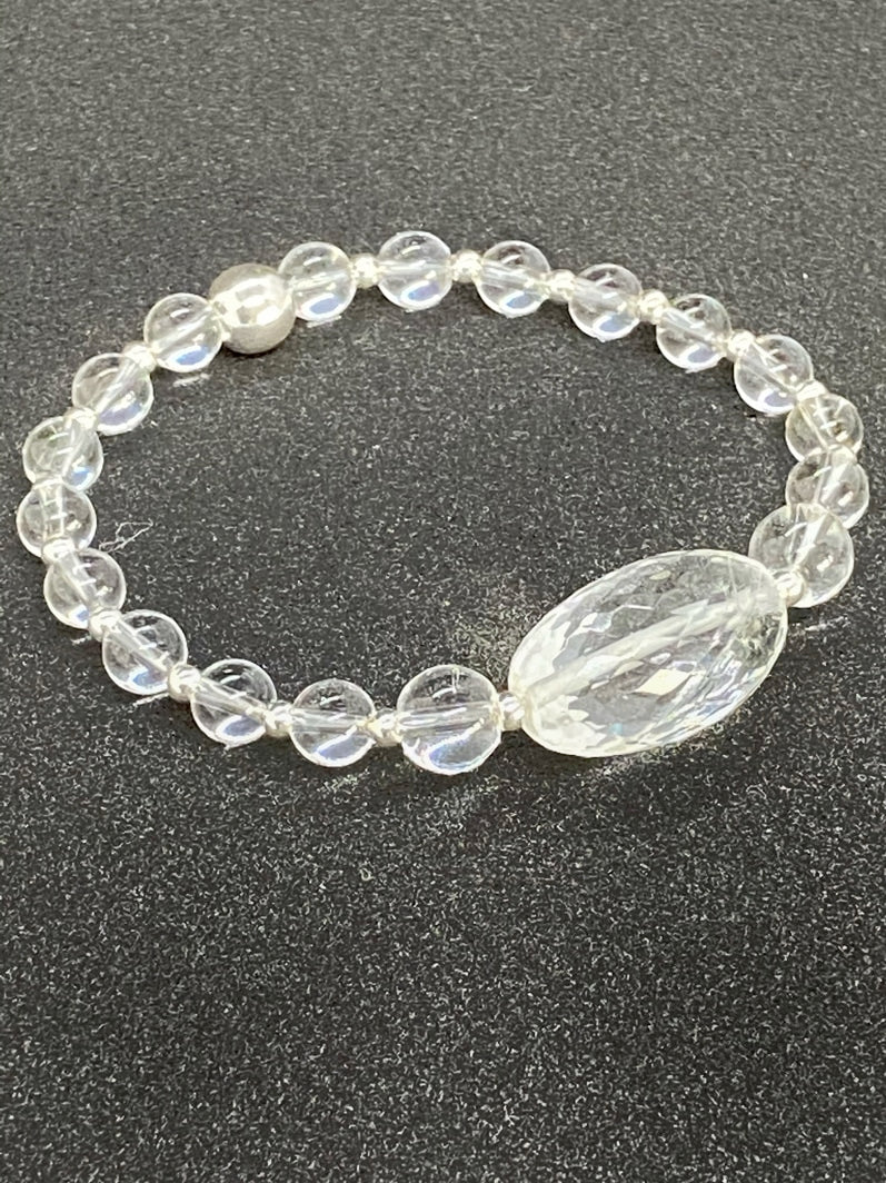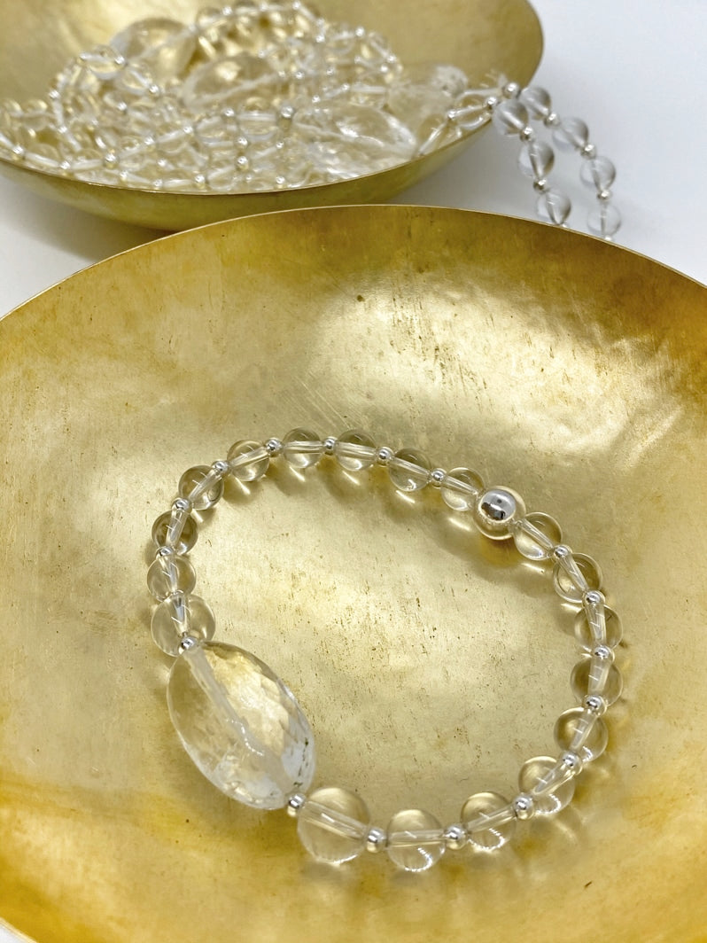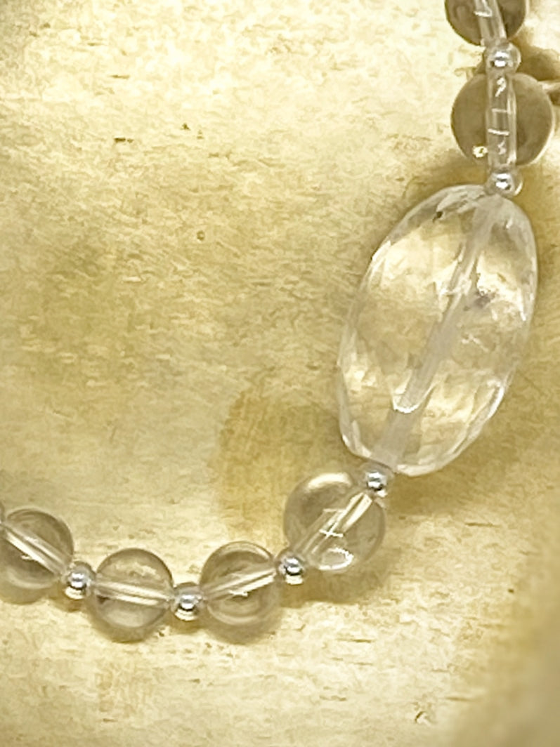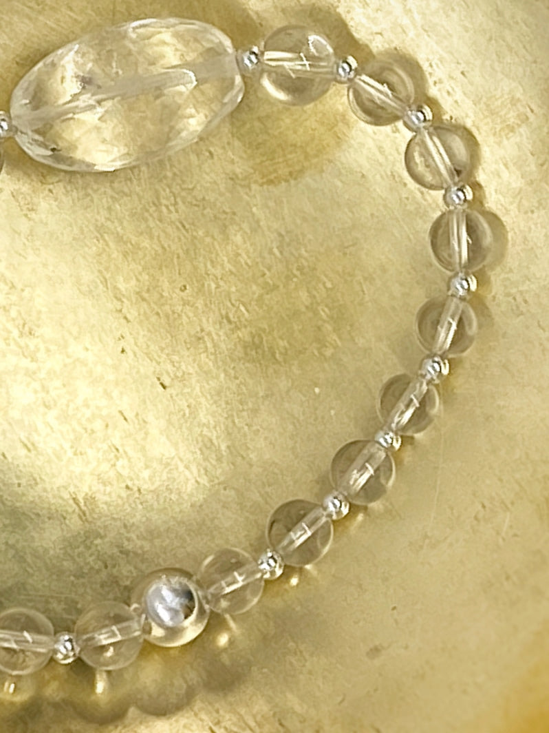 Perlen: Glasklarer Bergkristall, 6 und 8mm mit Silberspacern und wunderschöner facettierter Kristall-Olive