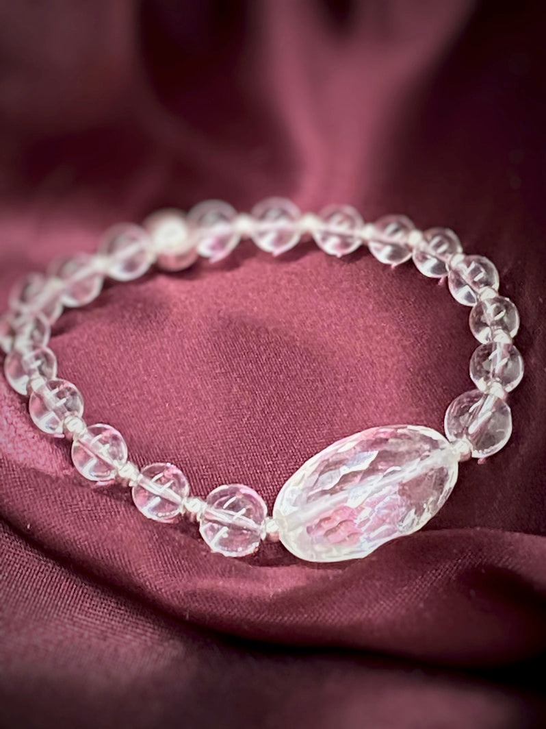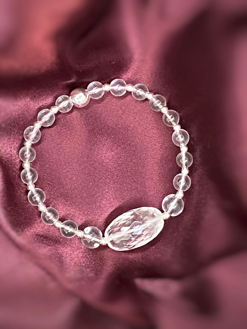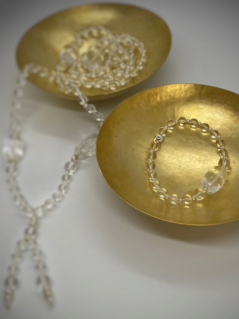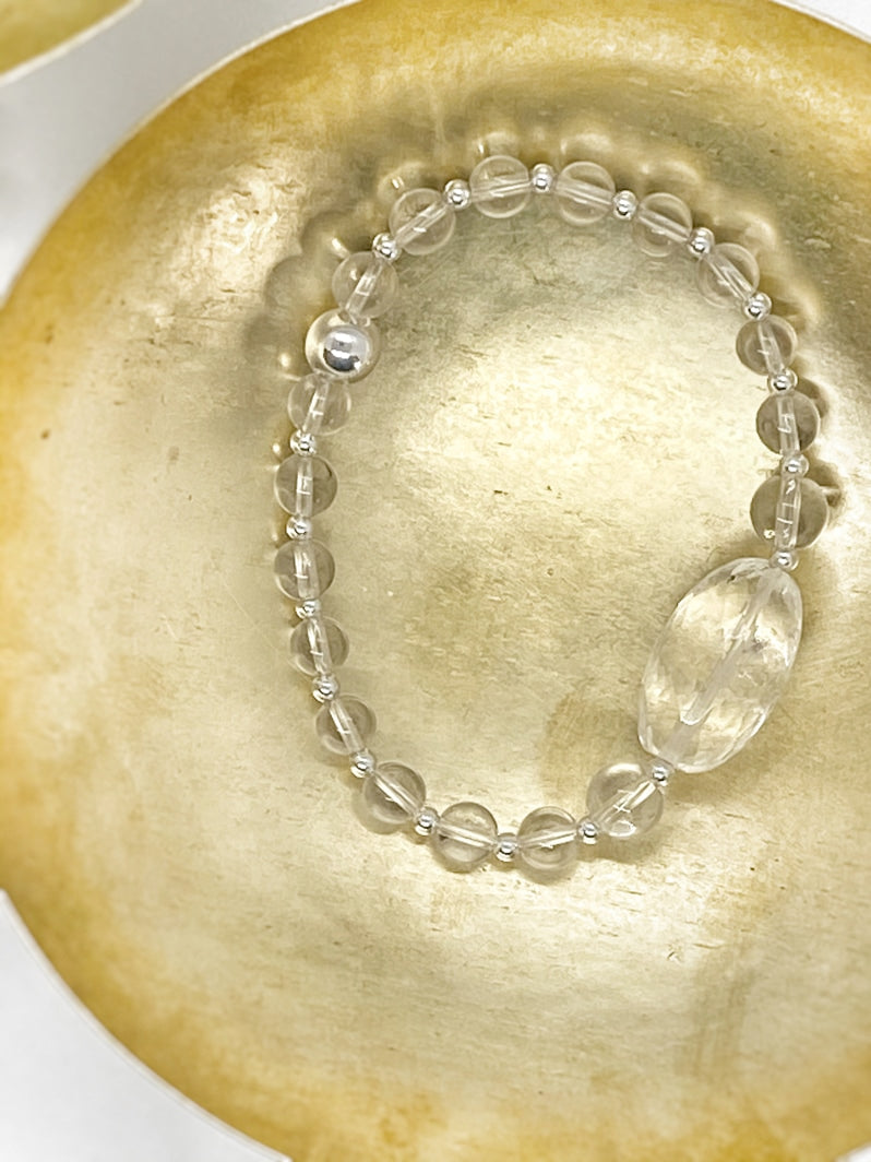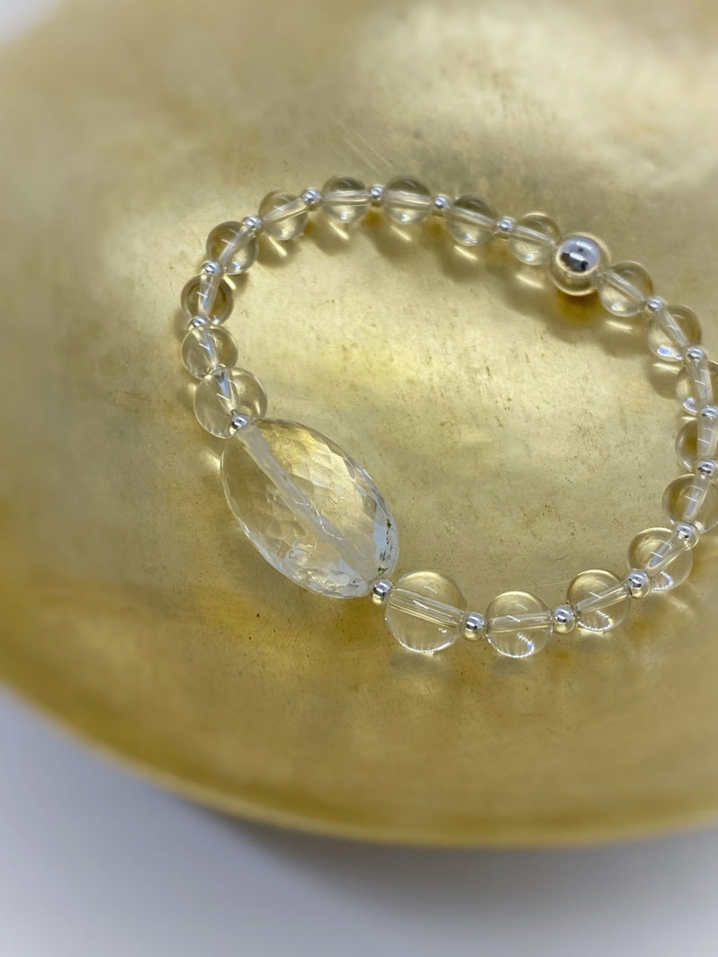 Perlen: Glasklarer Bergkristall, 6 und 8mm mit Silberspacern und wunderschöner facettierter Kristall-Olive