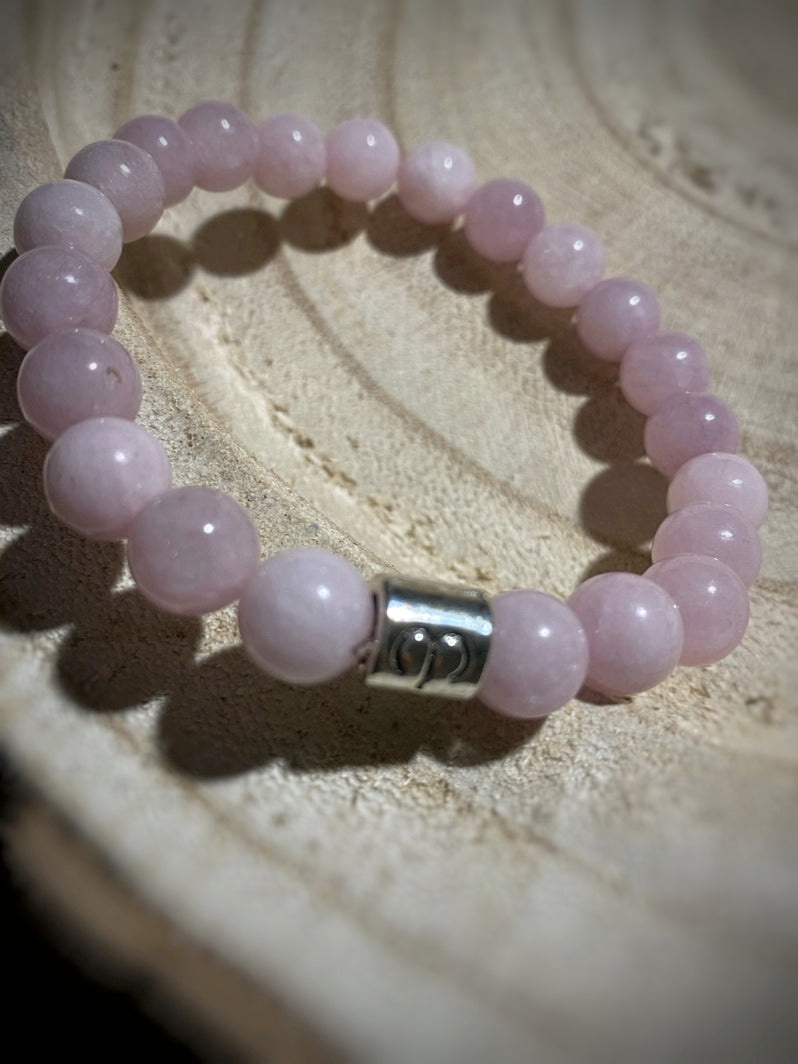 Perlen: Kunzit, 8mm und silberfarbene Metall-Kaschierperle mit Zodiac-Zeichen Widder/Aries (21. März -20. April)