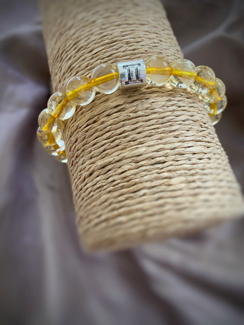 Perlen: Citrin, 8mm und silberfarbene Metall-Kaschierperle mit Zodiac-Zeichen Zwilling/Gemini (21. Mai -21. Juni)
