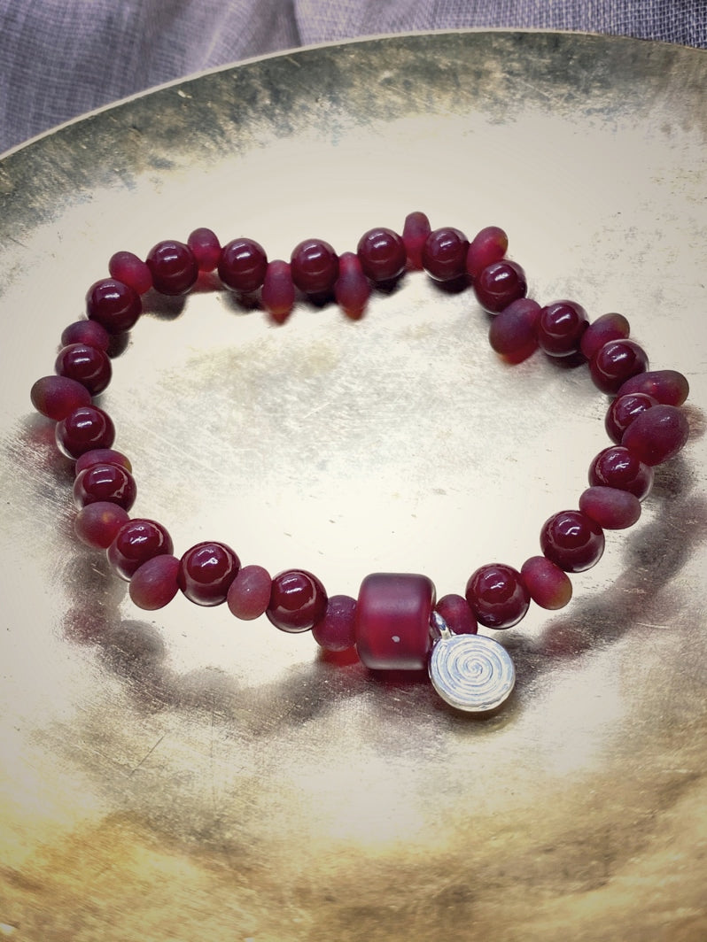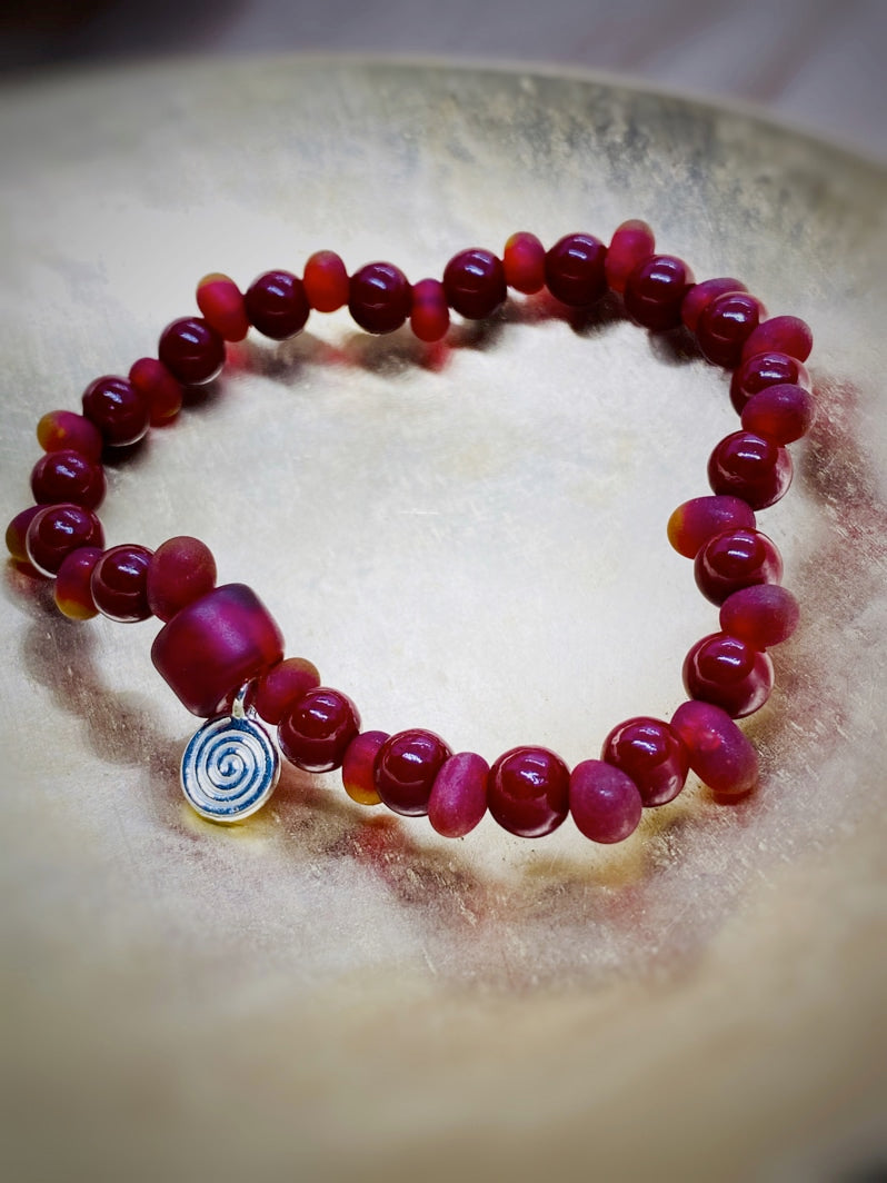 Rote lackierte Glasperlen mit böhmischen Glastropfen und einem kleinen silberfarbenen Spiralanhänger