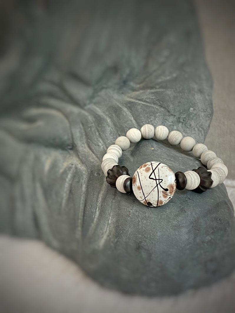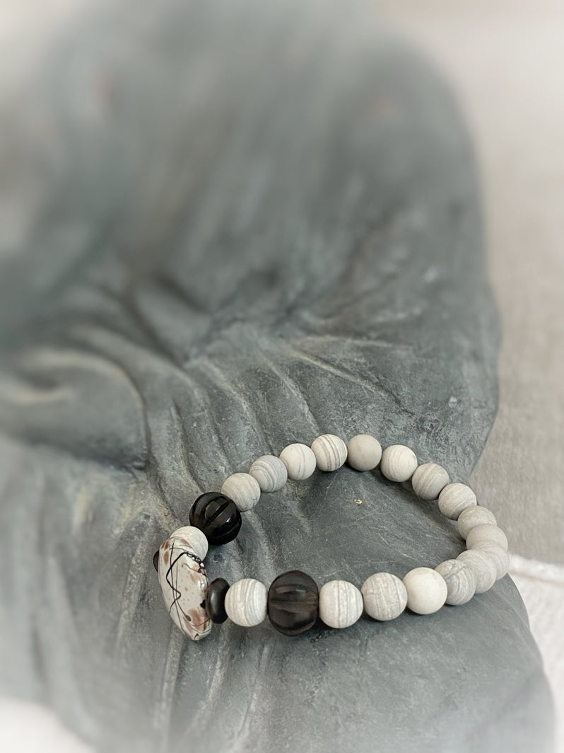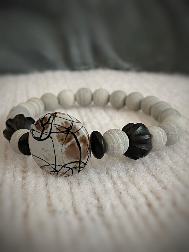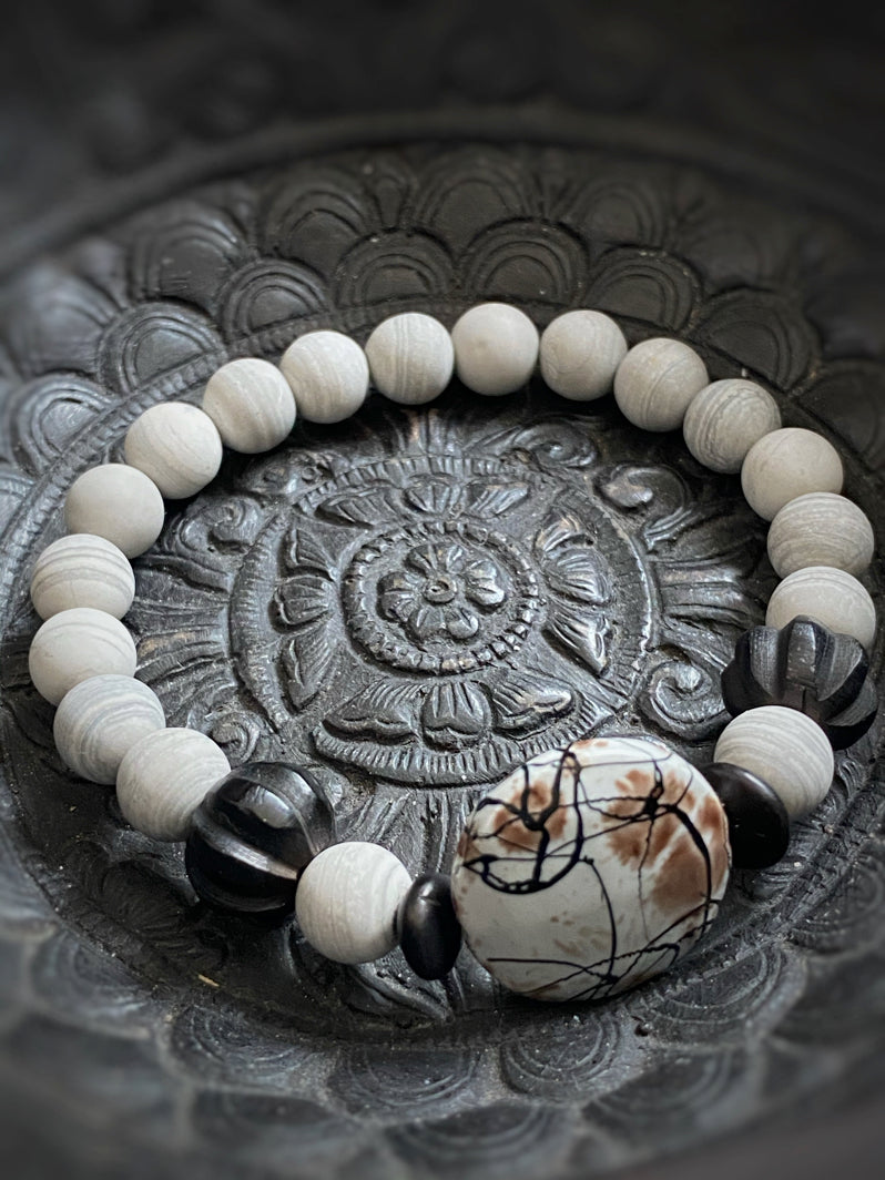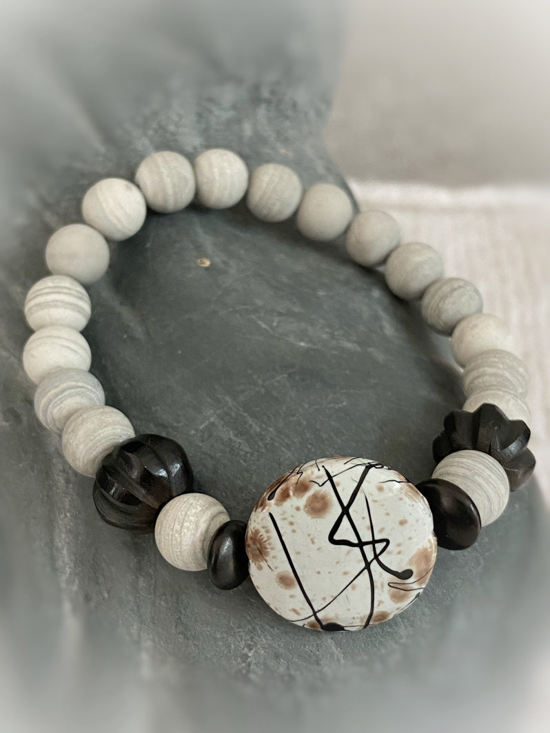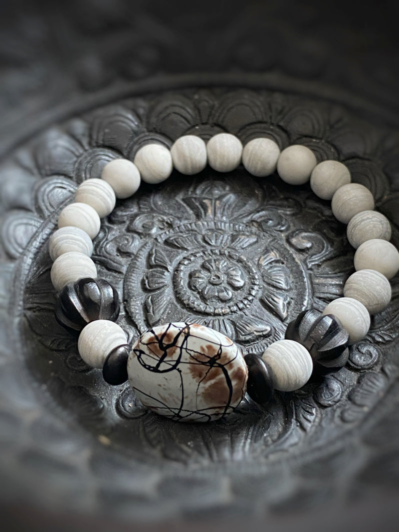 Perlen: Hellgrauer matter Bänderjaspis 8mm, schwarze Tagua-Scheiben, handgearbeitete Horn-Melonen und Art-Medaillon
