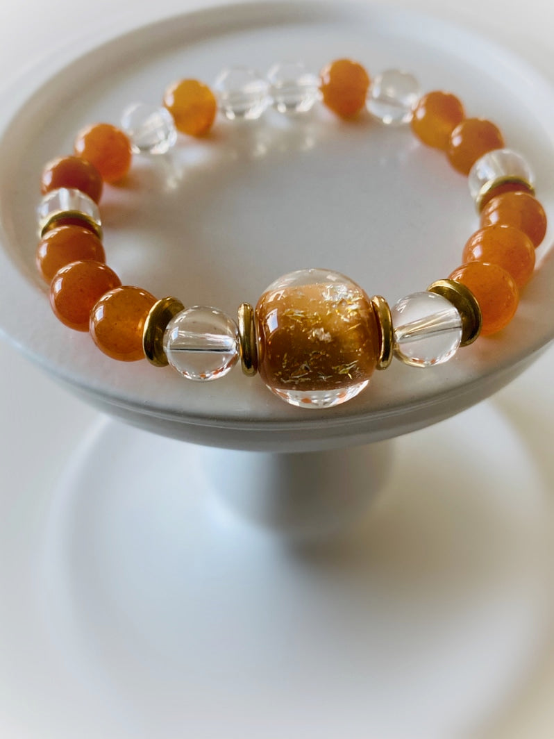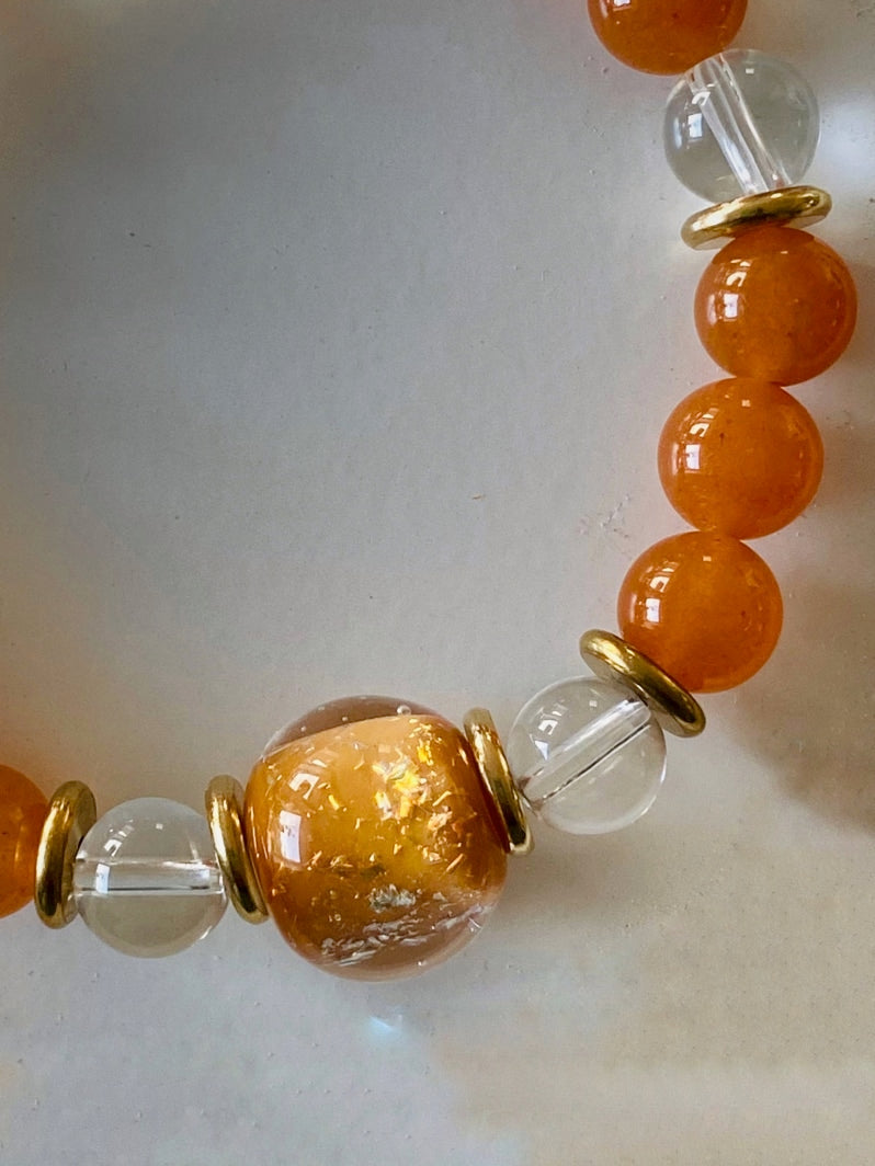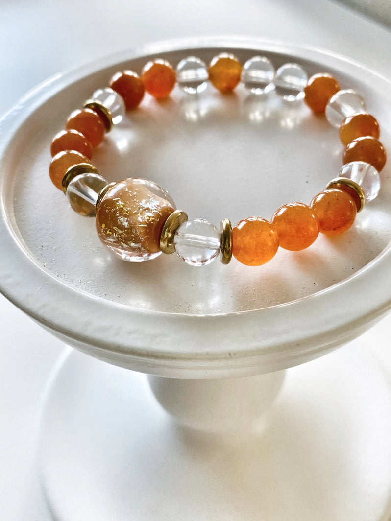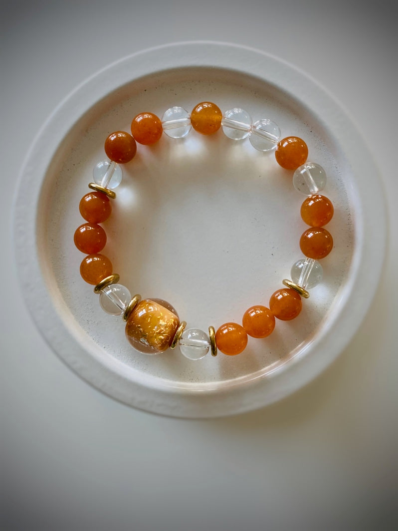 Perlen: Roter Aventurin 8mm, Bergkristall 8mm, Messingscheiben und wunderschöne handgearbeitete Lampwork-Glasperle mit Kupfereinschlüssen
