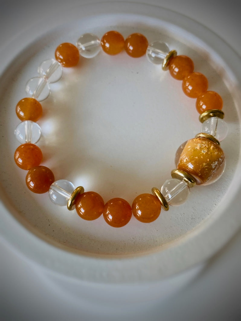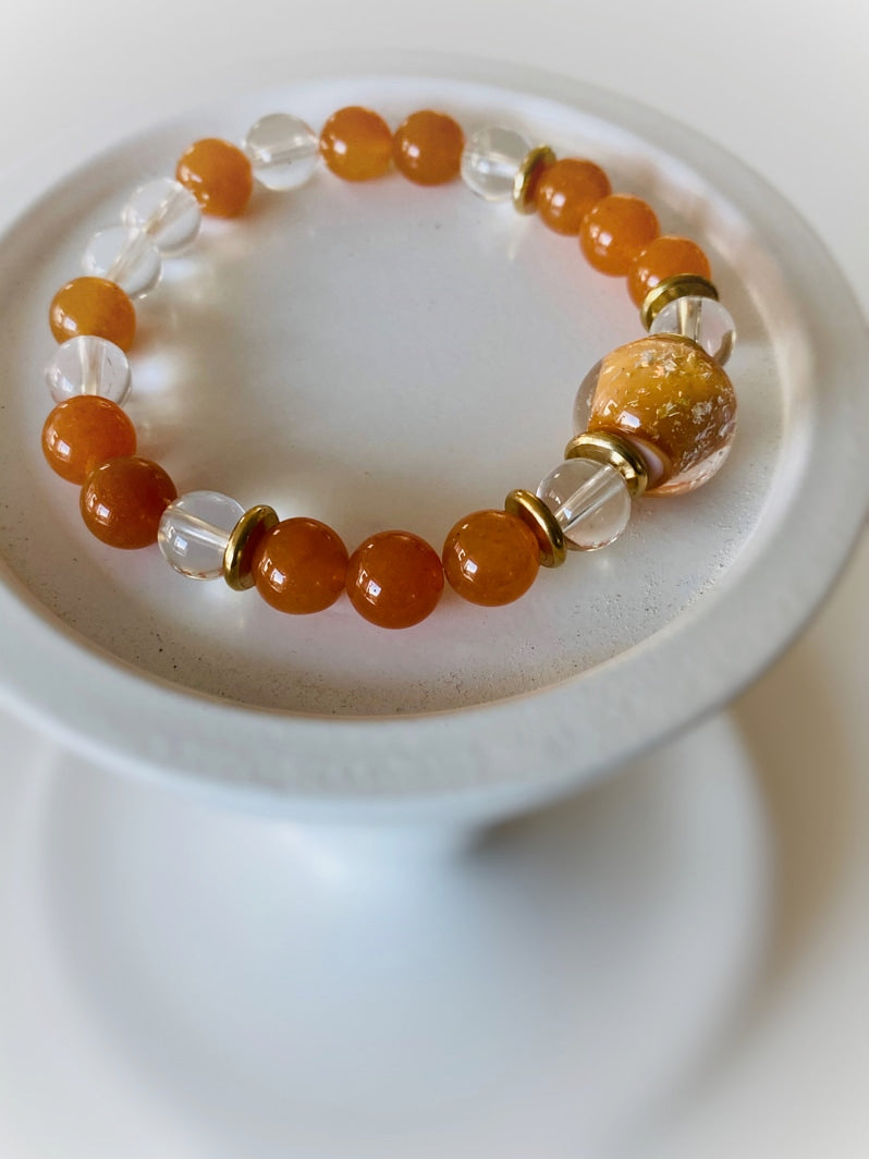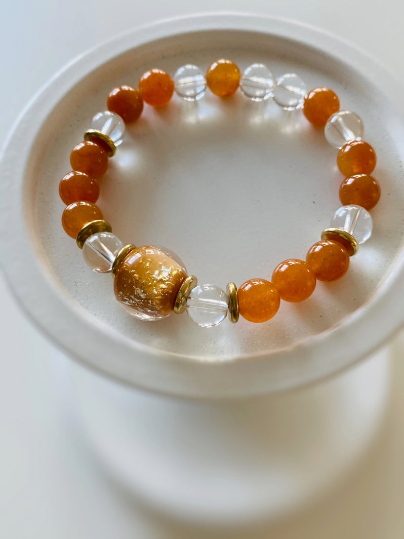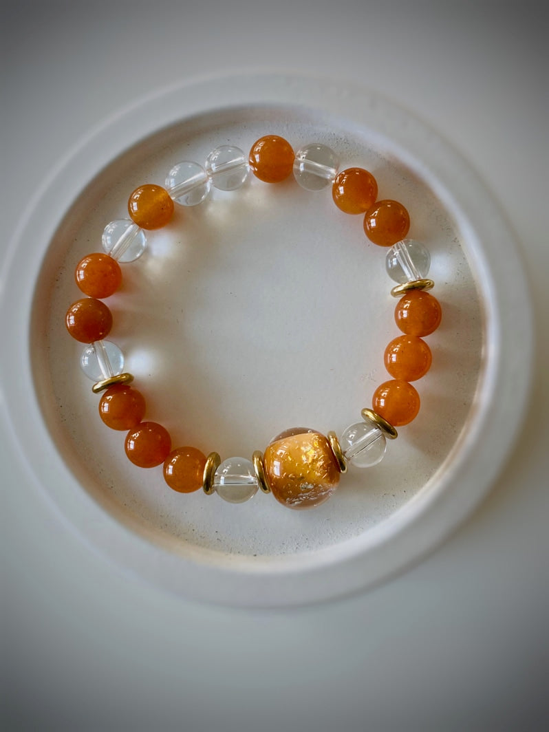 Perlen: Roter Aventurin 8mm, Bergkristall 8mm, Messingscheiben und wunderschöne handgearbeitete Lampwork-Glasperle mit Kupfereinschlüssen