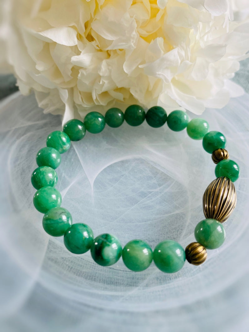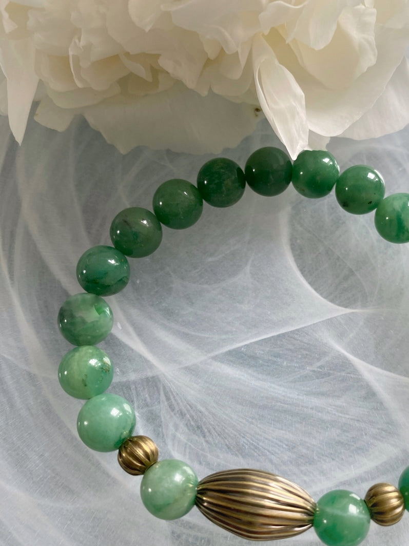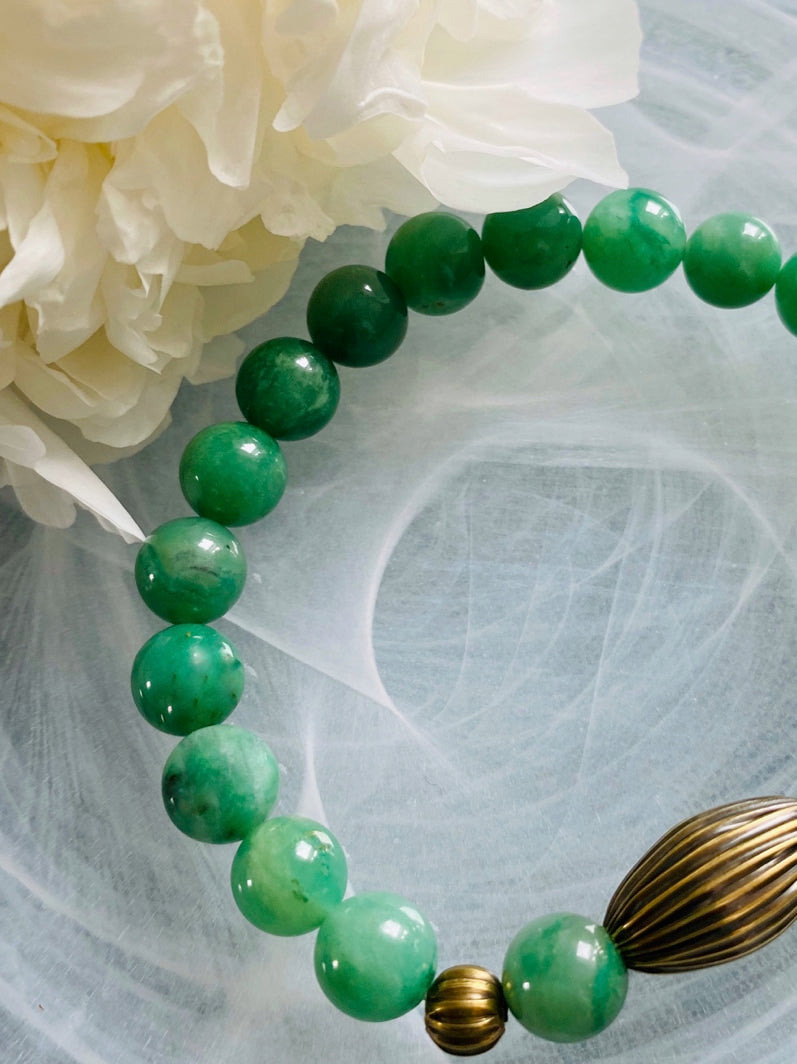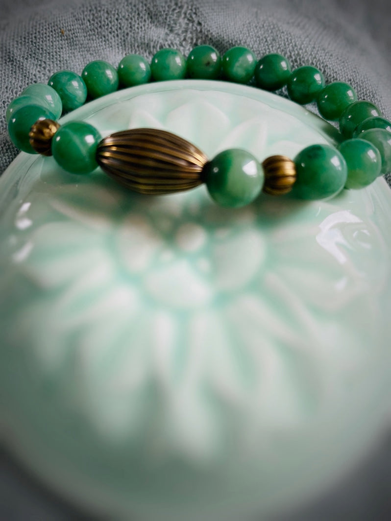 Perlen: Seltene Verdit-Perlen mit schönen geriffelten Messingperlen