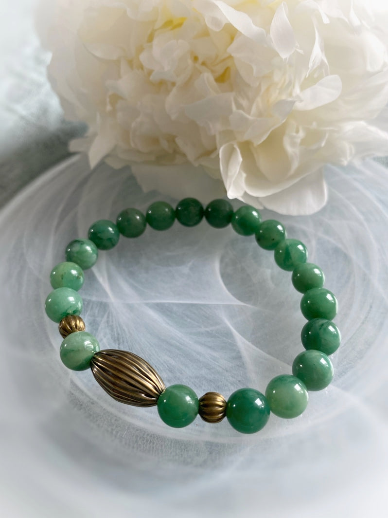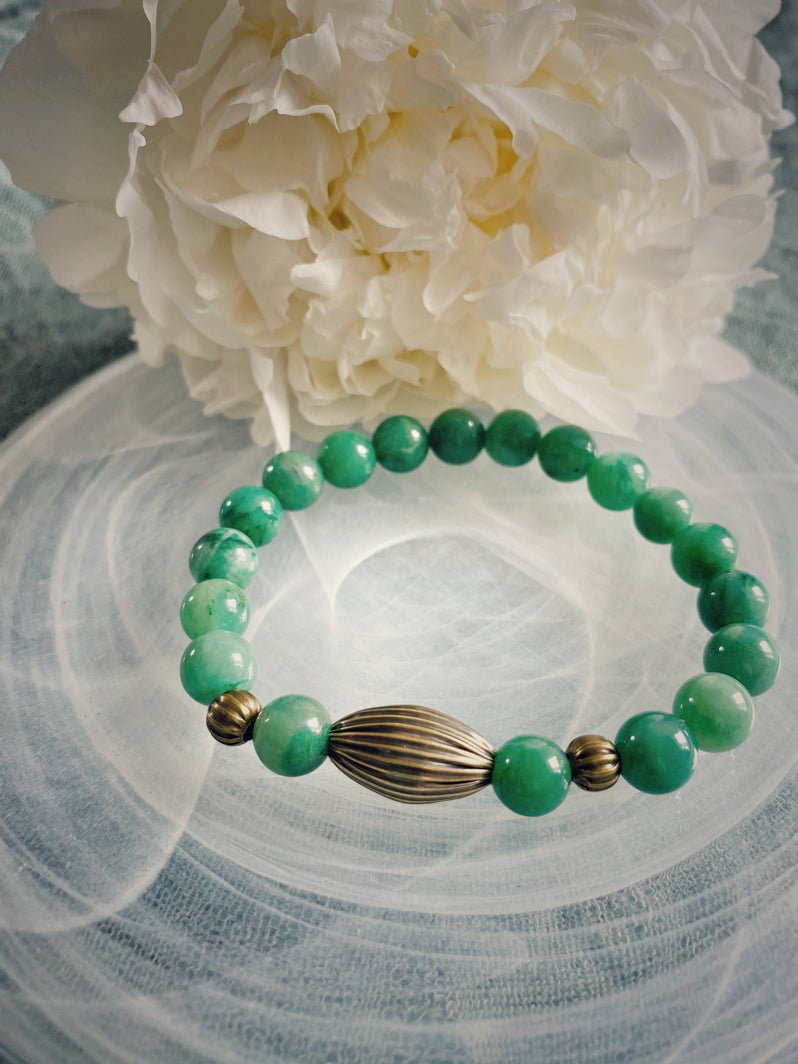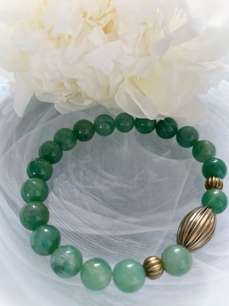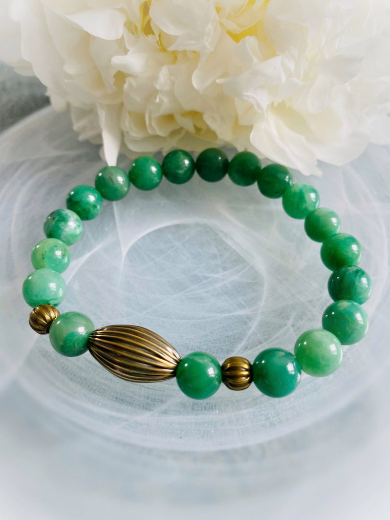 Perlen: Seltene Verdit-Perlen mit schönen geriffelten Messingperlen
