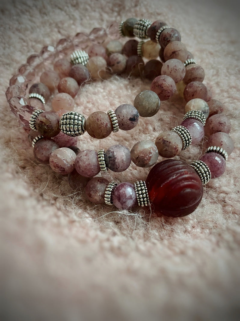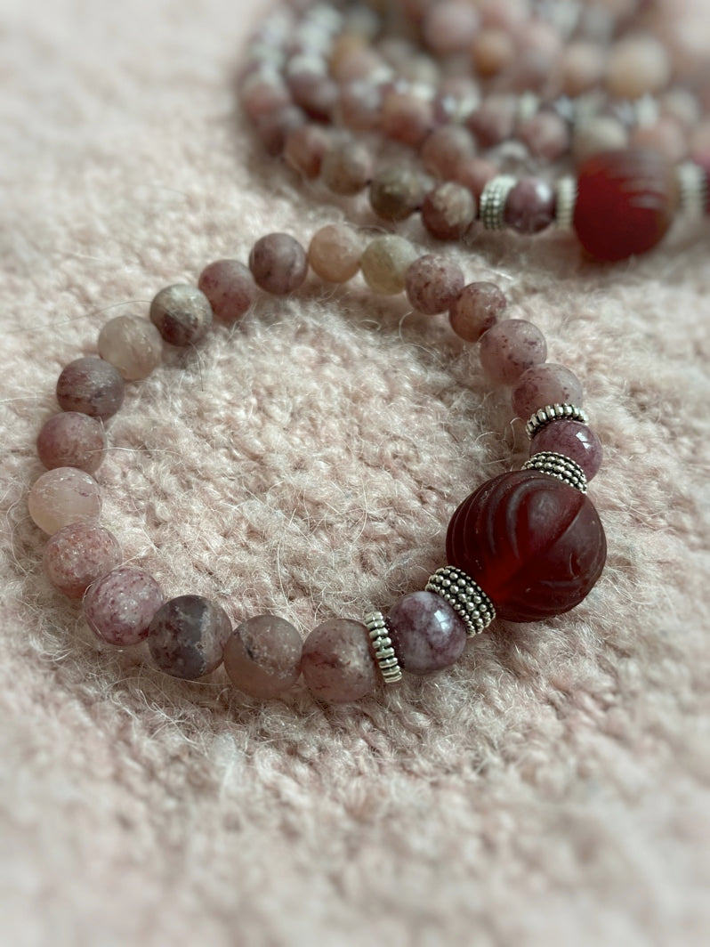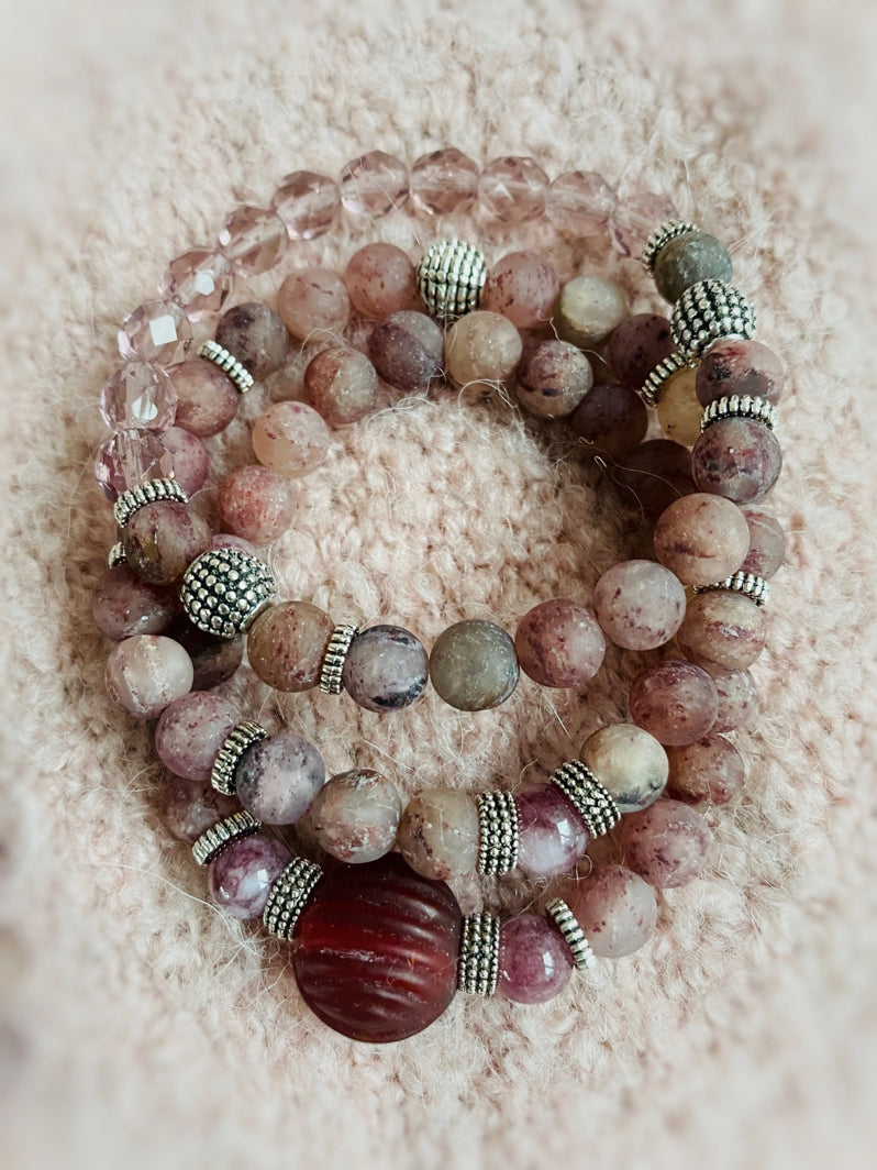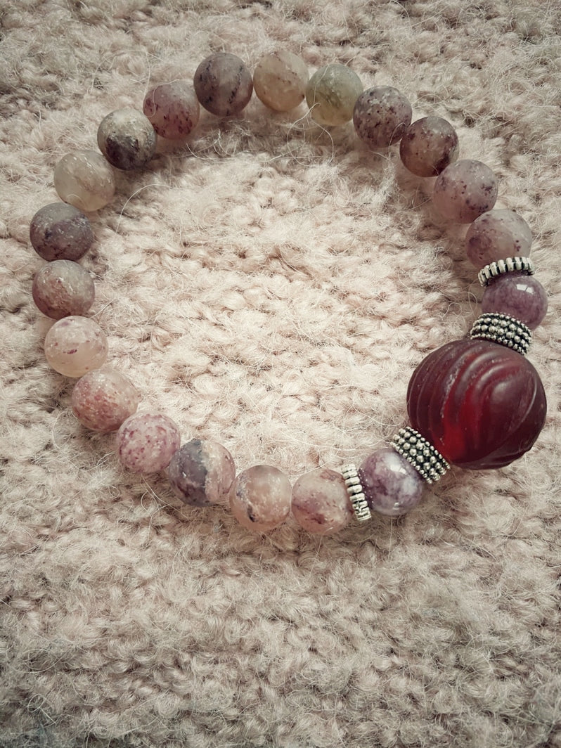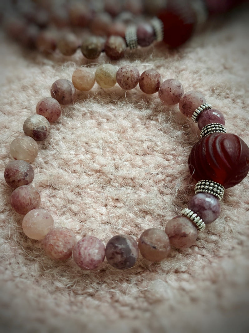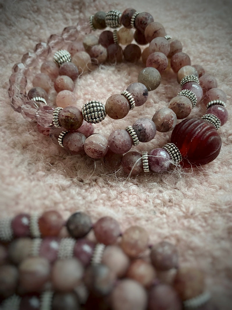 Perlen: Lepidokrokit 8mm, Lepidolith 8mm, silberfarbene Metallscheiben und afrikanische kannelierte Glasperle