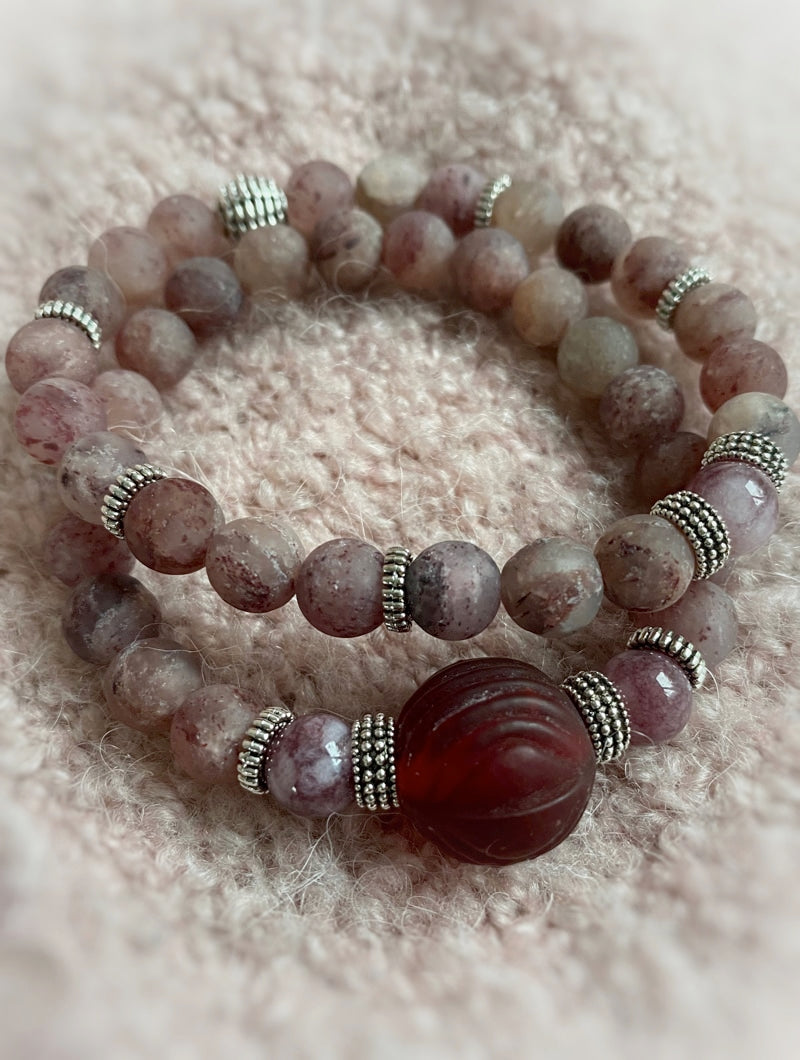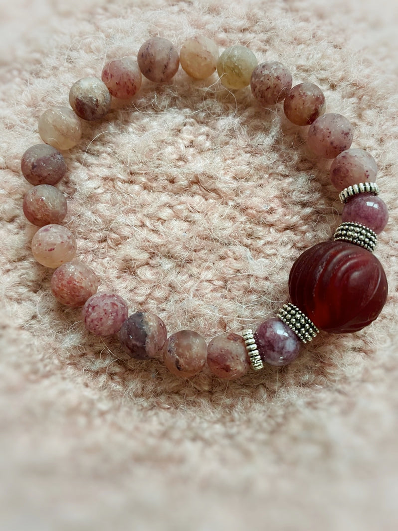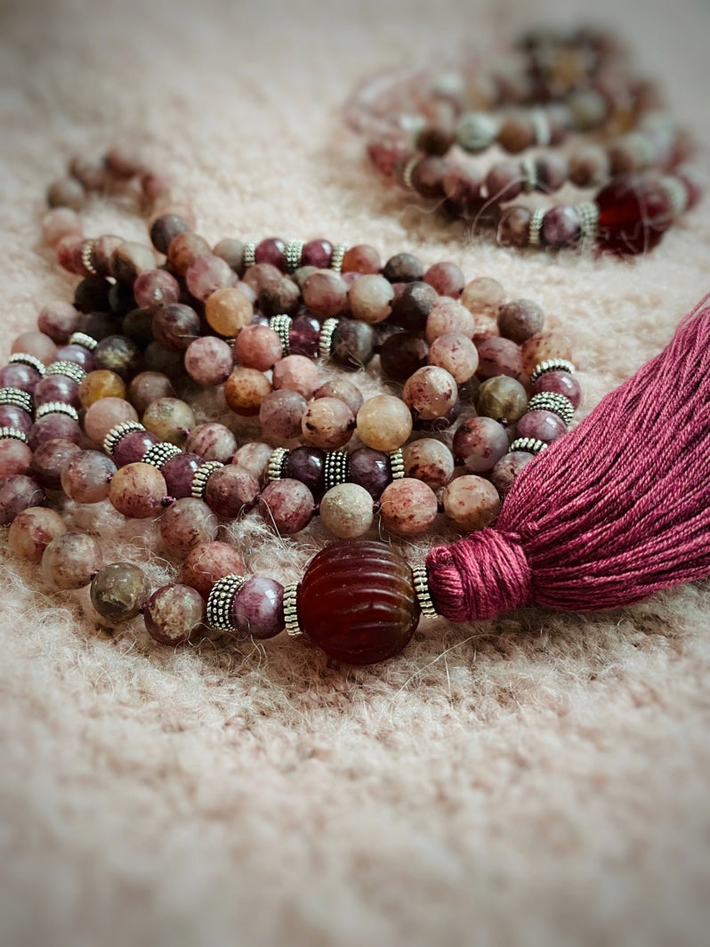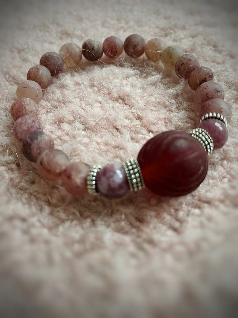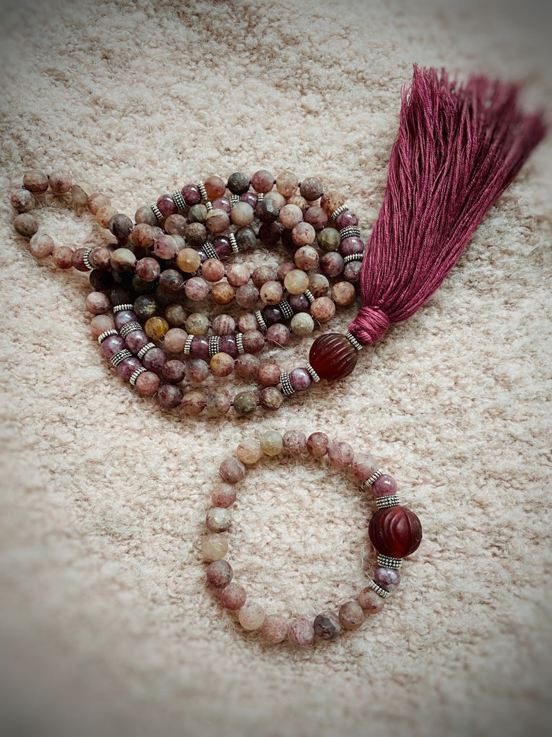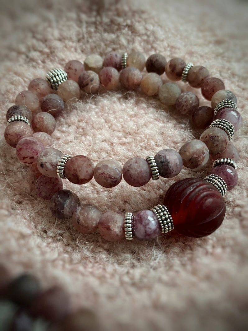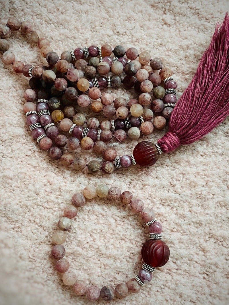 Perlen: Lepidokrokit 8mm, Lepidolith 8mm, silberfarbene Metallscheiben und afrikanische kannelierte Glasperle