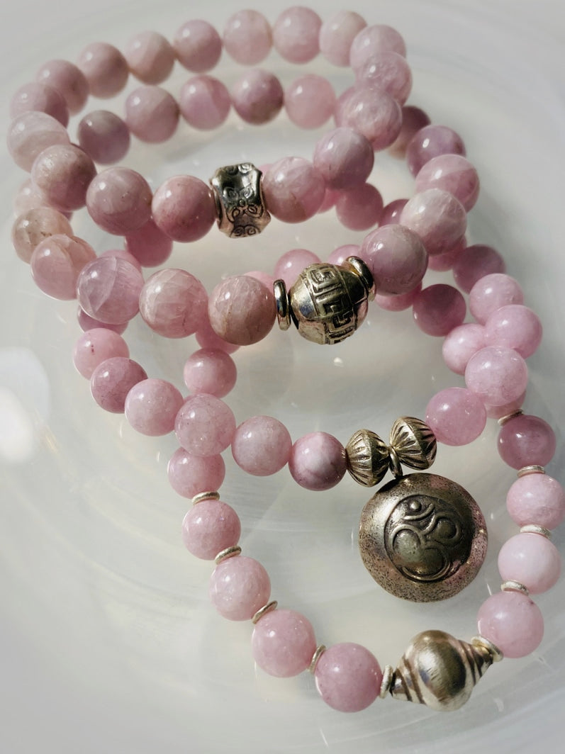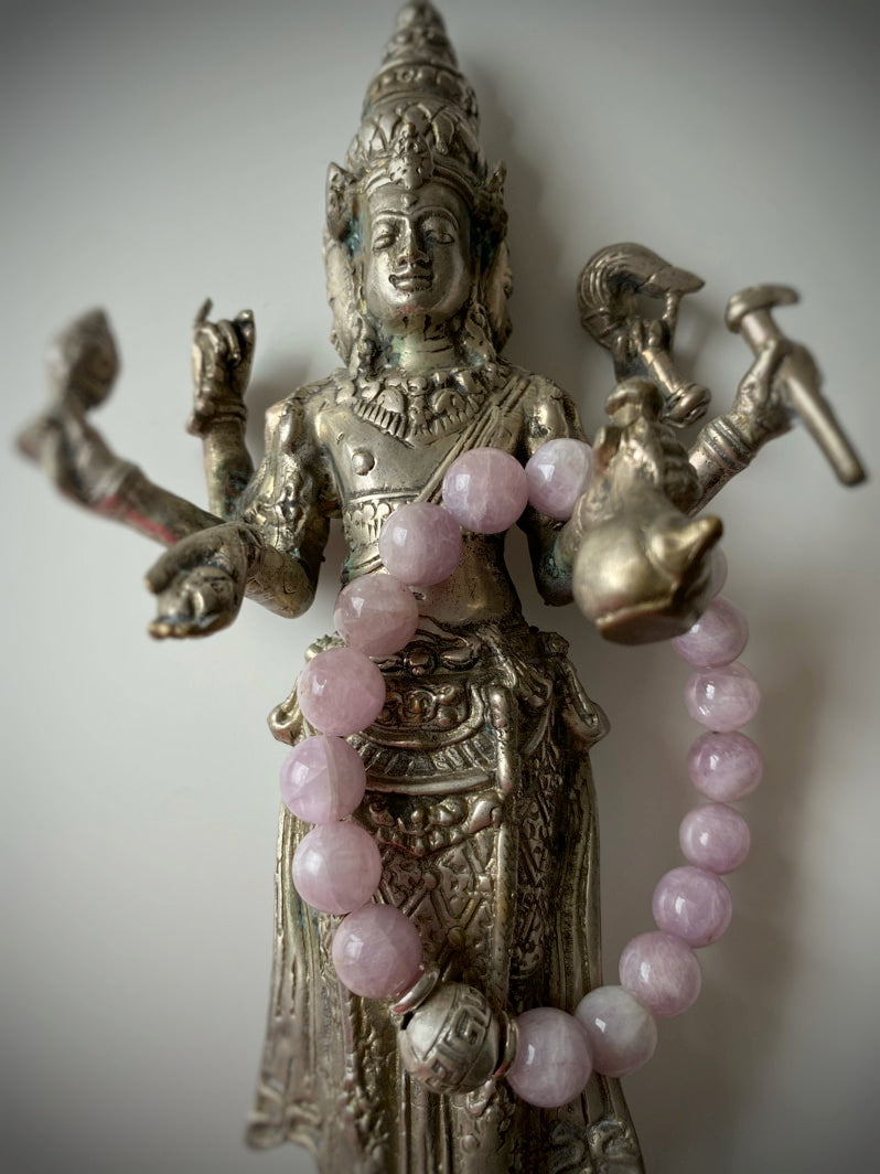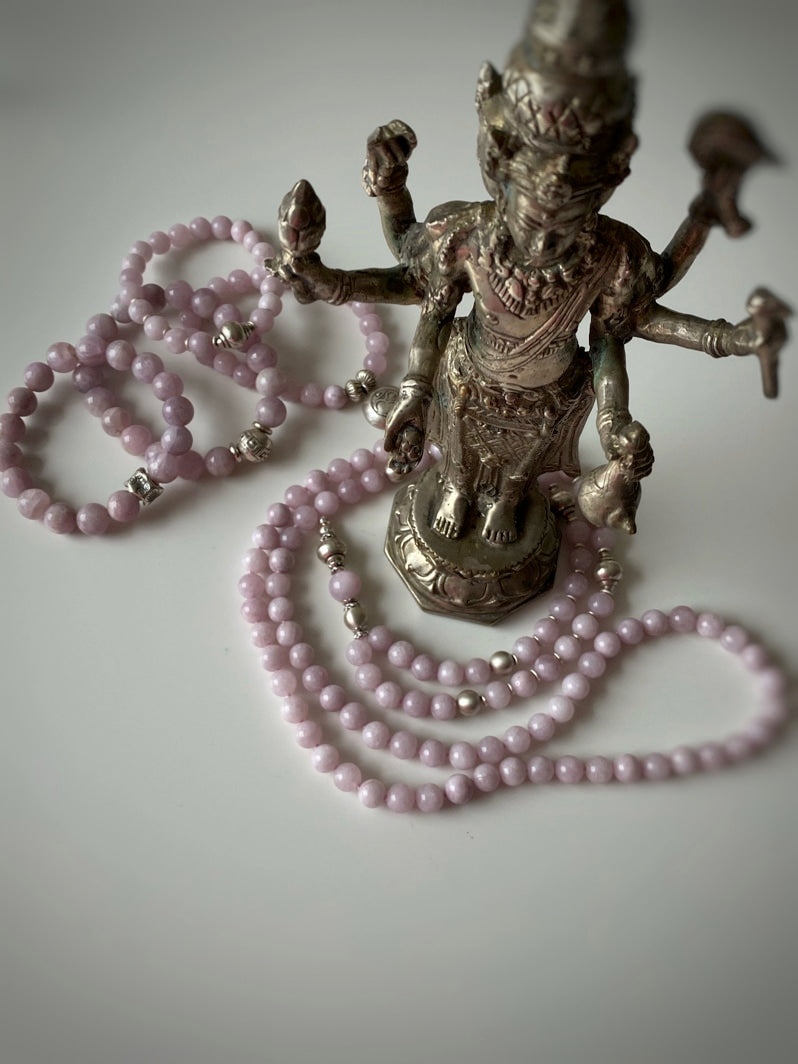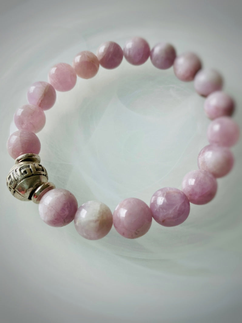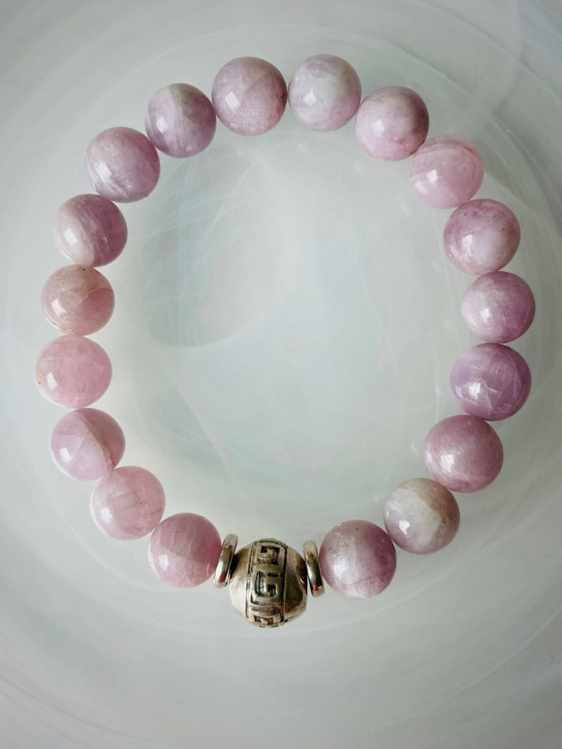 Perlen: Kunzit, 10mm, handgearbeitete Silber-Perle mit Mäander-Muster aus Thailand