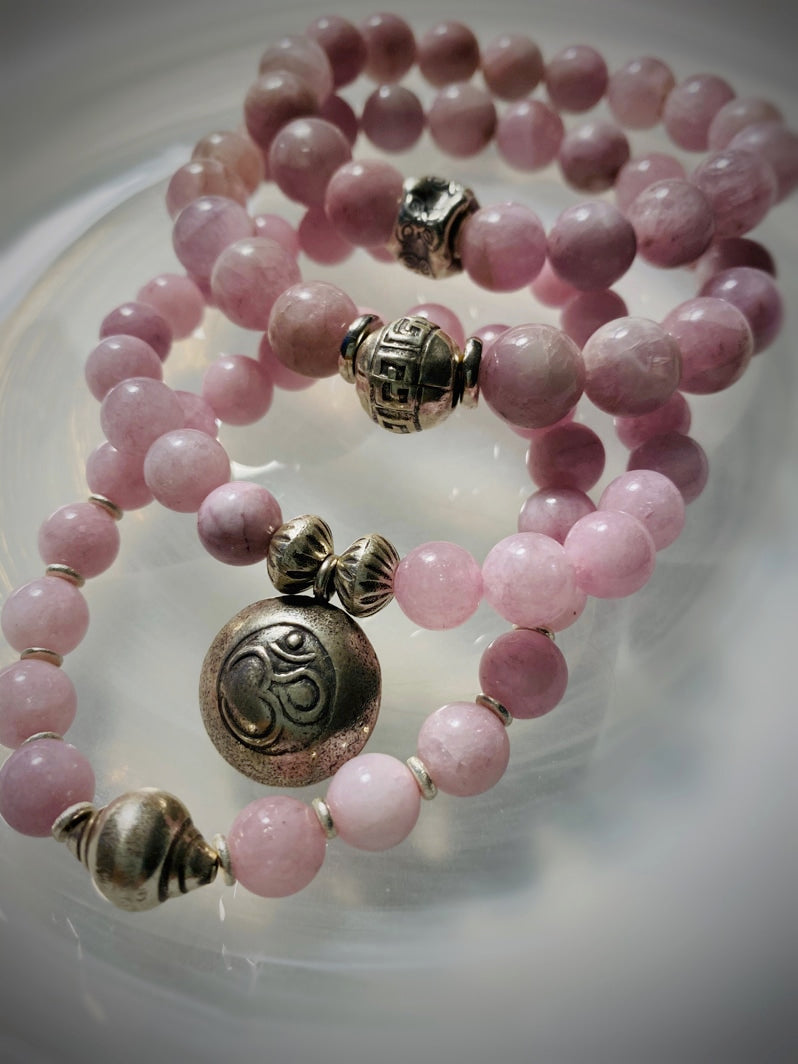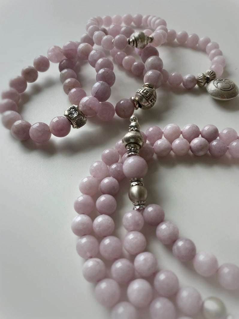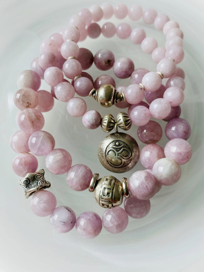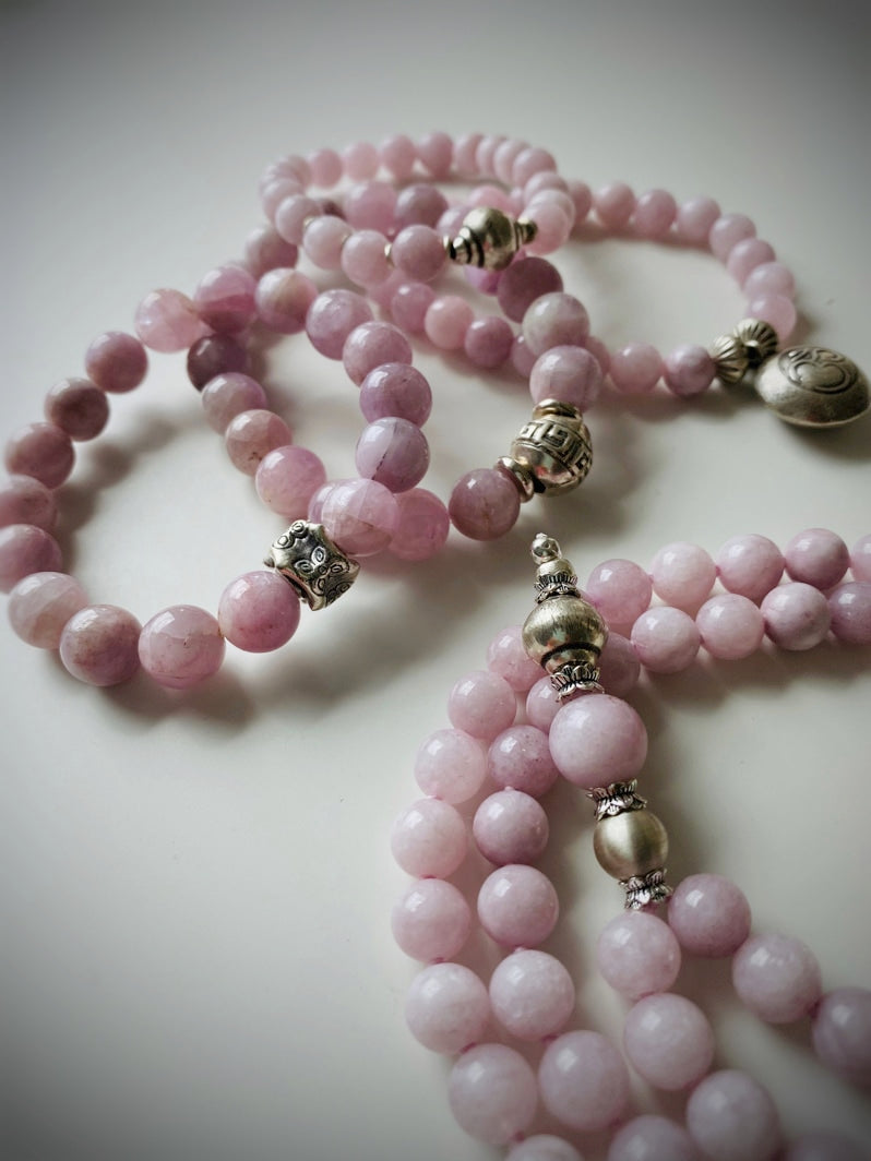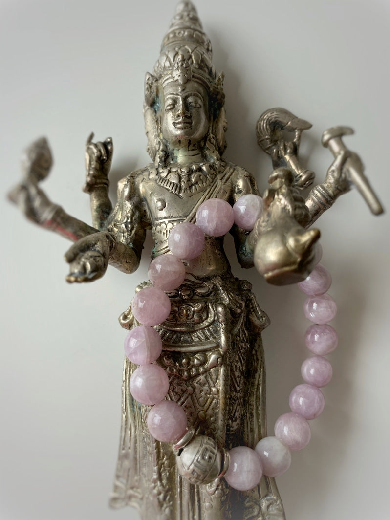 Perlen: Kunzit, 10mm, handgearbeitete Silber-Perle mit Mäander-Muster aus Thailand