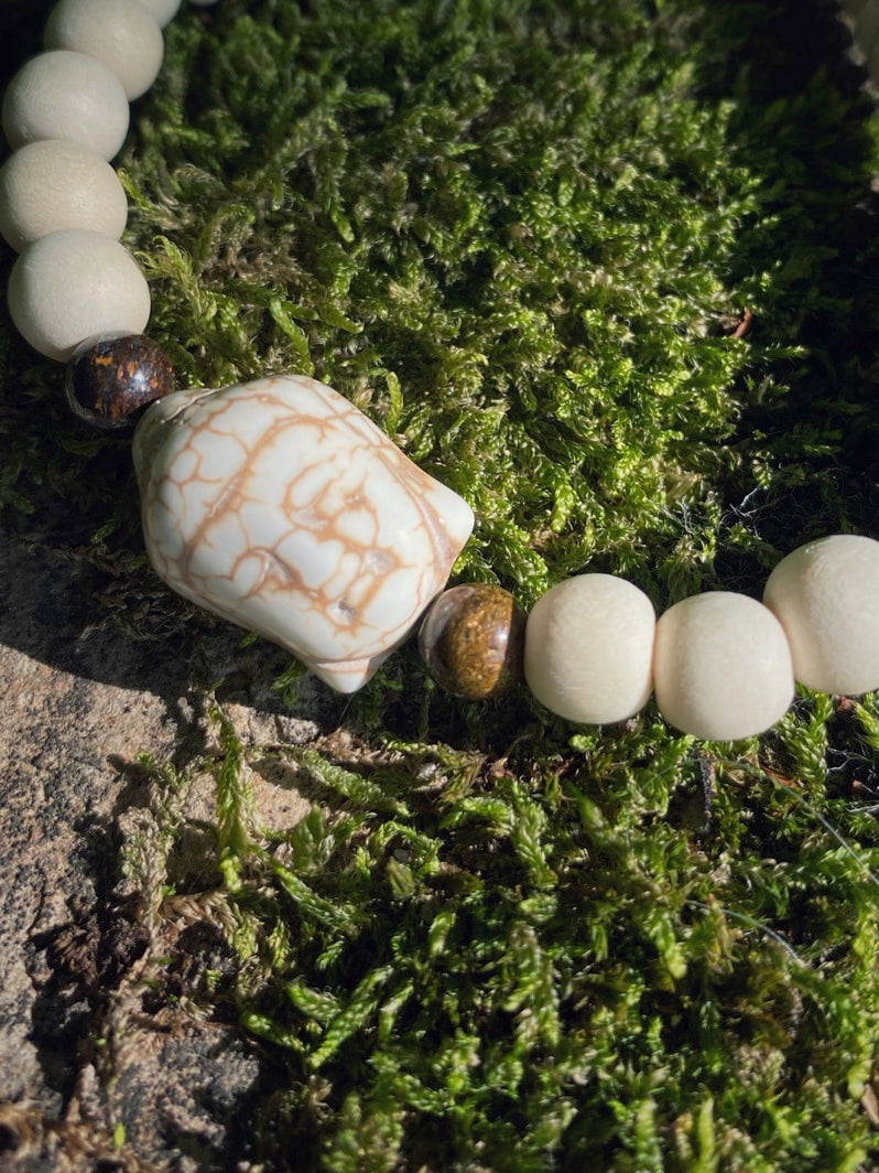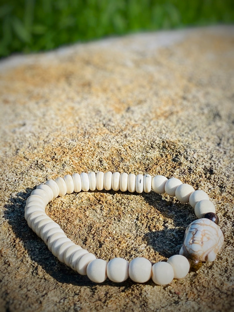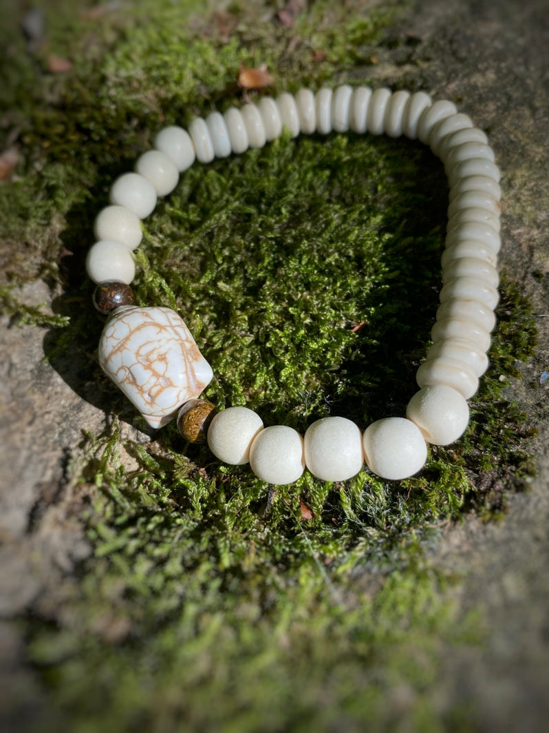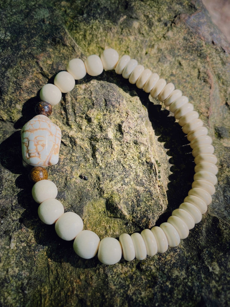 Perlen: Ambaba-Weißholz 8mm, Scheiben von weißem Türkis, Bronzit 6mm, Buddha