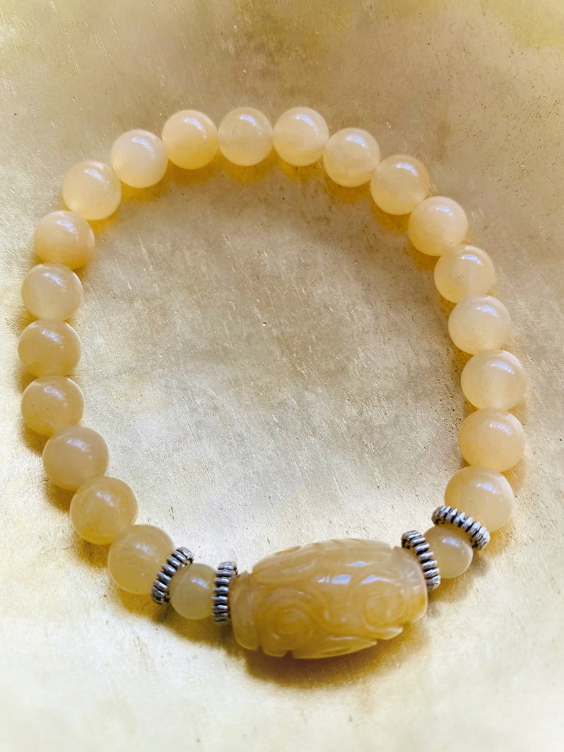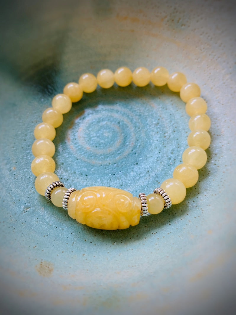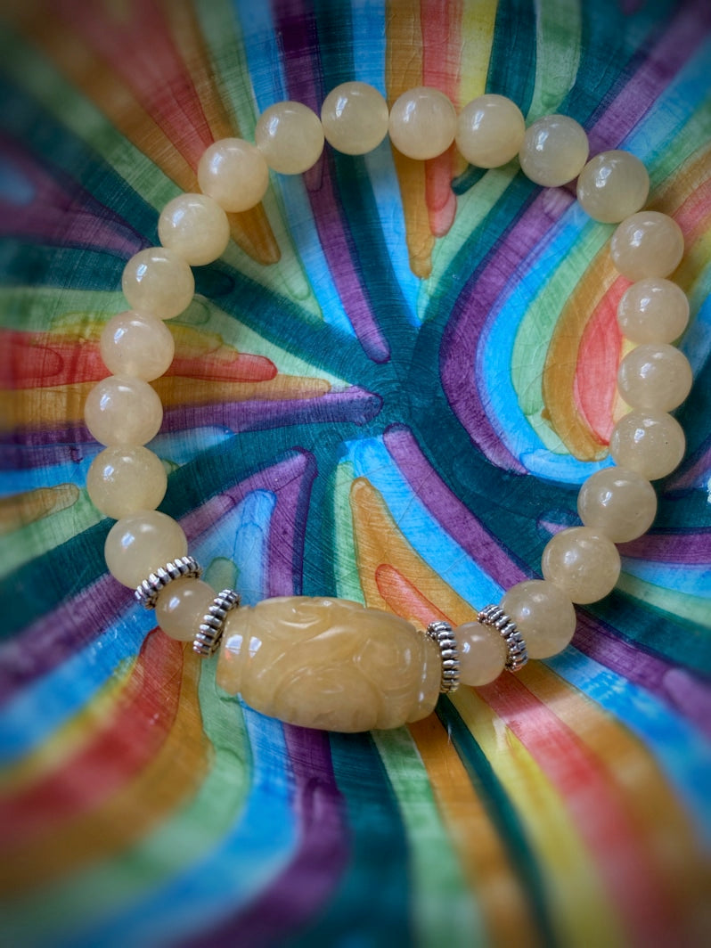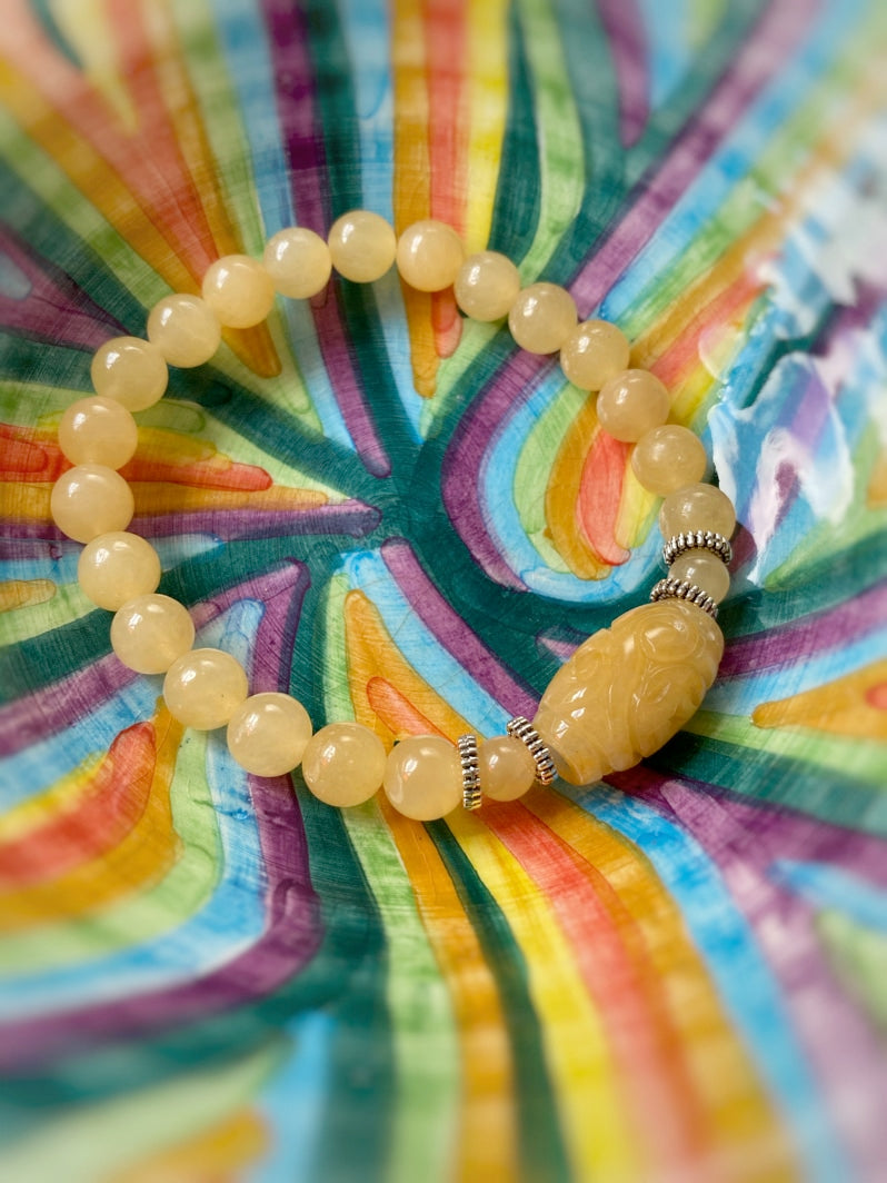 Perlen: Strahlend gelbe Jade, 8mm, mit wunderschöner Jade-Trommel, eingerahmt mit Aragonit 6mm und silberfarbenen Metall-Scheiben