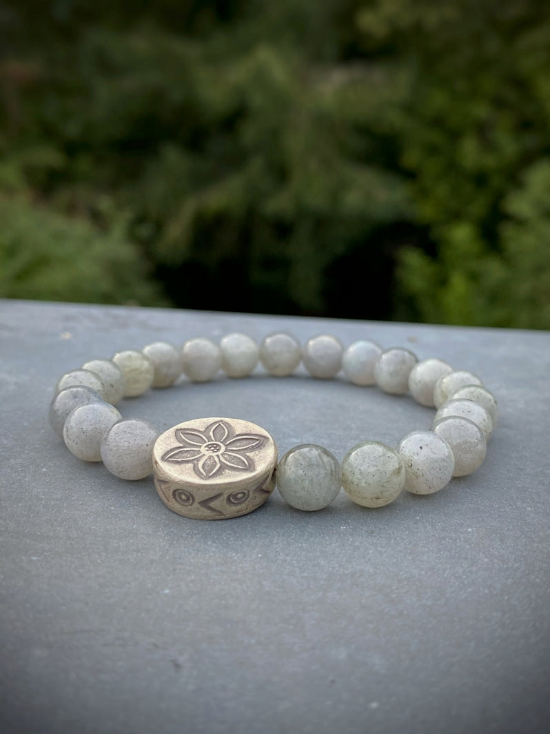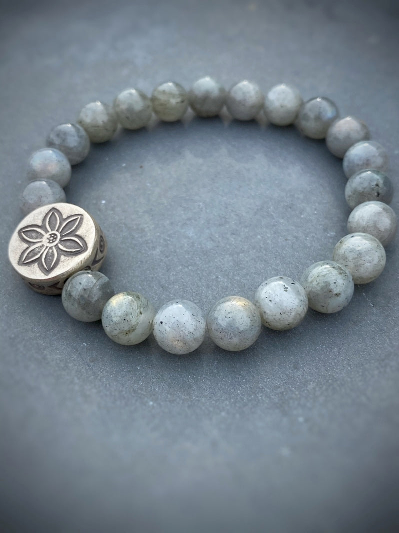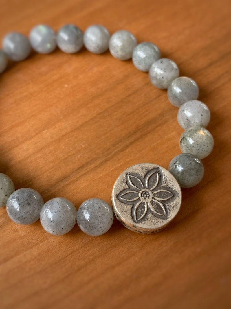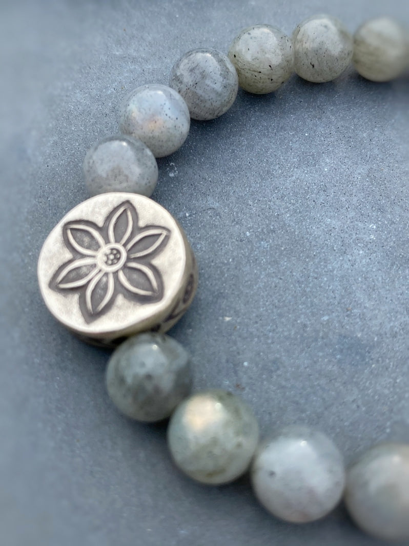Perlen: Schillernde Labradorit-Perlen mit in Thailand handgearbeiteter Echt-Silbermünze mit Blumenmotiv