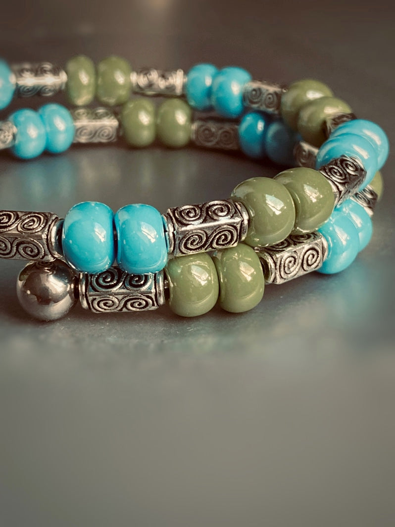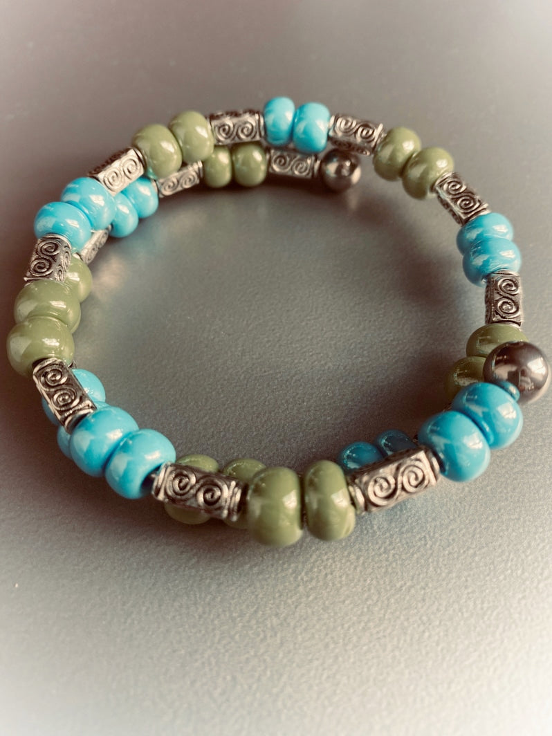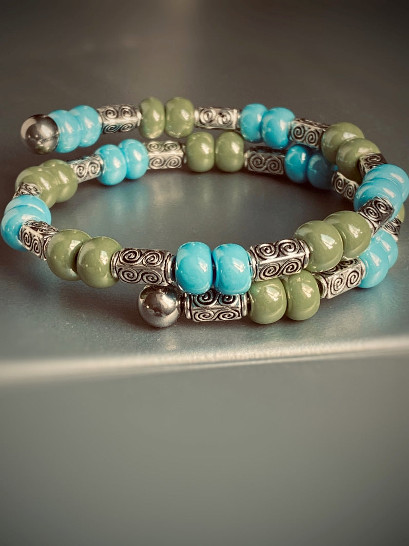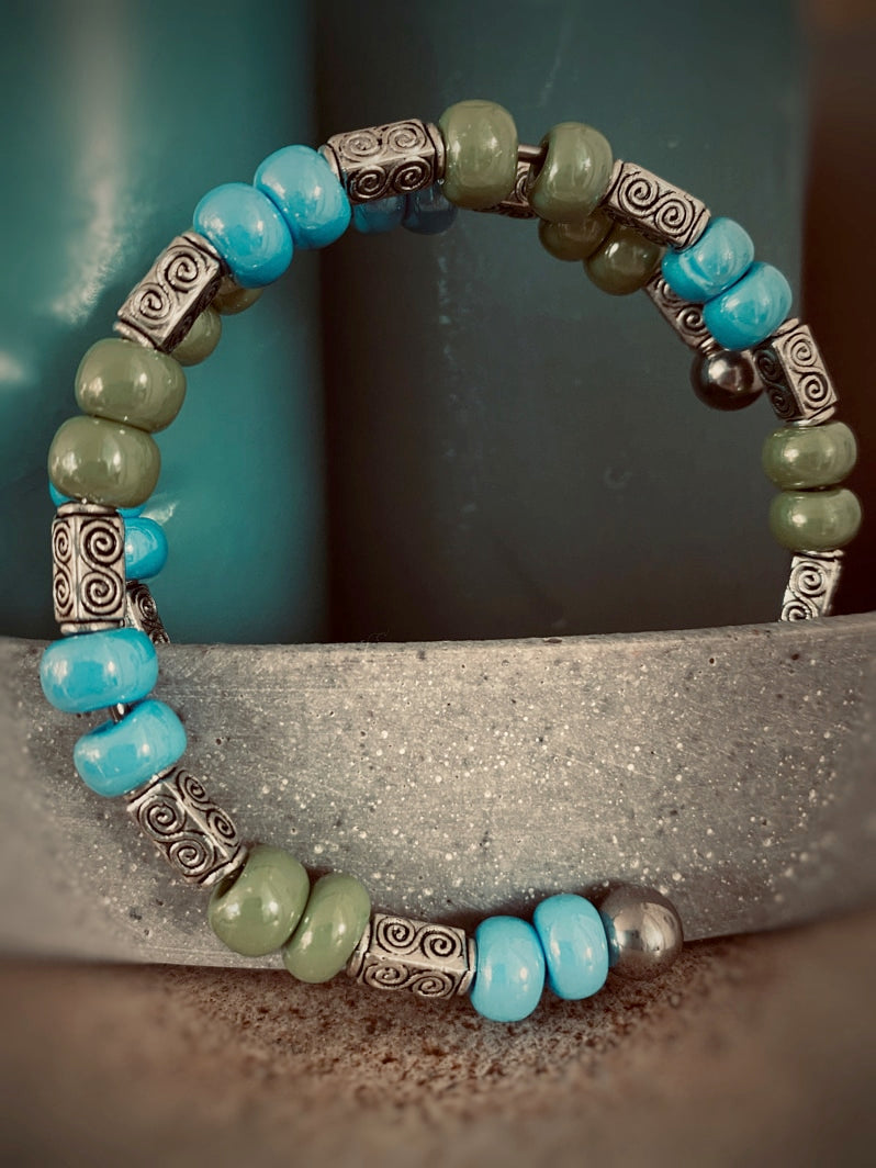 Edelstahlarmreif mit Metallornamentperlen und türkisblauen und grünen Keramikperlen