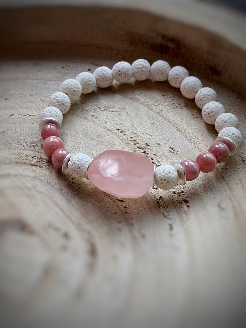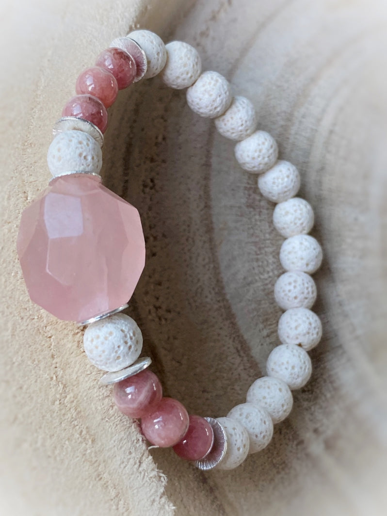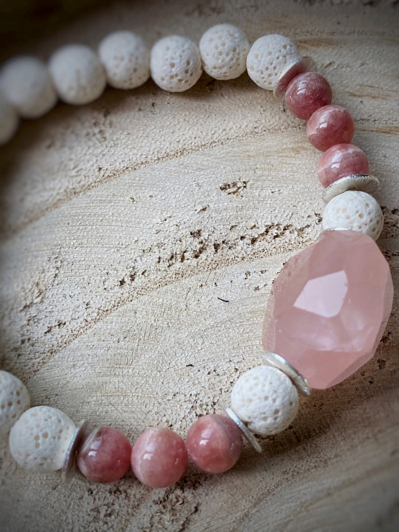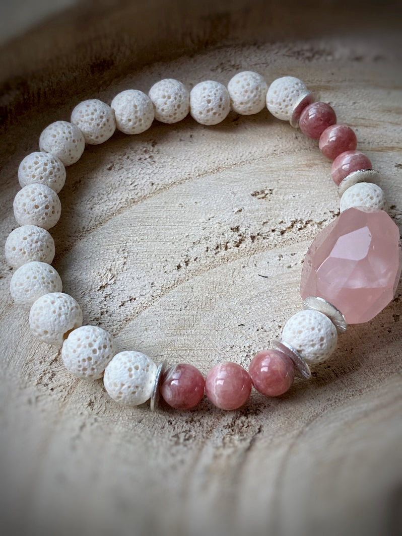 Weiße Lava mit Rhodochrositperlen, Silberelementen und facettiertem Rosenquarz als Eyecatcher