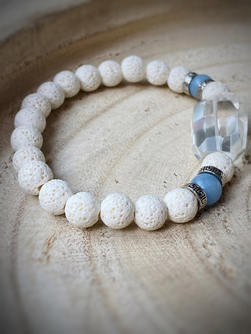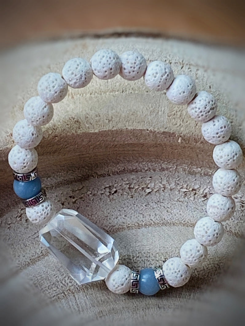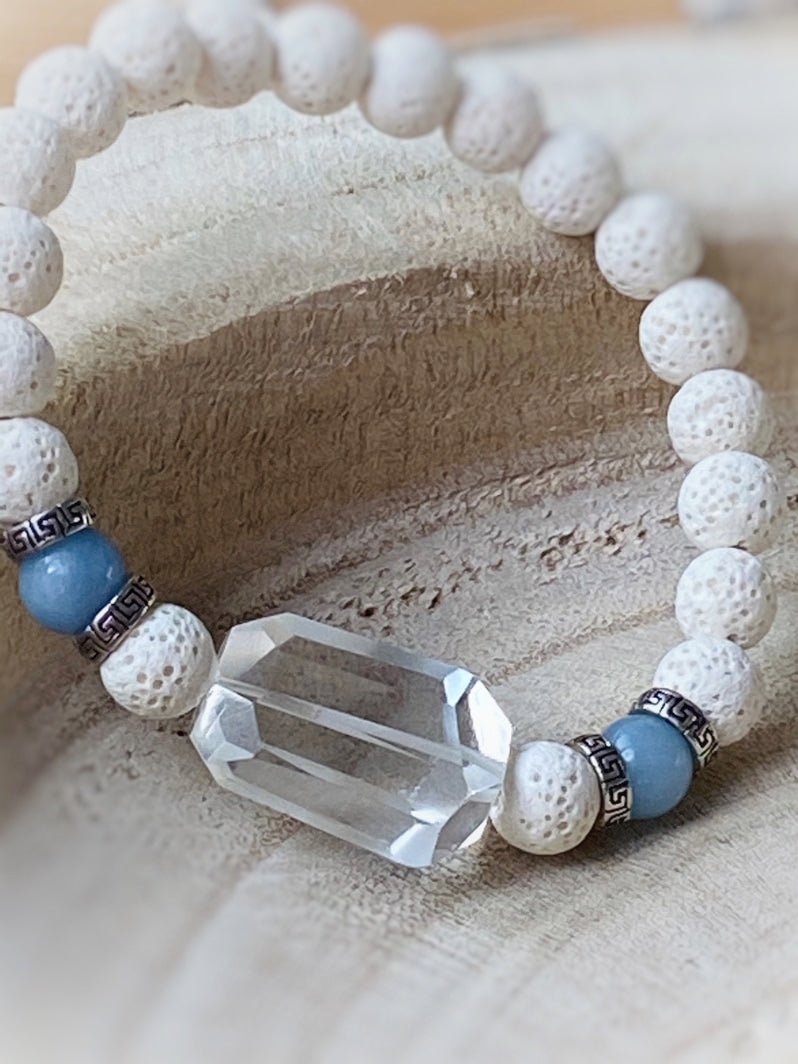 Weiße Lava mit Aquamarinperlen, Echt-Silber-Spacern aus Thailand und facettiertem Bergkristall als Eyecatcher