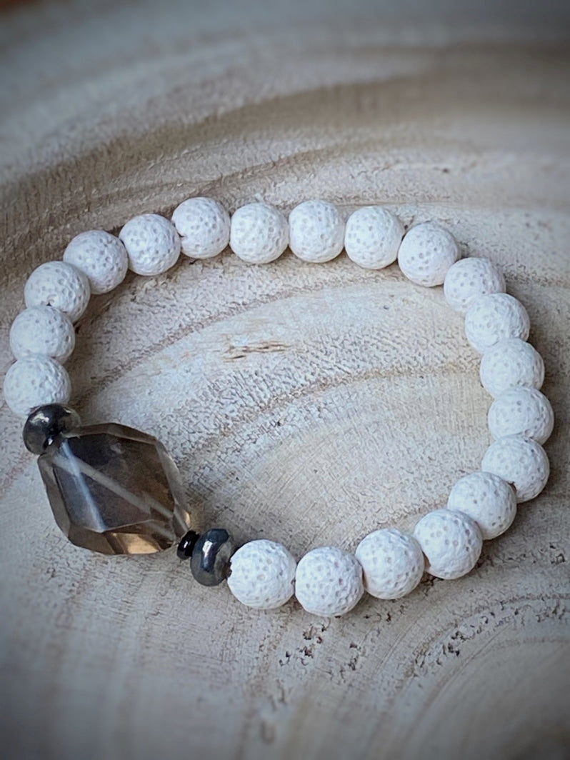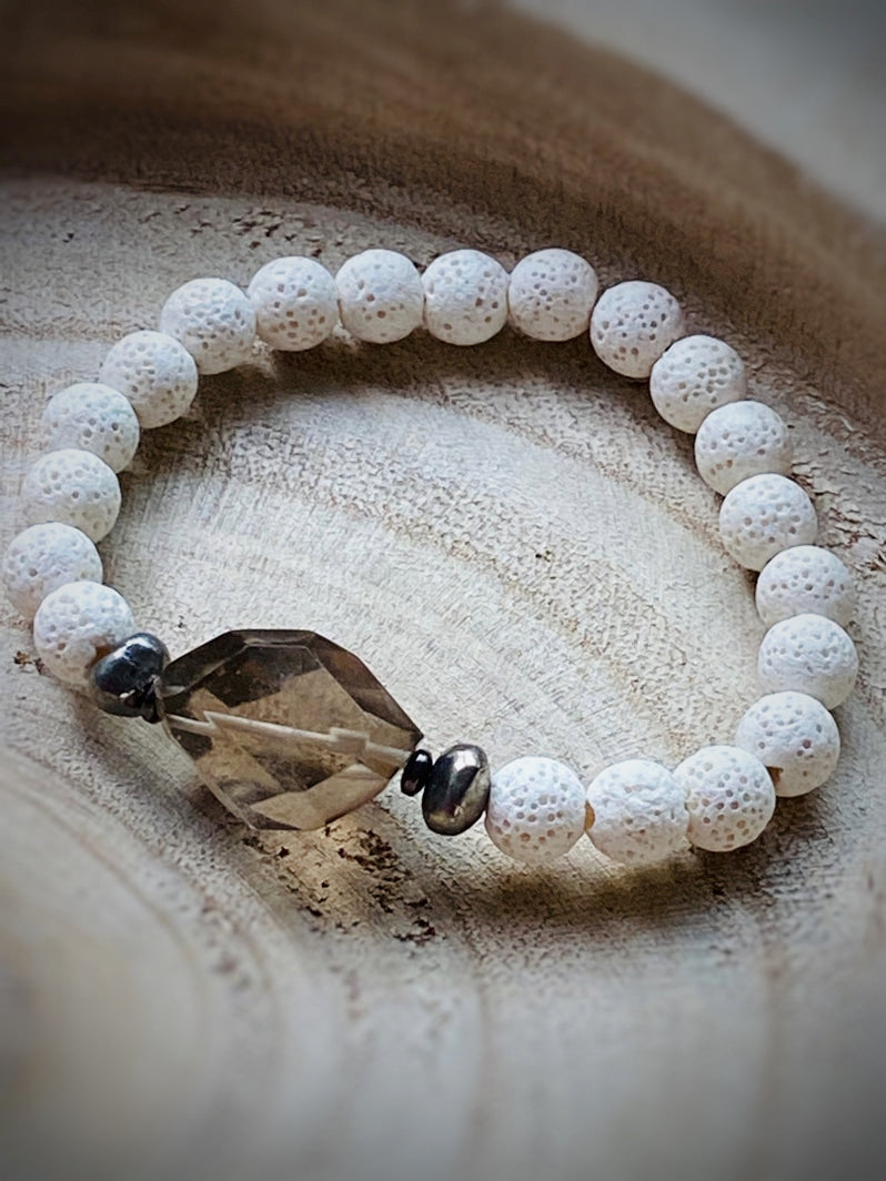 Weiße Lava mit Hämatit, Pyritnuggets und facettiertem Rauchquarz als Eyecatcher