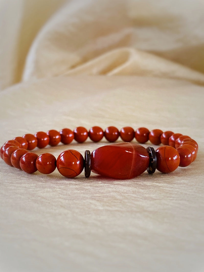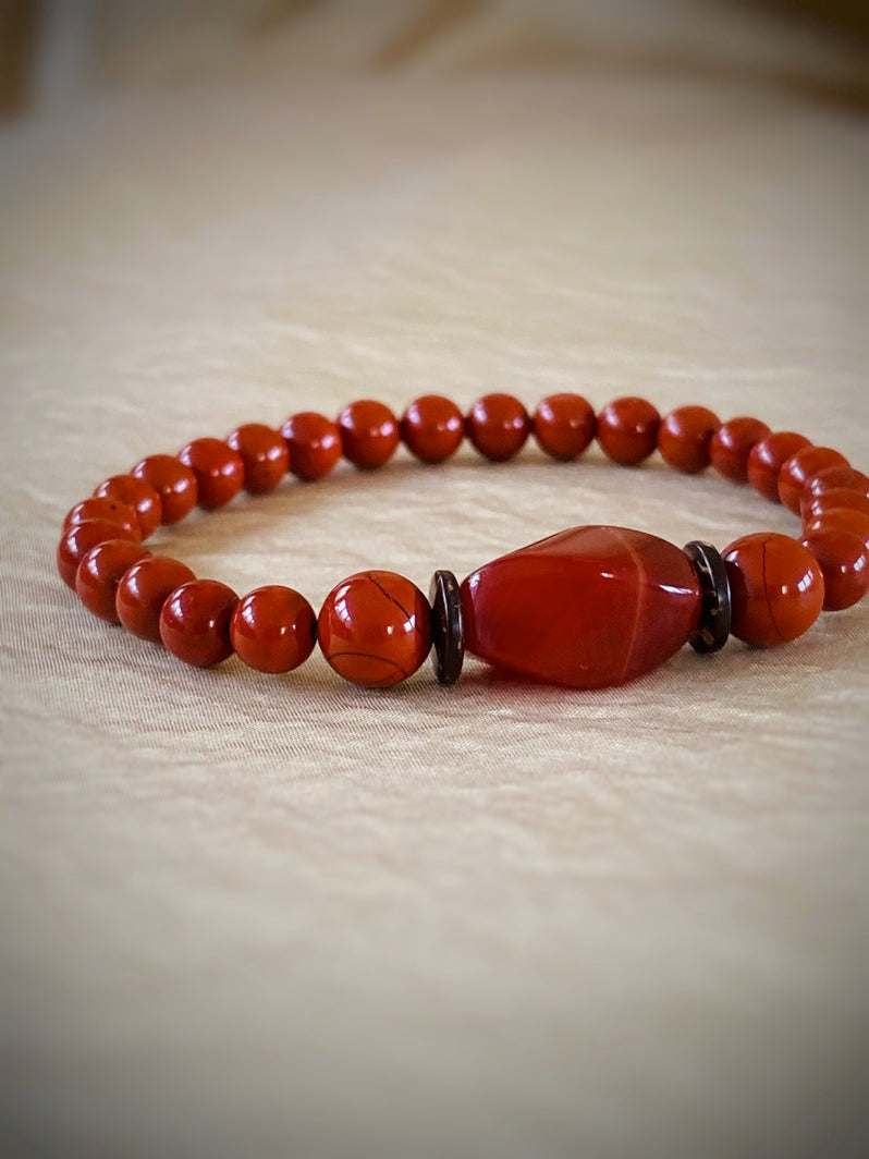 Roter Jaspis soll innere Harmonie, Zufriedenheit und Verständnis bringen. Er kann von Blockaden und äußerer Einflussnahme befreien. Zudem wird ihm auch nachgesagt, dass er für mehr Mut sorgt und die Willenskraft stärkt. In Problemsituationen wirkt er förderlich auf die Konfliktbereitschaft. Der rote Jaspis schenkt wieder Energie und regt dazu an, mit Tatkraft an der Umsetzung der eigenen Ziele und Ideen zu arbeiten. Achat bringt Geduld, Ausdauer und Selbstbewusstsein.