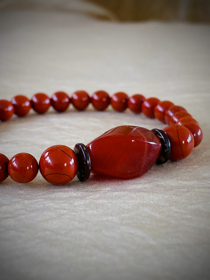 Perlen: Roter Jaspis 6mm, Palmholzscheiben, gedrehte Achat-Olive
