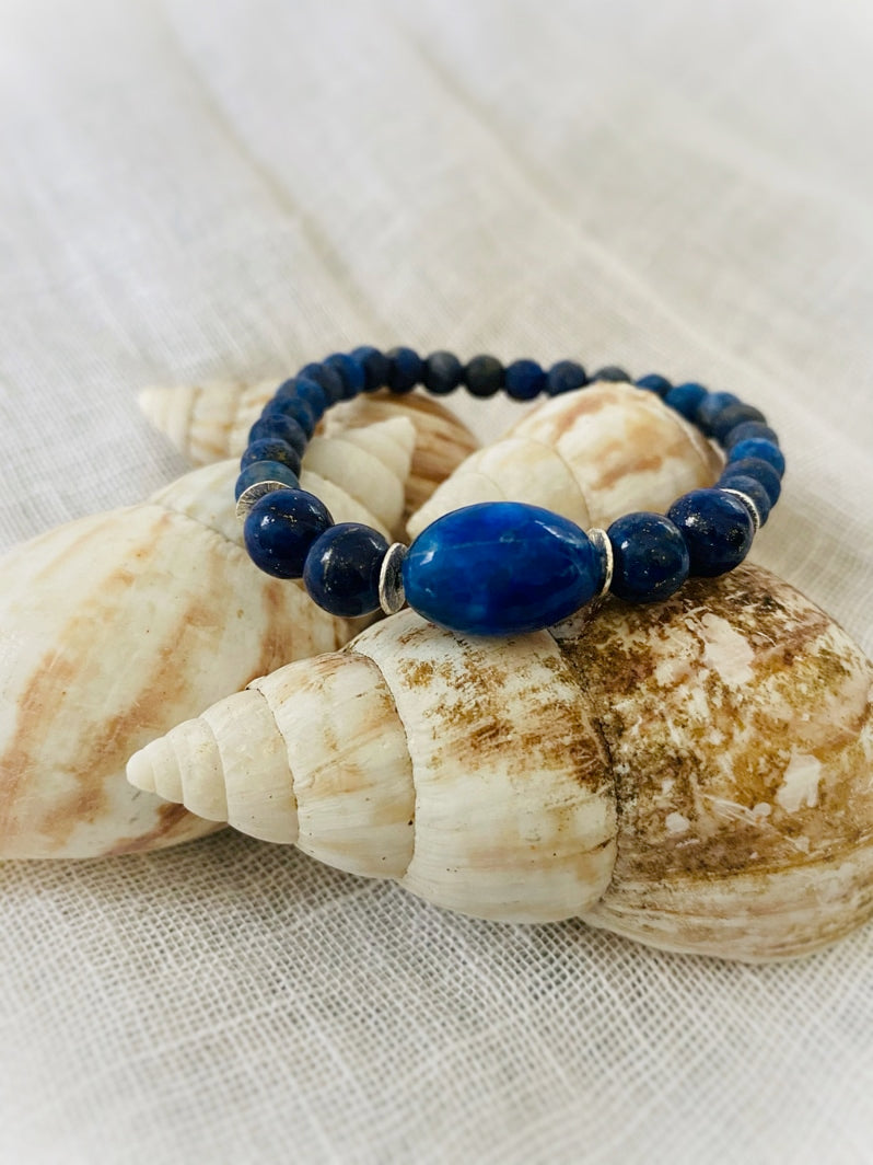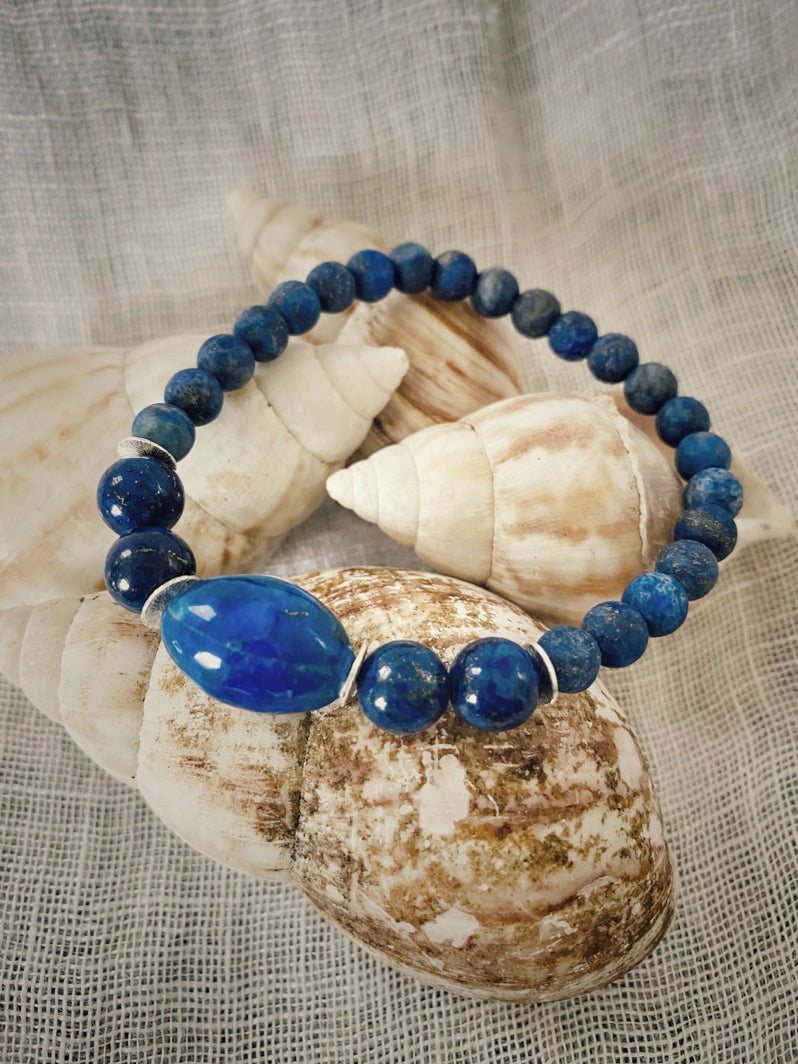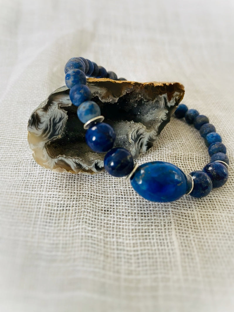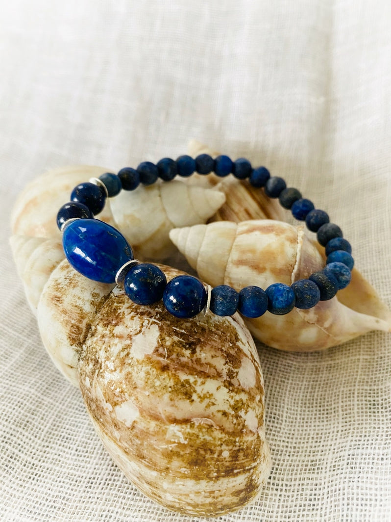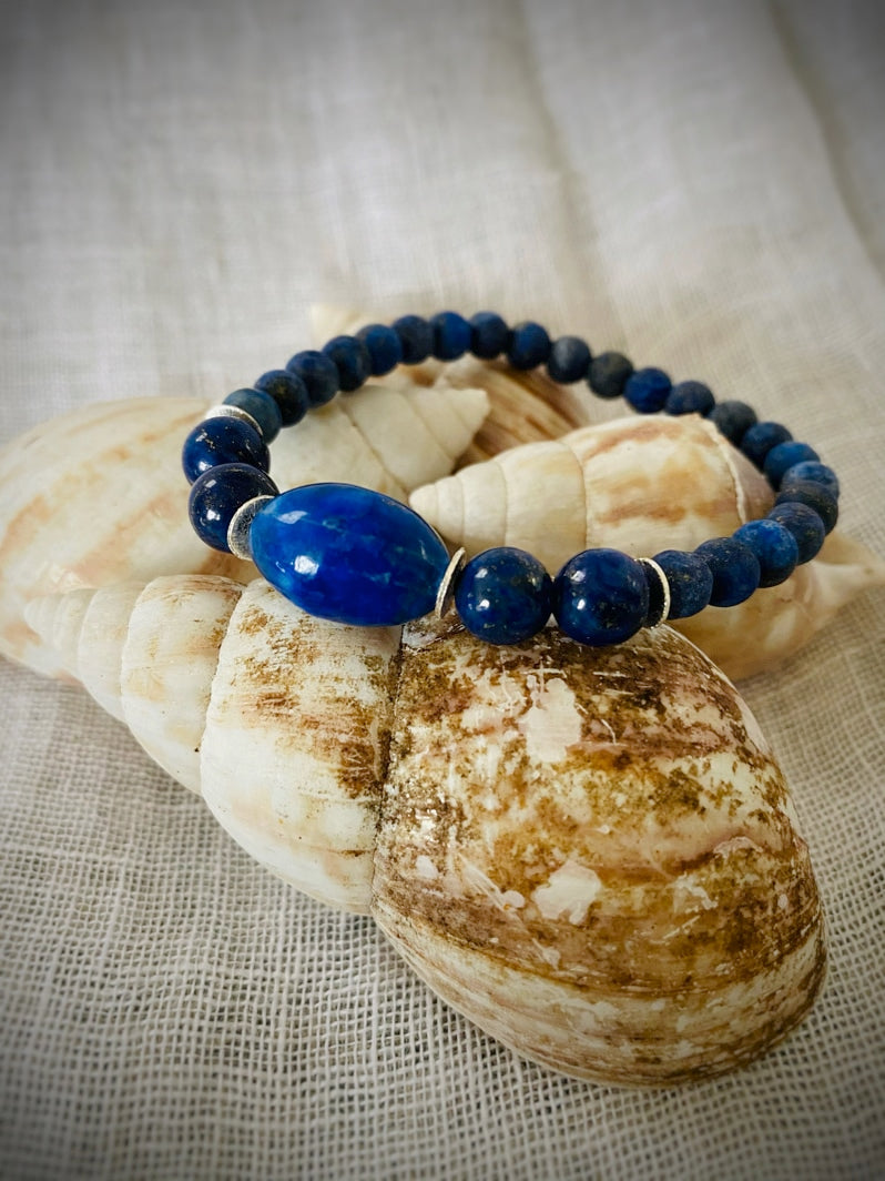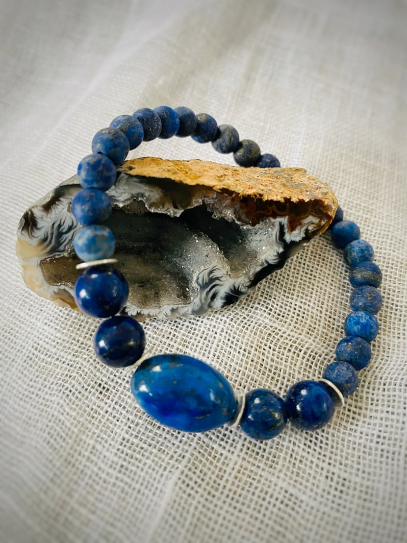 Perlen: Matte Lapislazuli-Perlen 6mm akzentuiert mit Lapislazuli-Olive, die von versilberten Scheiben und Lapislazuli-Perlen 8mm eingerahmt ist