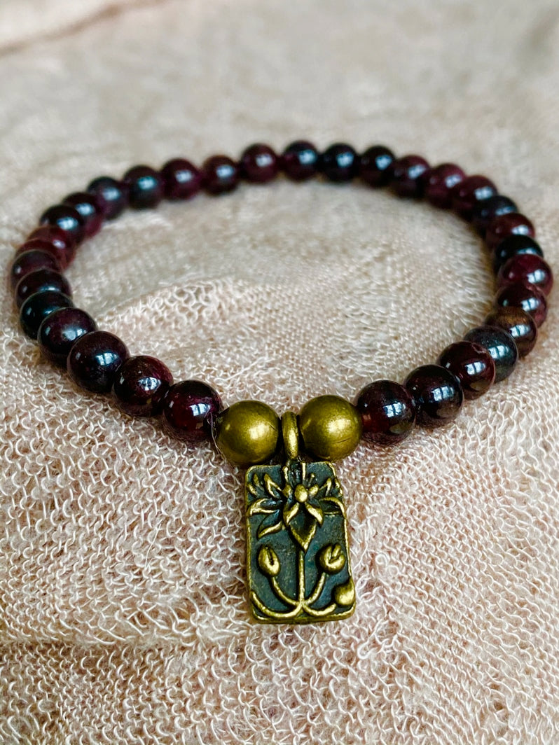 Perlen: Tiefroter Granat (6mm) mit zwei Messing-Perlen und einem Lotus-Anhänger aus Messing