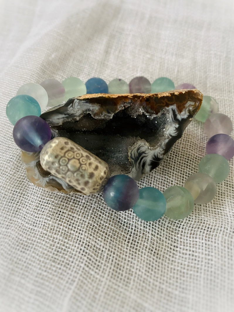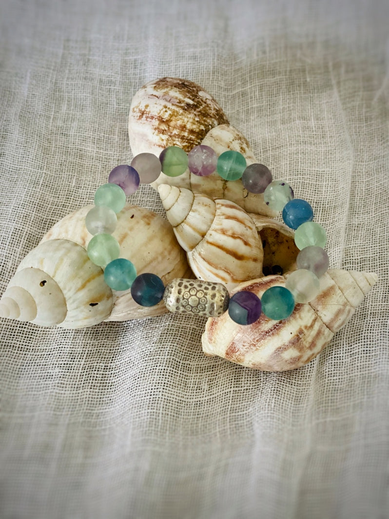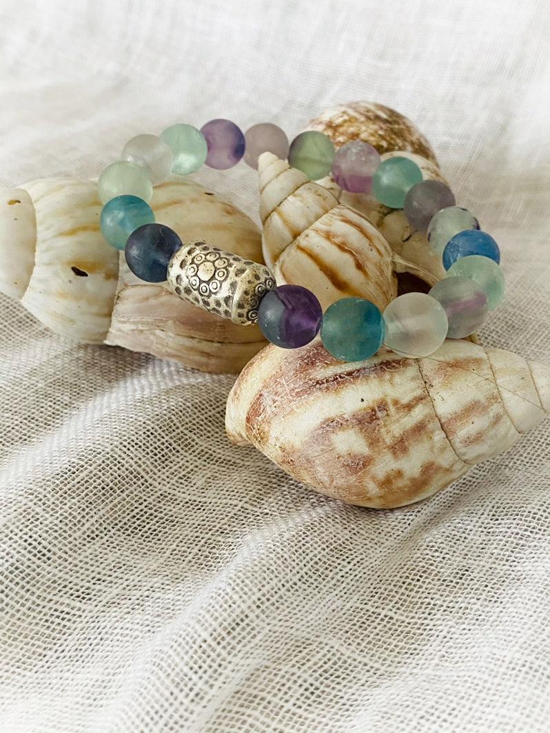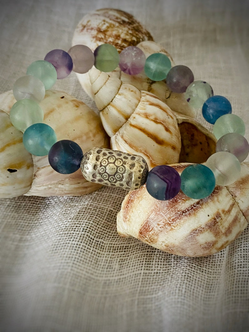 Perlen: Gefrostete Fluorit-Perlen, 10 mm mit handgearbeiteter echt silberner Schmuckperle aus Thailand