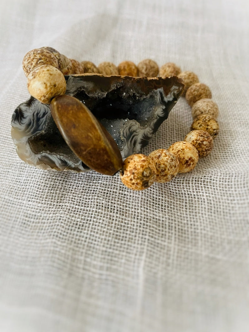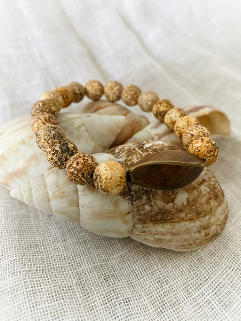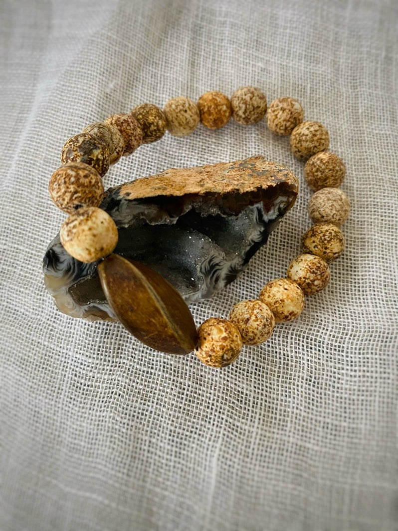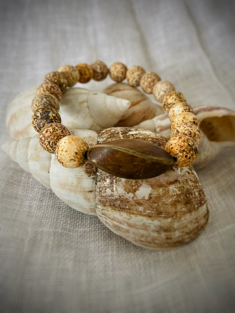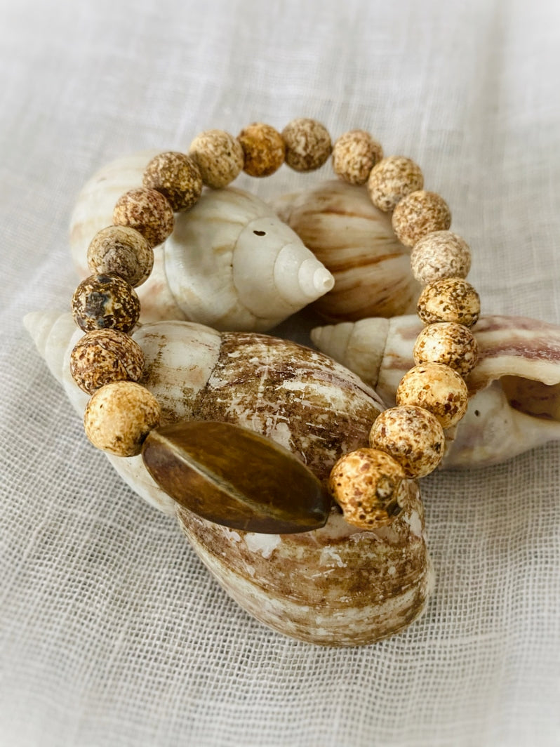 Perlen: Sandachat-Perlen 10 mm mit gedrehter brauner Hornolive