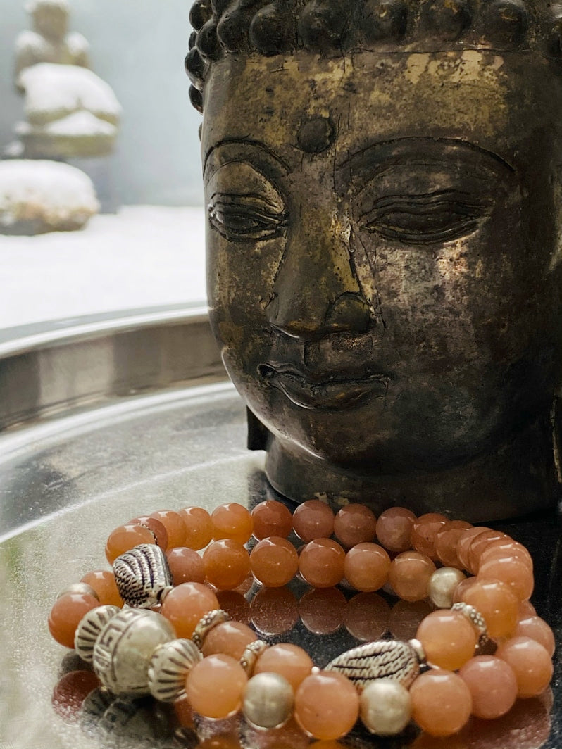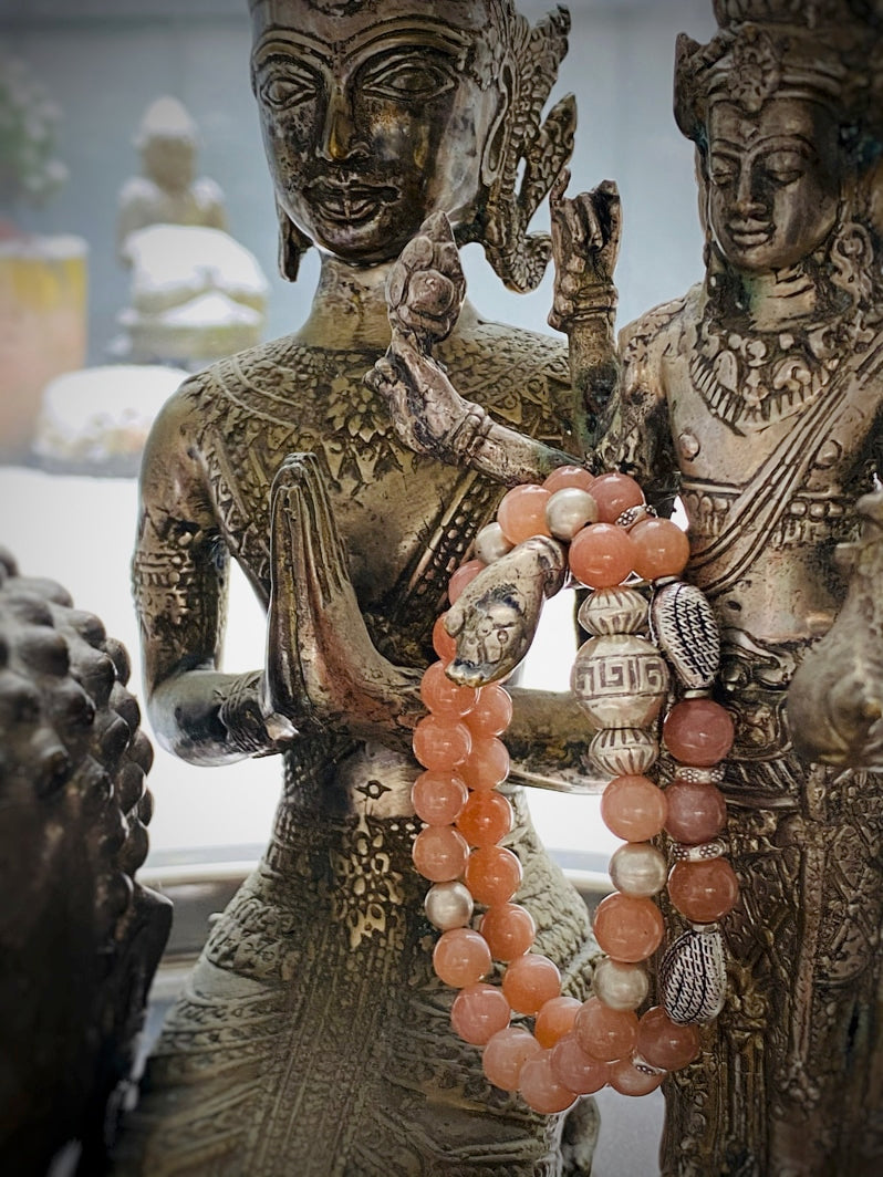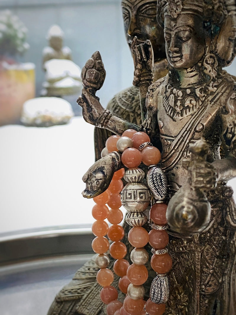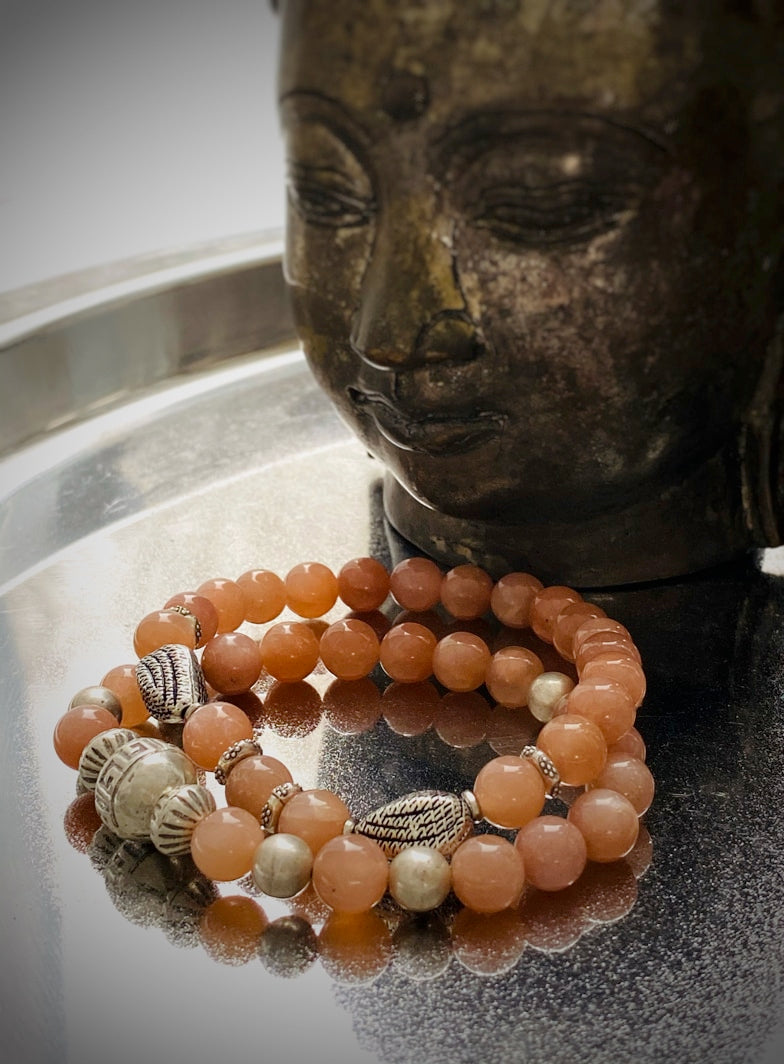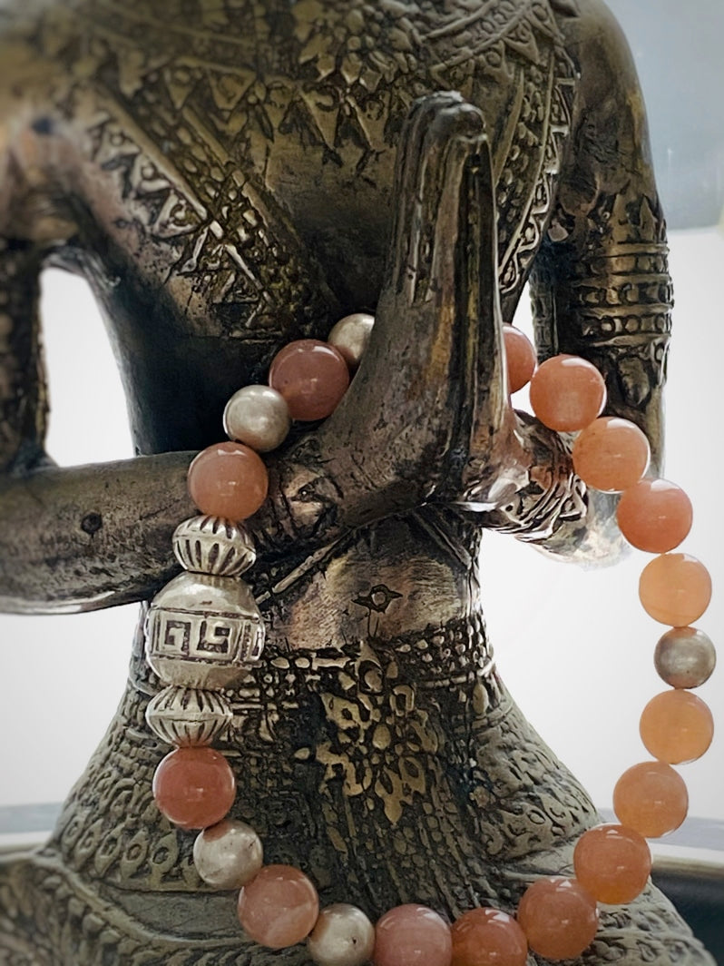 Perlen: Orangefarbener Mondstein 8mm mit handgearbeiteten Echtsilber-Perlen aus Indien, Echtsilber-Biconen 8mm und handgearbeiteter Silberkugel mit Mäander-Muster aus Thailand