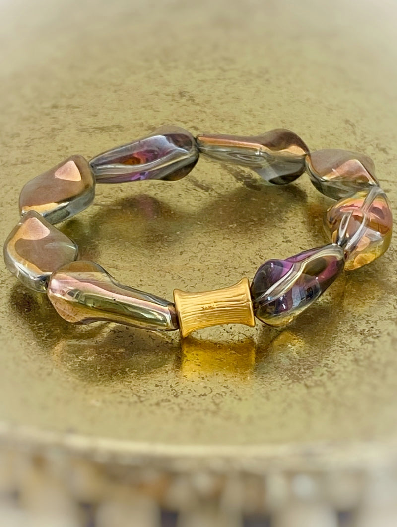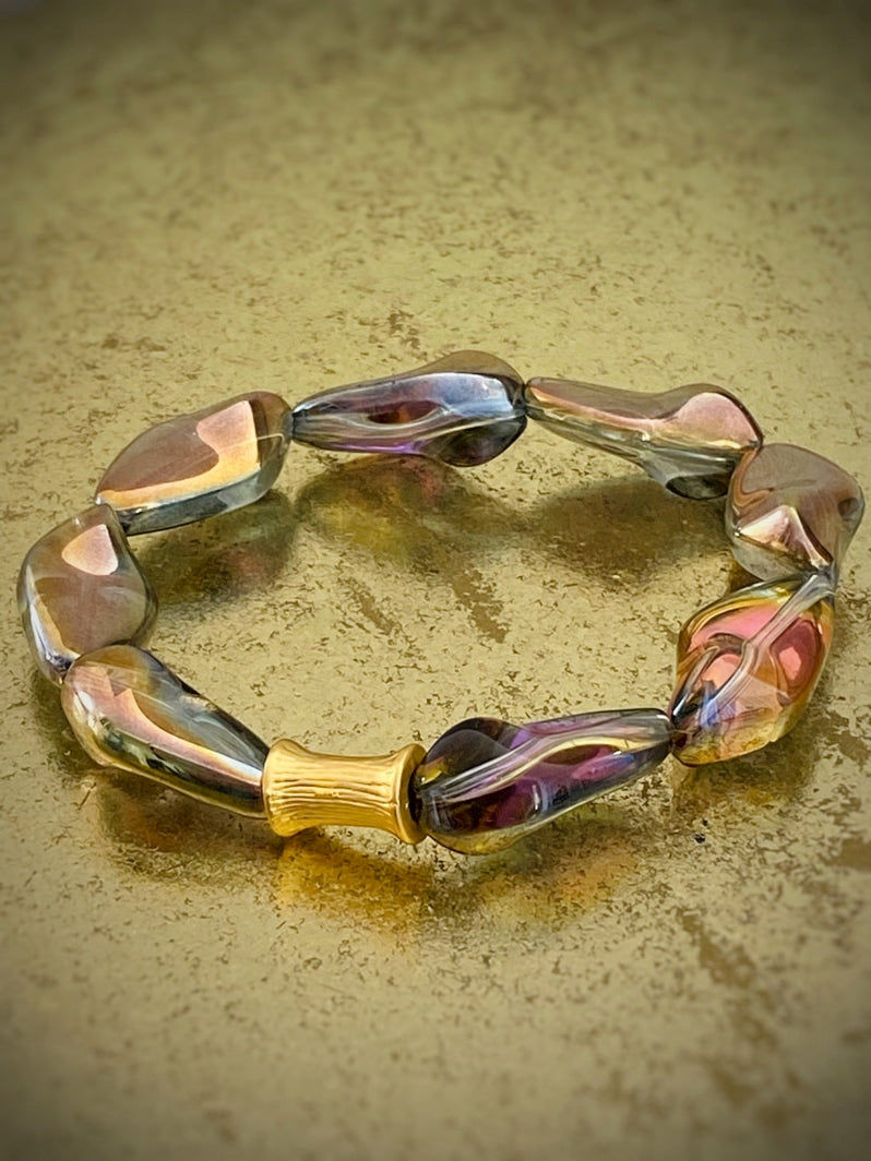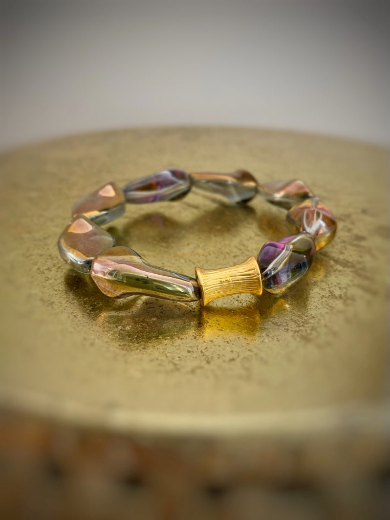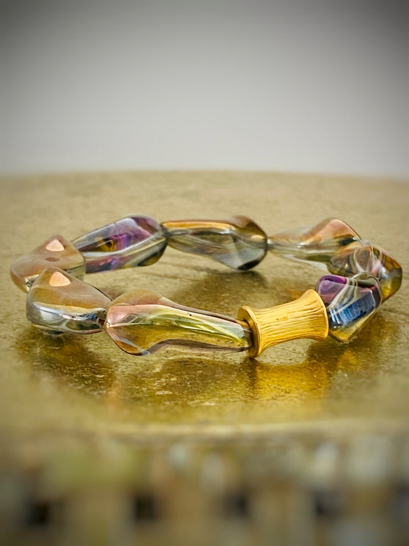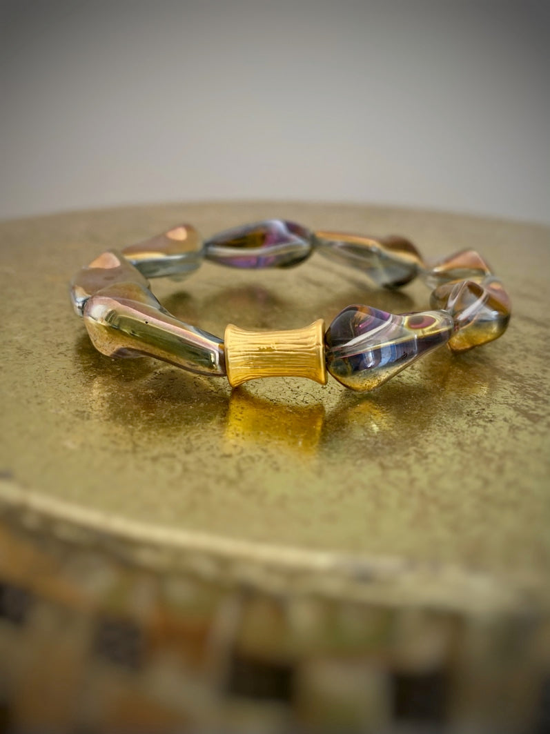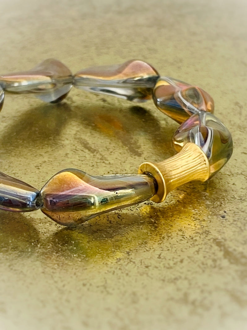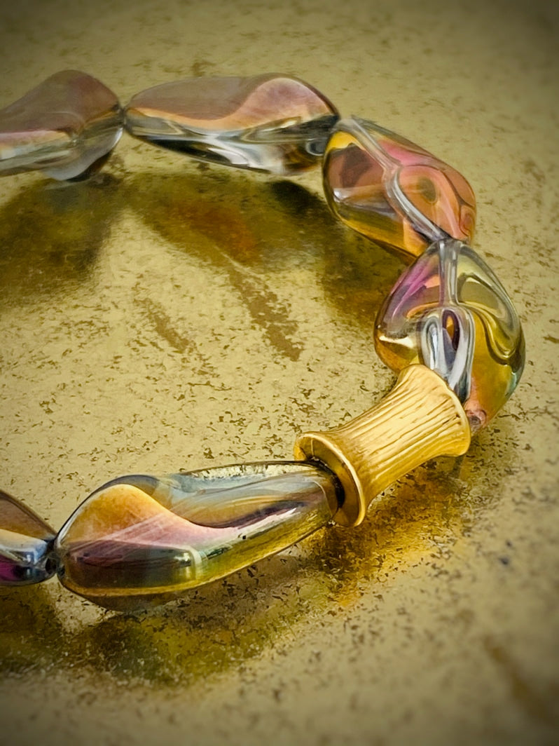 Perlen: Außergewöhnlich schöne böhmische gedrehte Glasperlen, die in Regenbogenfarben und Gold schimmern mit einer vergoldeten taillierten Röhrenperle