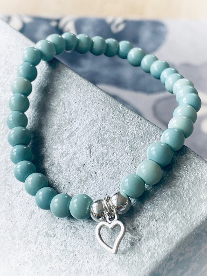 Silberfarbener Herz-Anhänger eingerahmt von 2 silberfarbenen Metallperlen