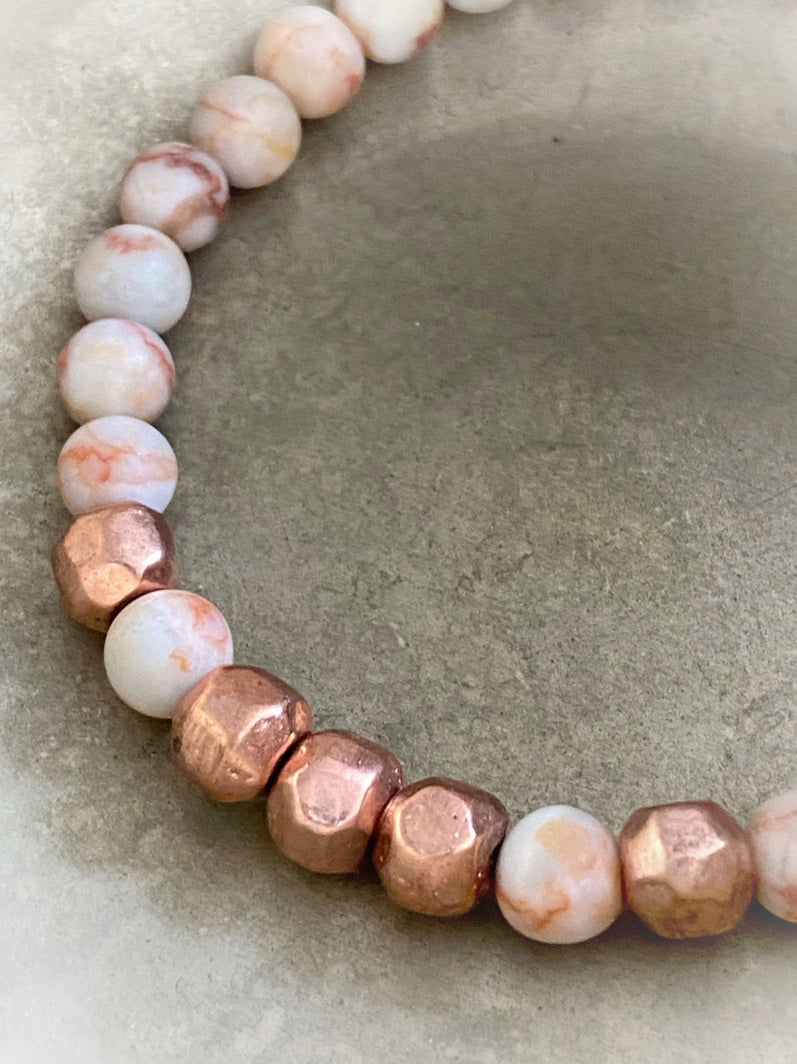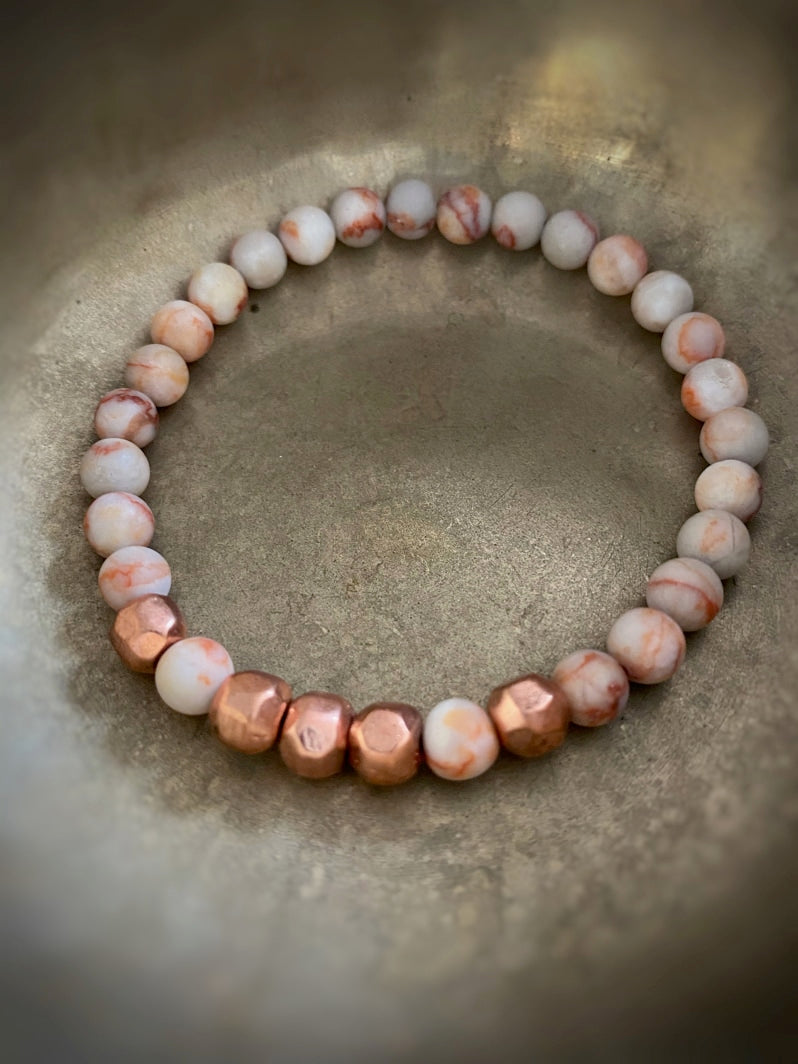 Perlen: Roter matter Bänder-Jaspis 6mm mit facettierten kupferfarbenen Metallperlen