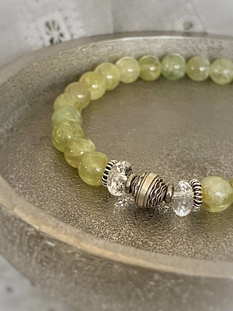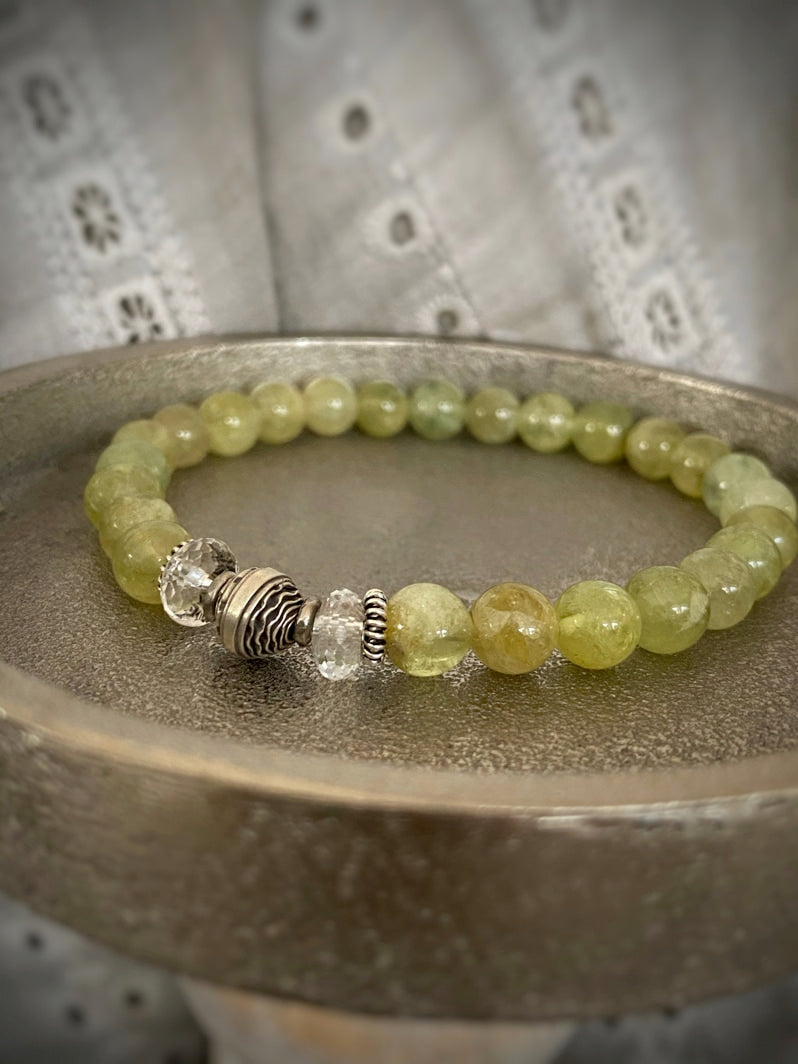 Perlen: Wunderschöner grüner Granat 6mm, Silberspacer, Bergkristall-Rondelle und handgearbeitete Silberperle aus Thailand