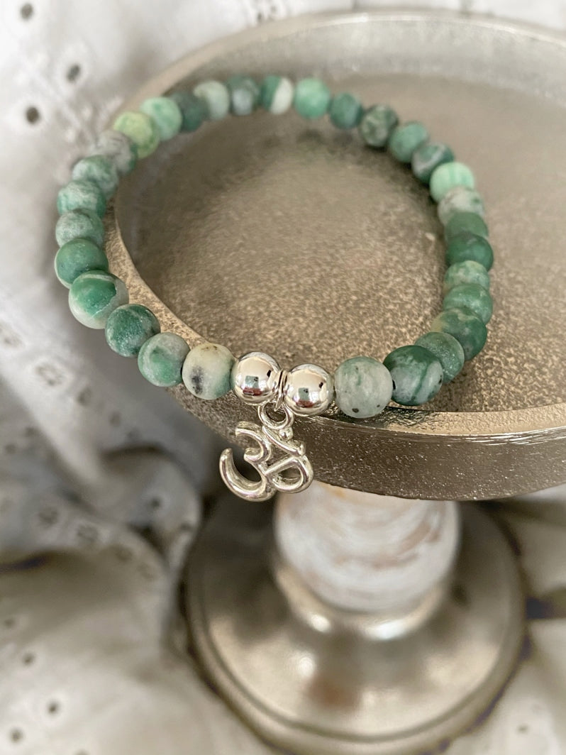 Perlen: Matte grüne Jade, 6mm, mit in silberfarbenen Perlen gerahmtem OM-Anhänger