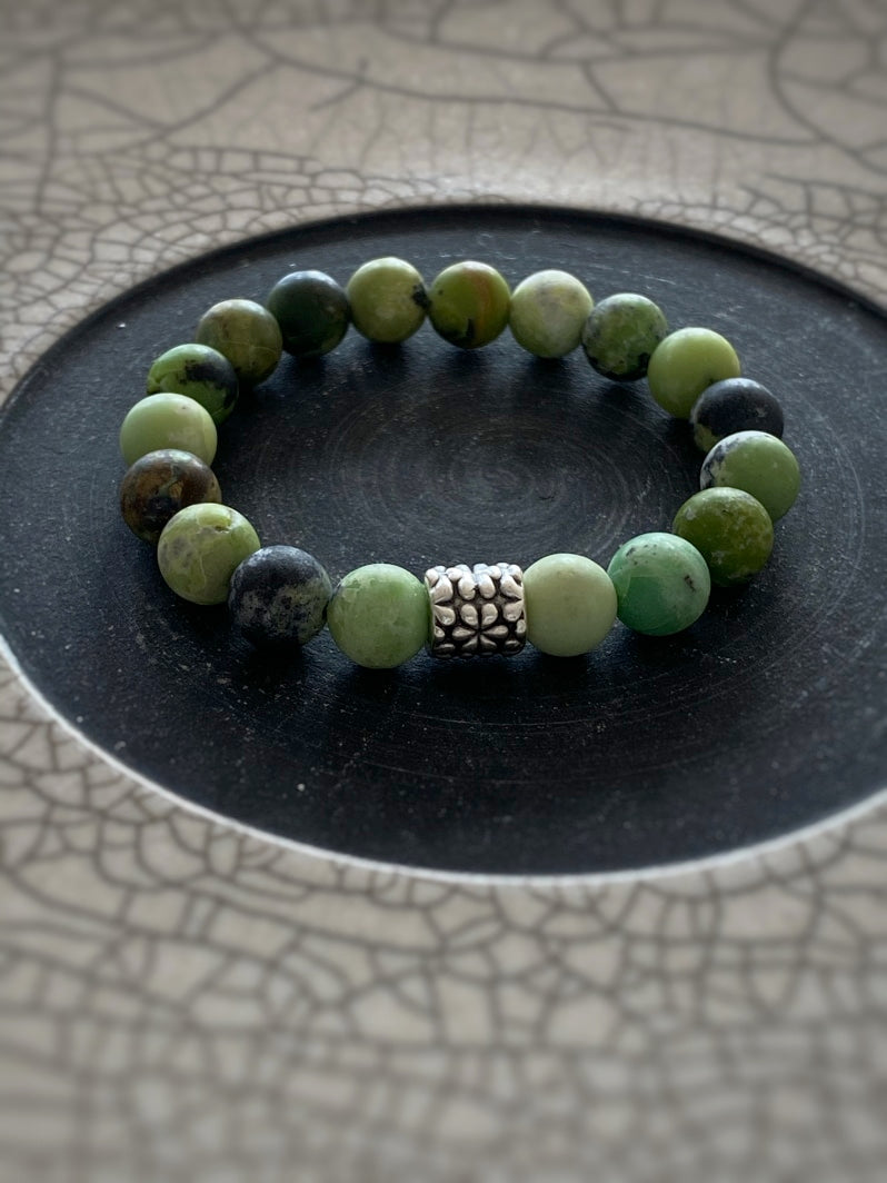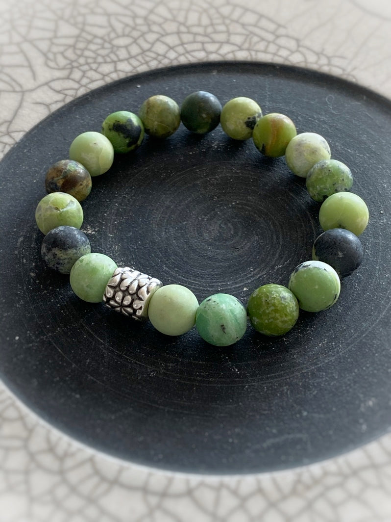 Perlen: Chrysopras matt 10mm mit silberfarbener Rolle mit Blumenmuster