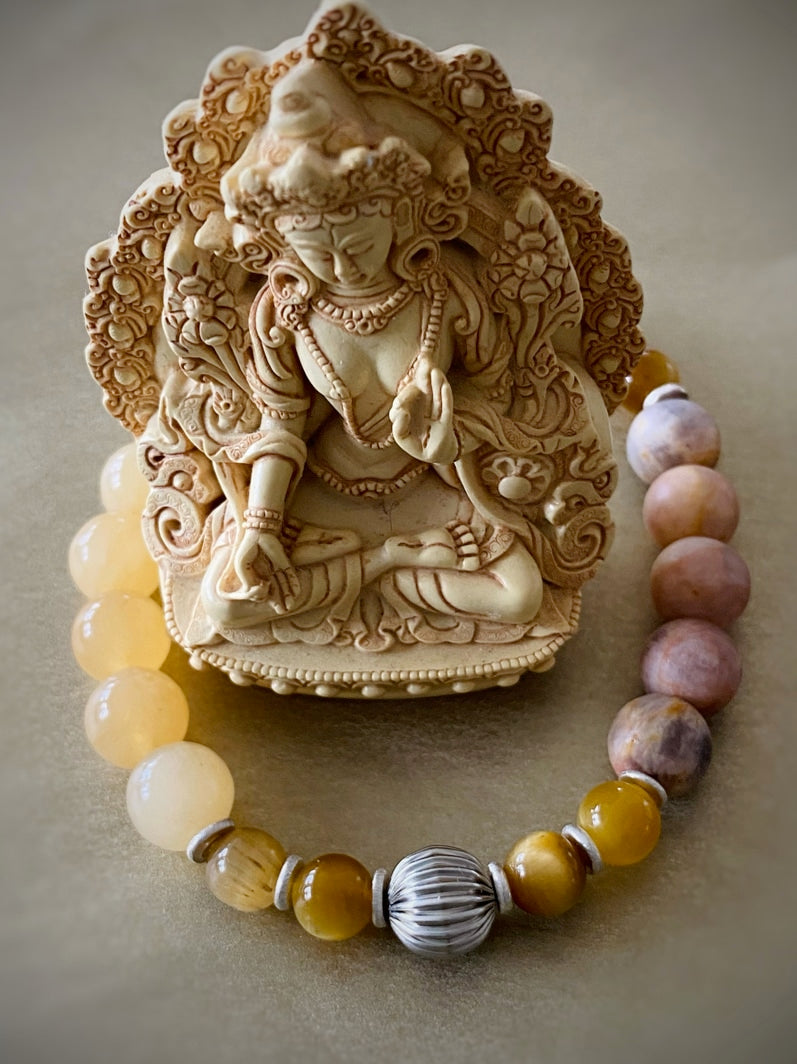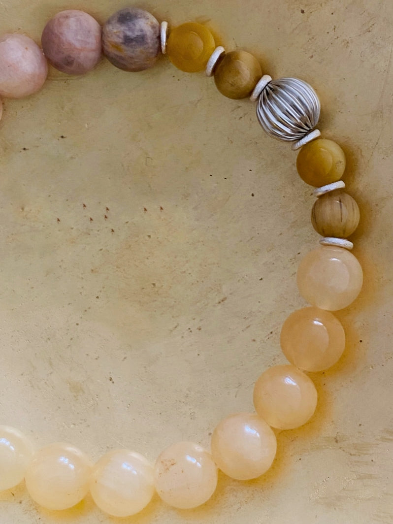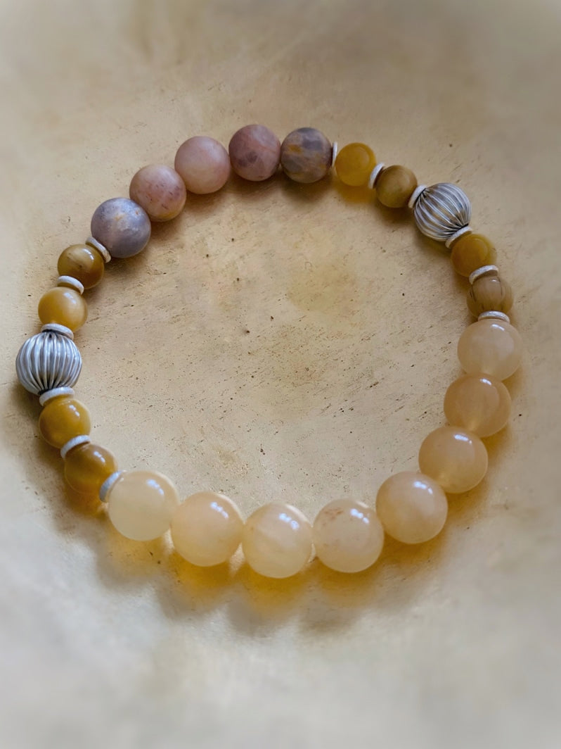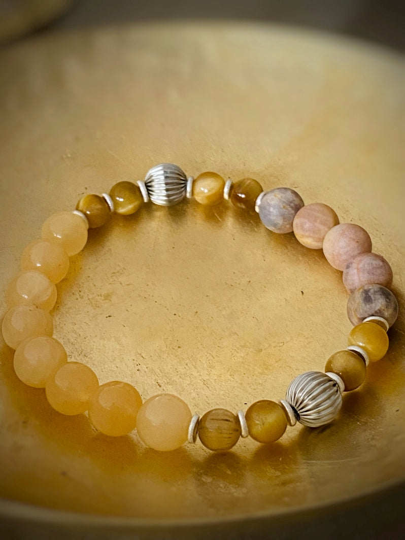 Perlen: Gelber Mondstein matt 8mm, Orangen-Calcit 8mm, Silberfarbene Metall-Melonen 8mm, Gelbes Tigerauge 6mm, Handgearbeitete Silberscheiben aus Thailand