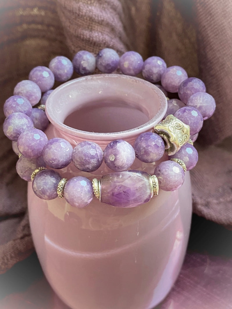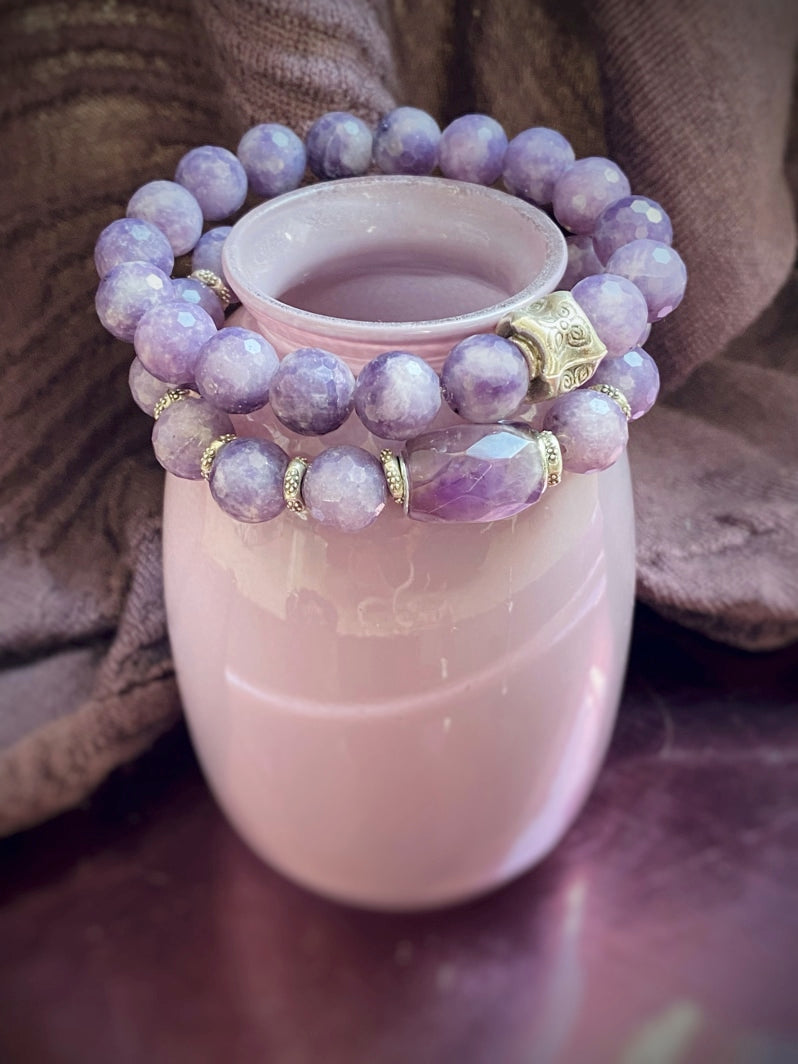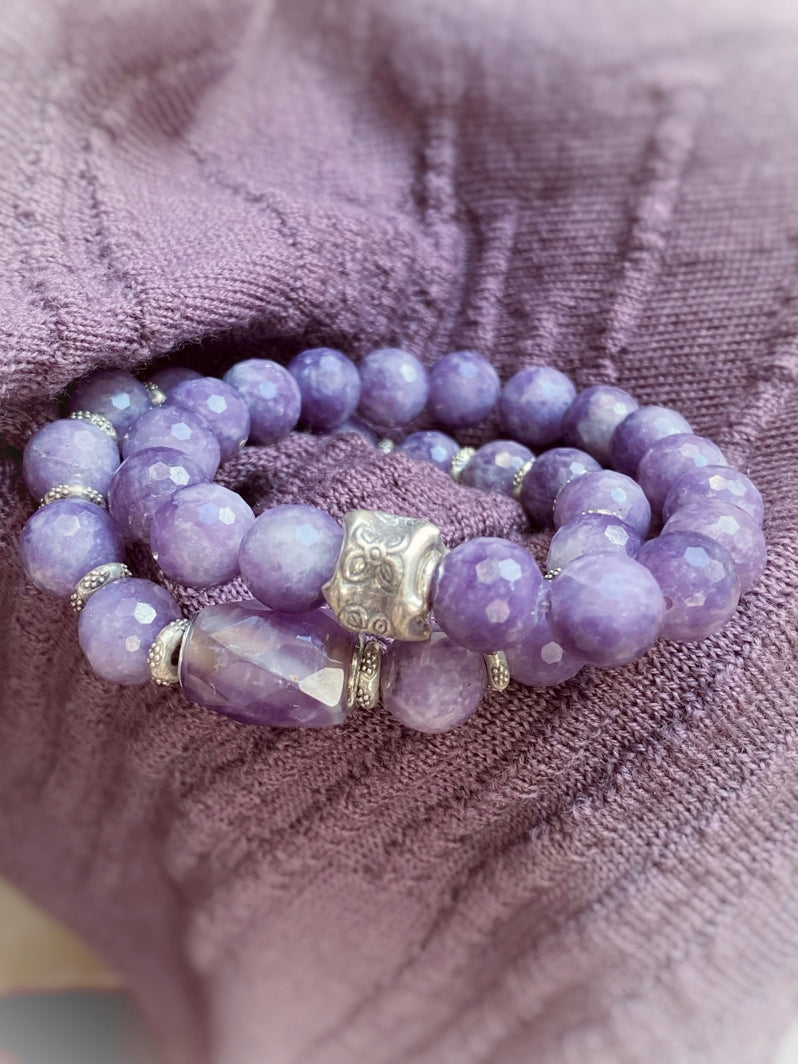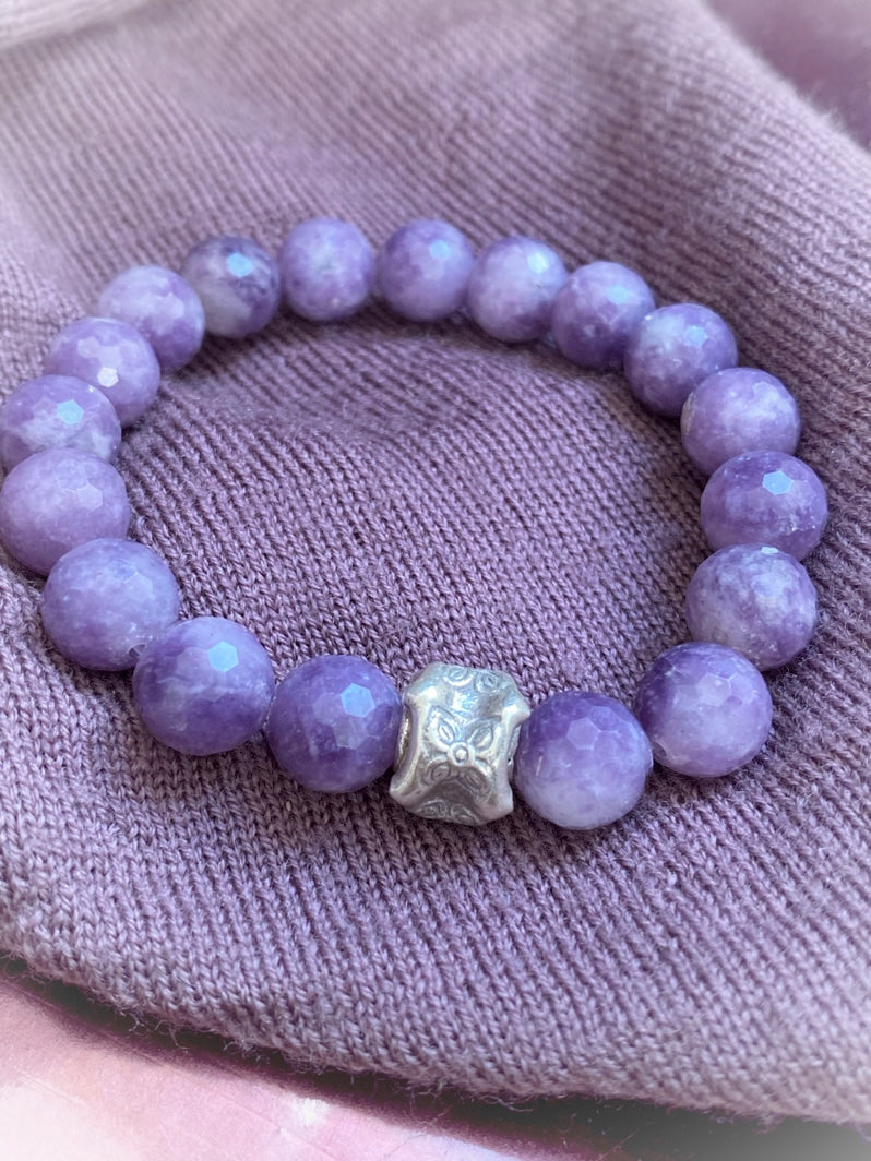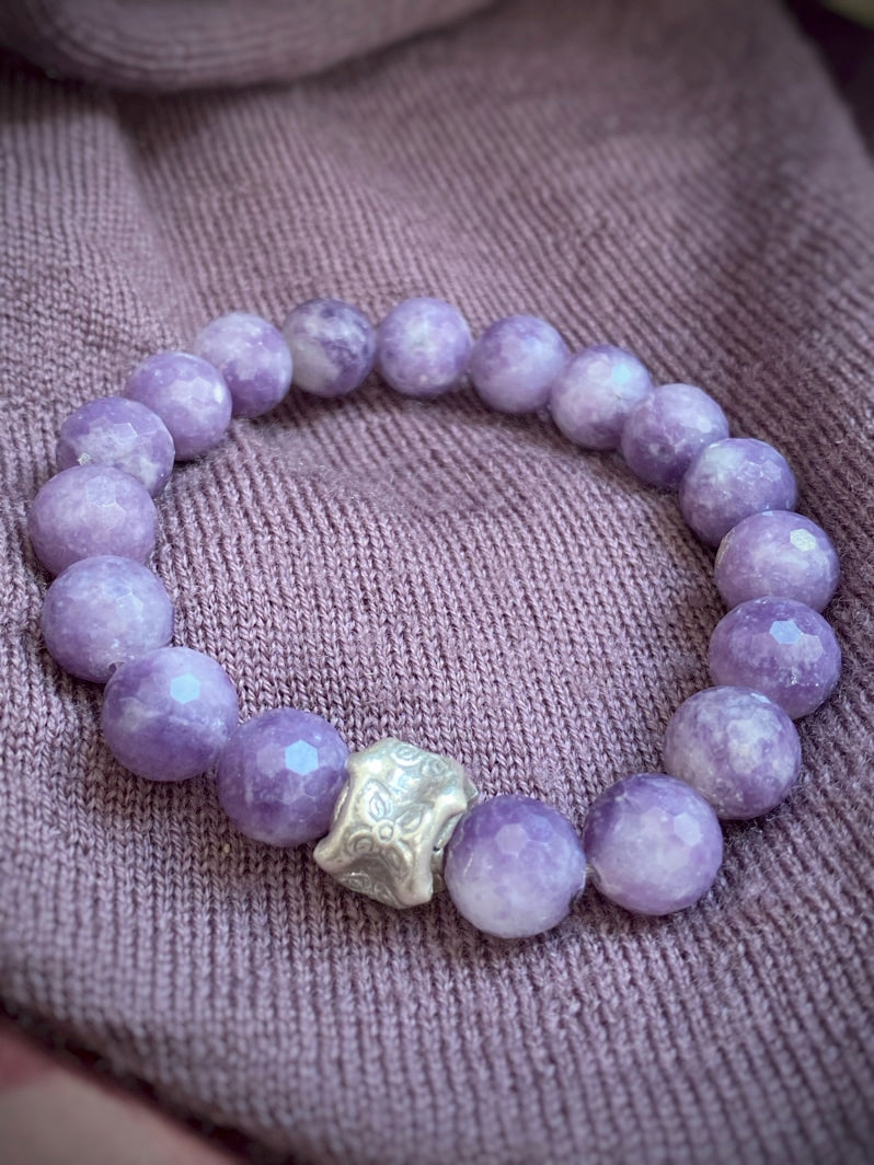 Perlen: Facettierter Lepidolith 10mm mit handgearbeiteten verzierten Silberringen und wunderschöner Zierperle aus Thailand