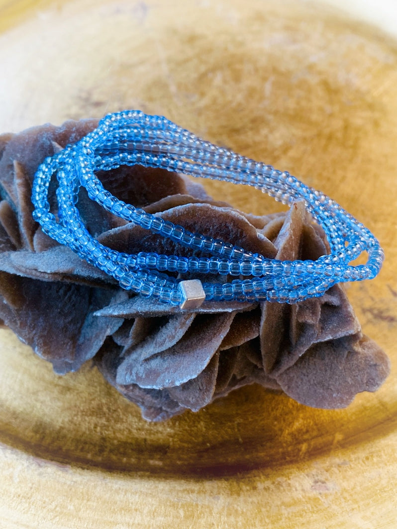 Wunderschöes Boho-Wickelarmband mit himmelblauen japanischen Rocailles-Perlen und silberfarbenem Würfel