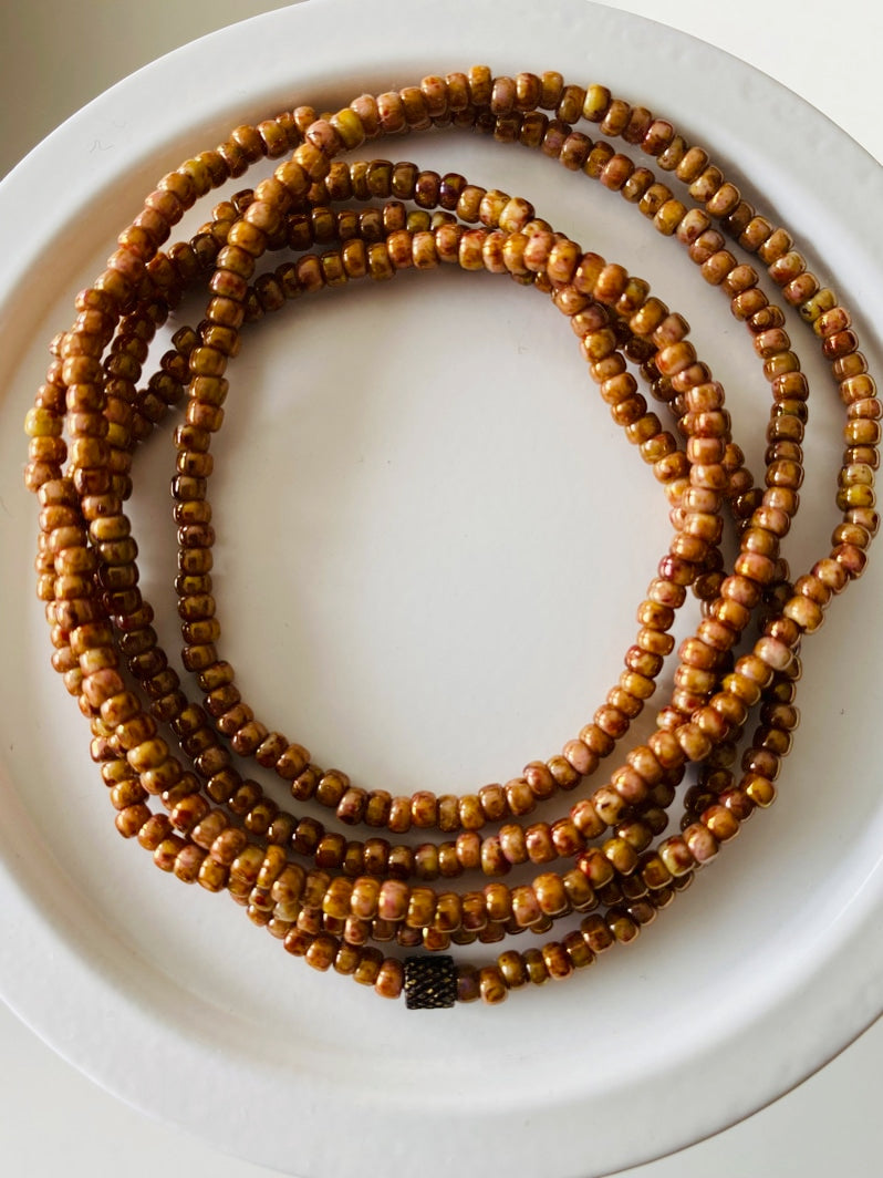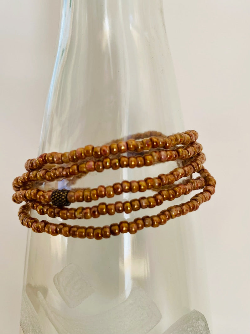Wickelarmband mit japanischen Rocailles-Perlchen in Rosé-Goldtönen und handgearbeiteter afrikanischer Messingrolle