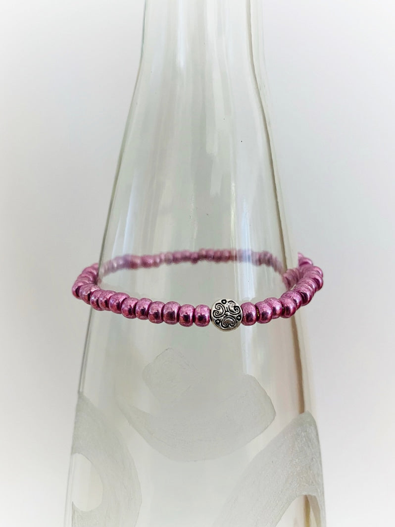 Wickelarmband mit japanischen Rocailles galvanized dusty orchid mit silberfarbener gravierter Münze