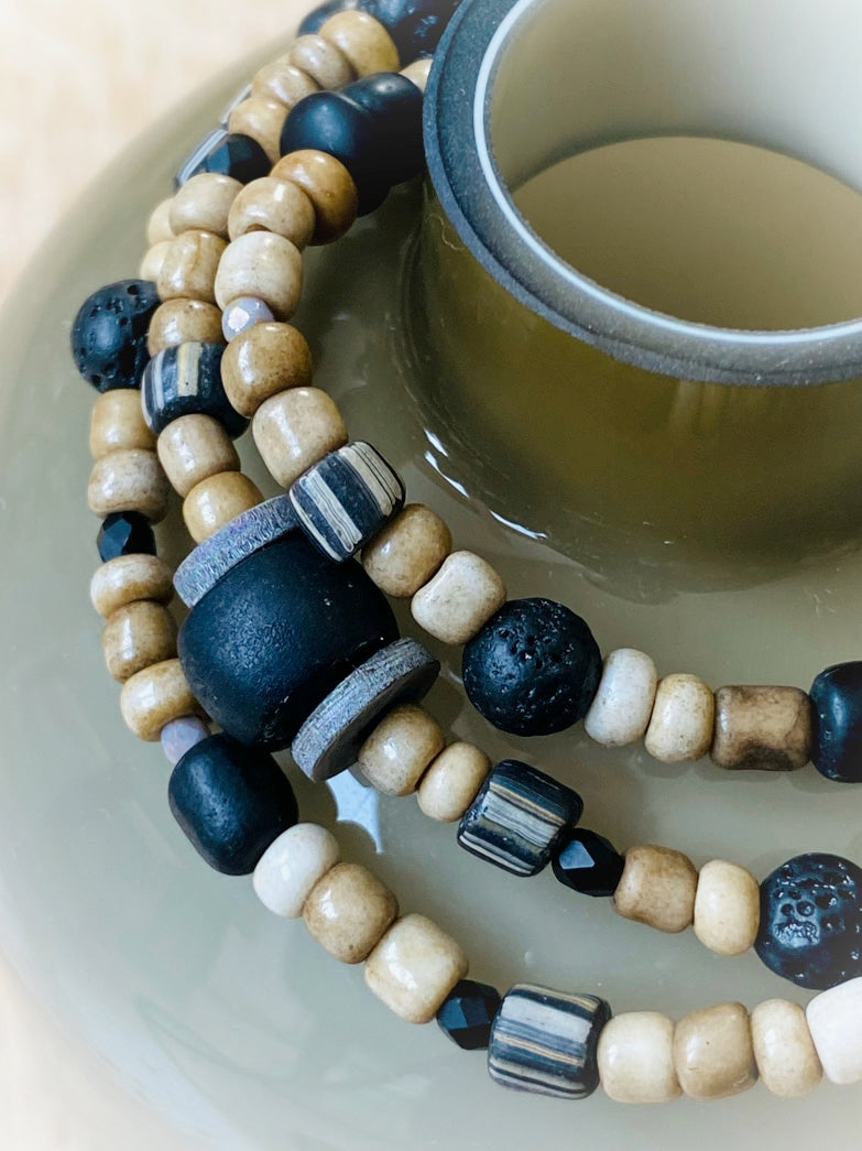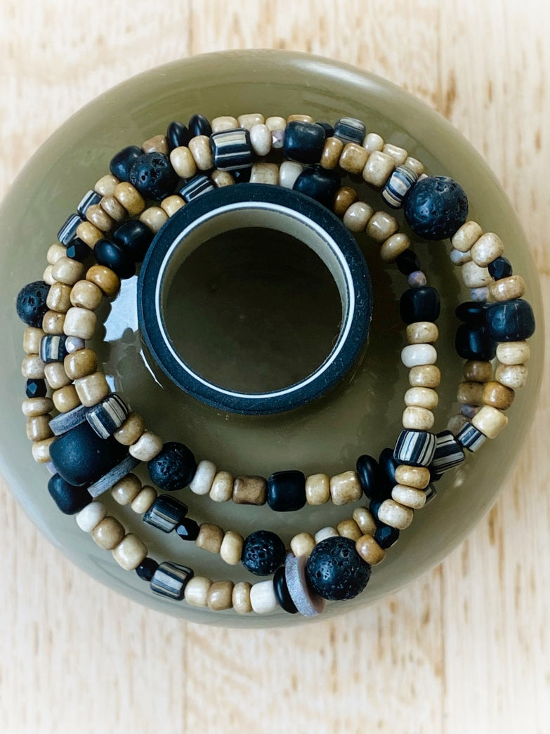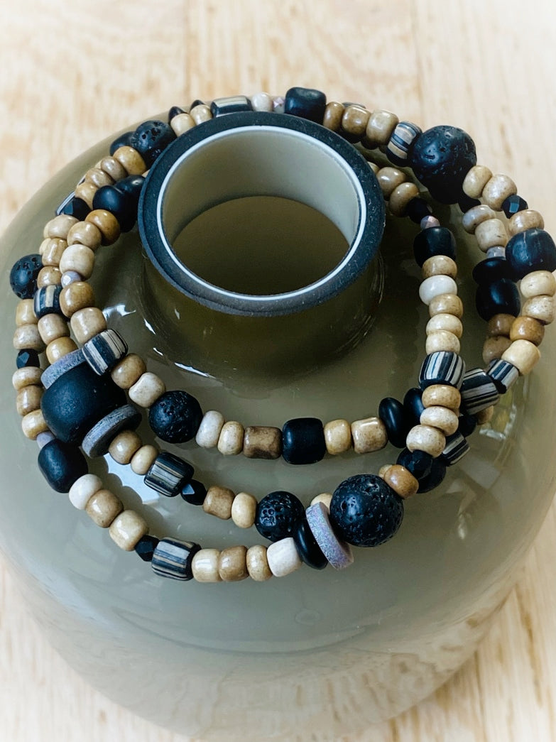 Wickelarmband mit indonesischen Seedperlen in sandbeige mit verschiedenen schwarzen Perlen aus Glas, Holz, Onyx, Keramik, Lava und Muschelscheiben