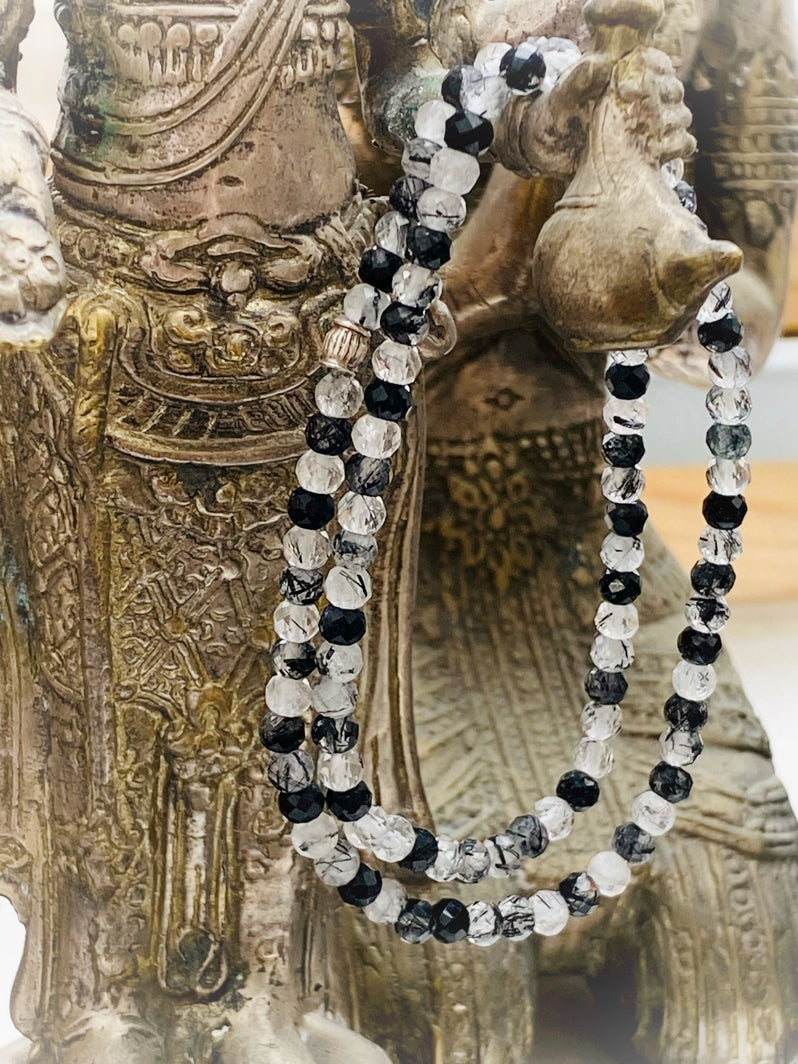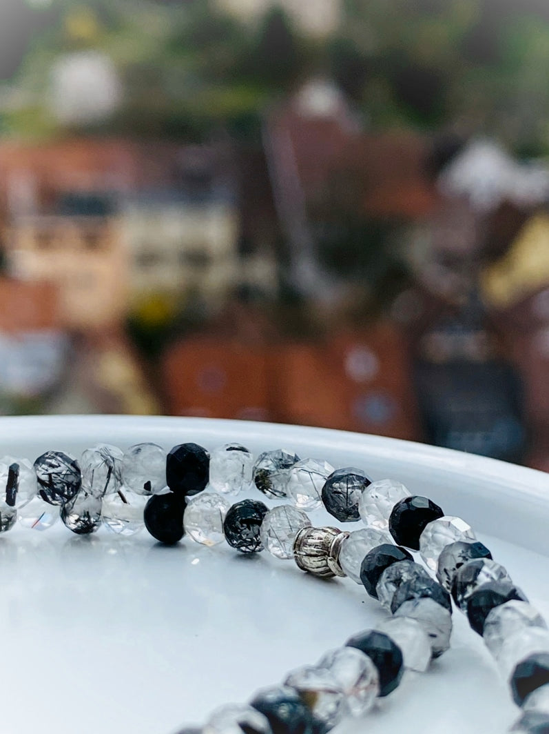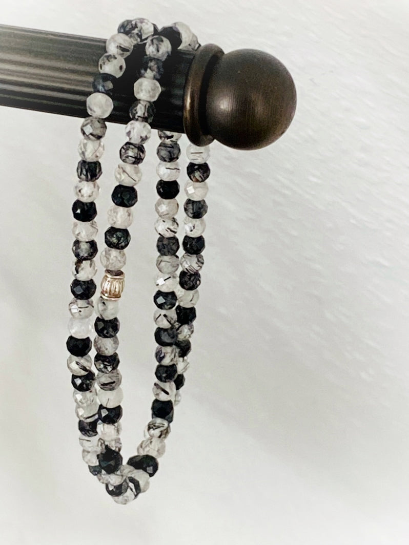 Selten zu finden: Facettierte Turmalinquarz-Perlen, 3mm, mit Silber-Tönnchen als doppeltes Wickelarmband