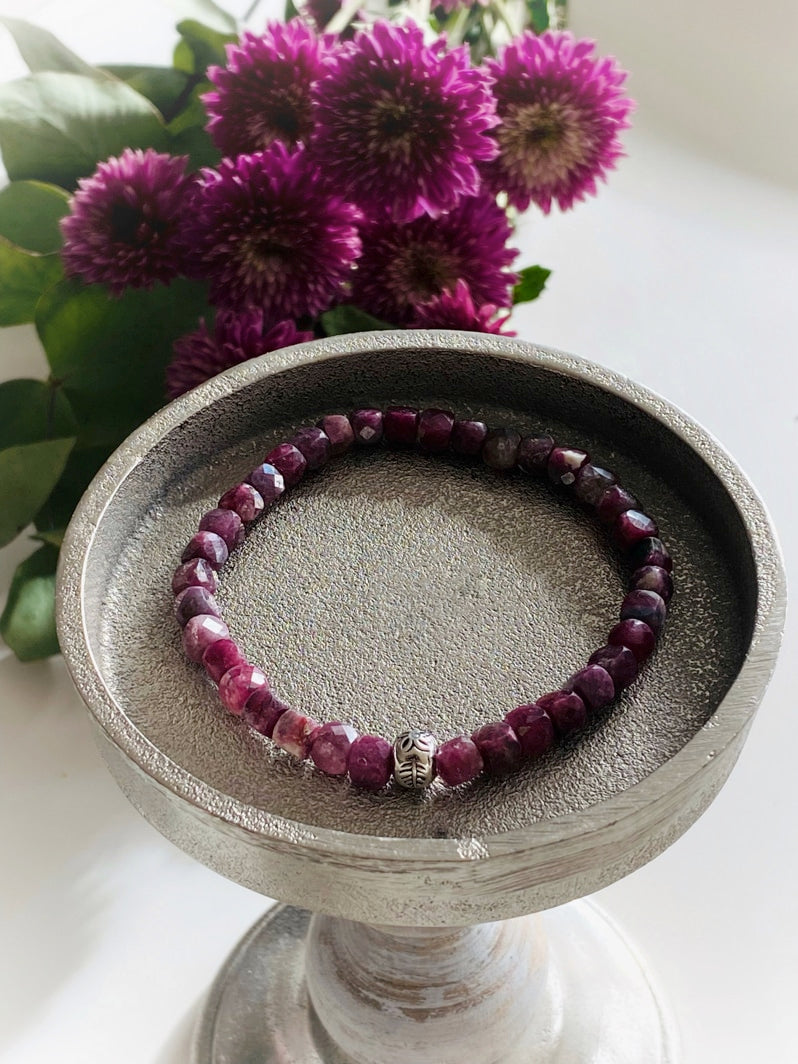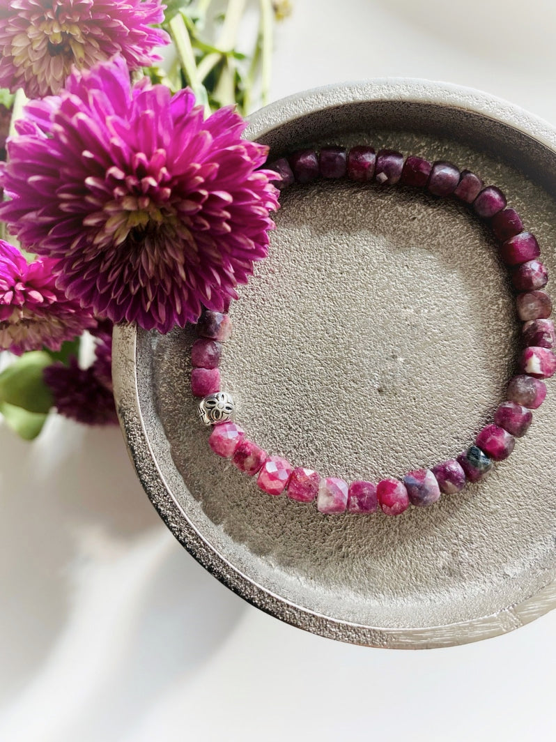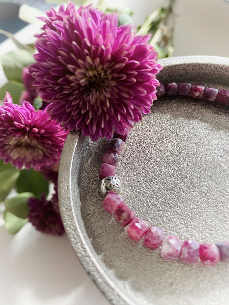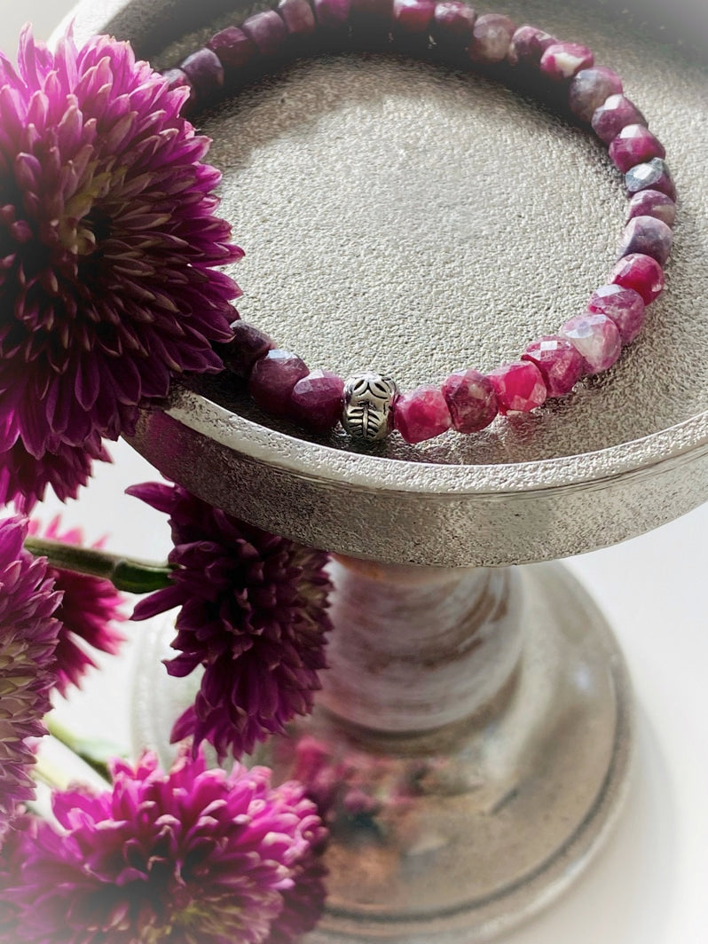 Tolles Armband mit facettierten Würfeln aus rosa Turmalin (4mm) und silberner gravierter Perle aus Thailand