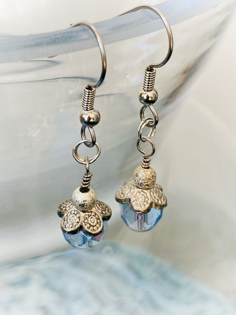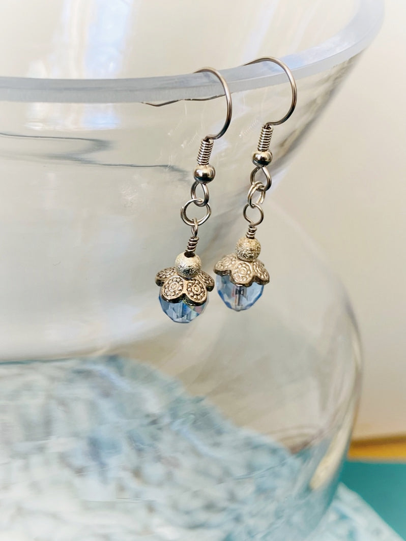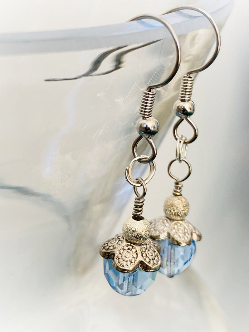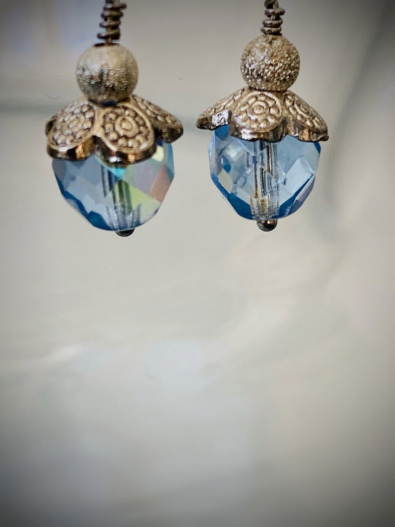 Traumhaft schöne silberne Ohrringe mit Anhängern aus facettierten böhmischen hellblauen Glasperlen